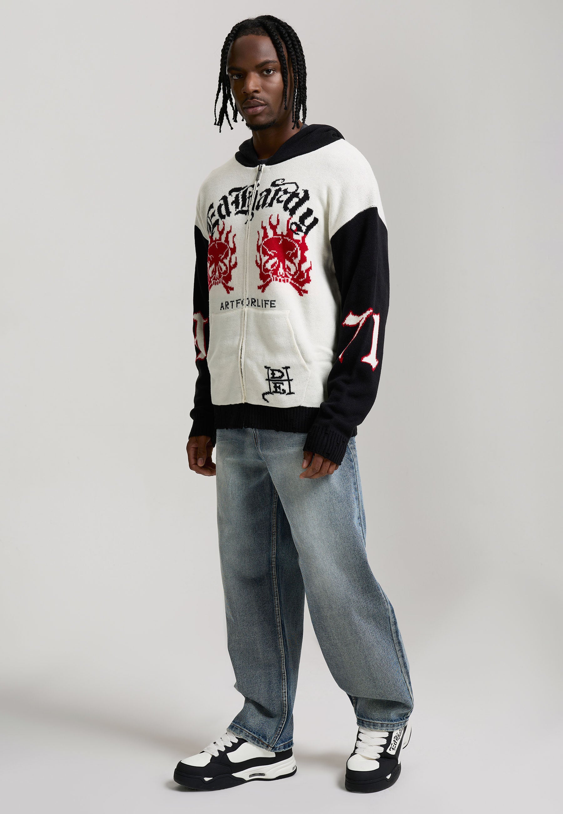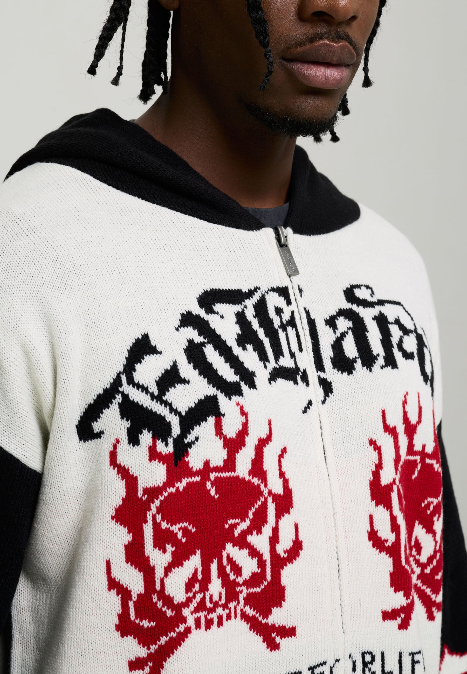 Mens 1971 Knitted Zip Thru Knitted Hoodie - Ecru / Black