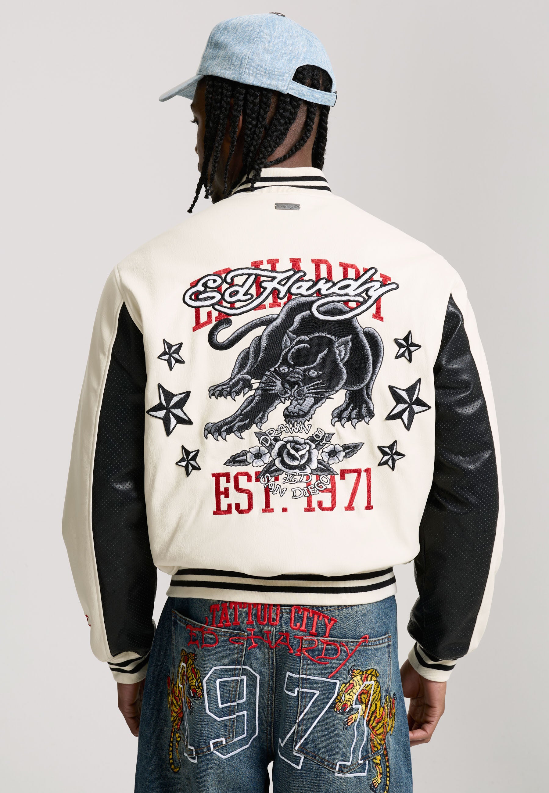 Mens 1971 Panther Pu Varsity Bomber - Ecru / Black