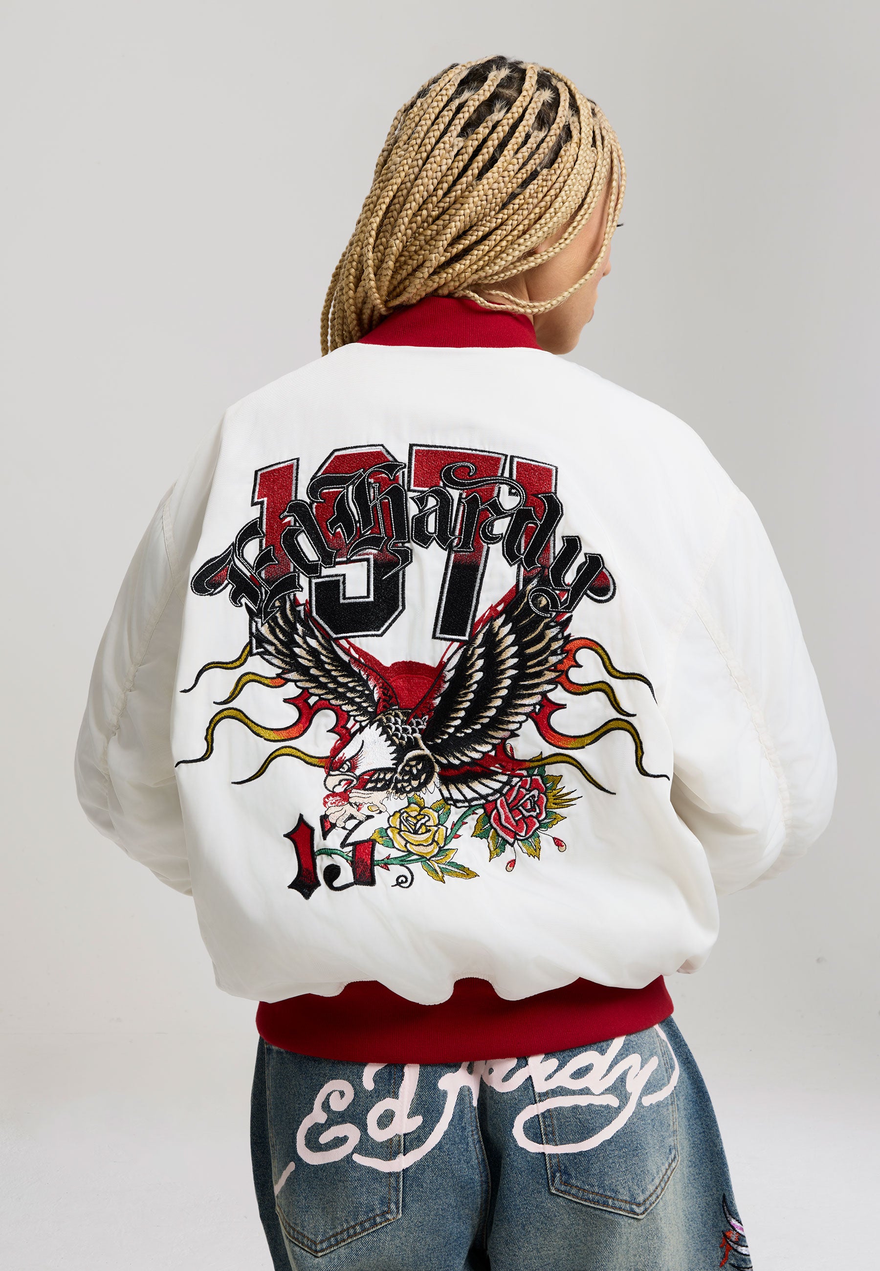 Womens Gothic Flaming Eagle Relaxed Bomber Jacket - Ecru