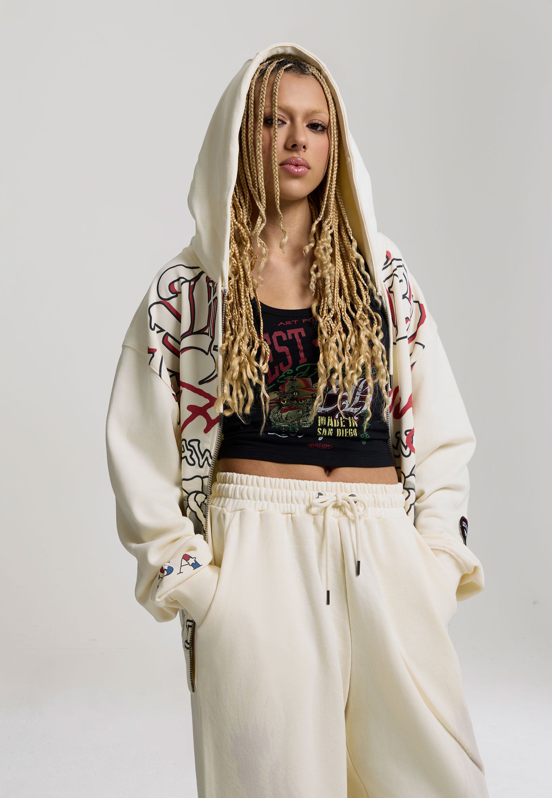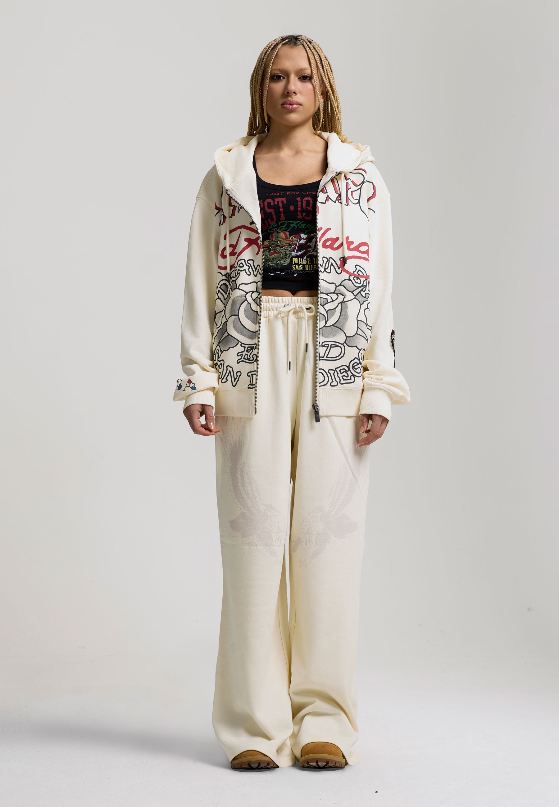 Womens Gothic Roses Relaxed Zip Thru Hoodie - Ecru