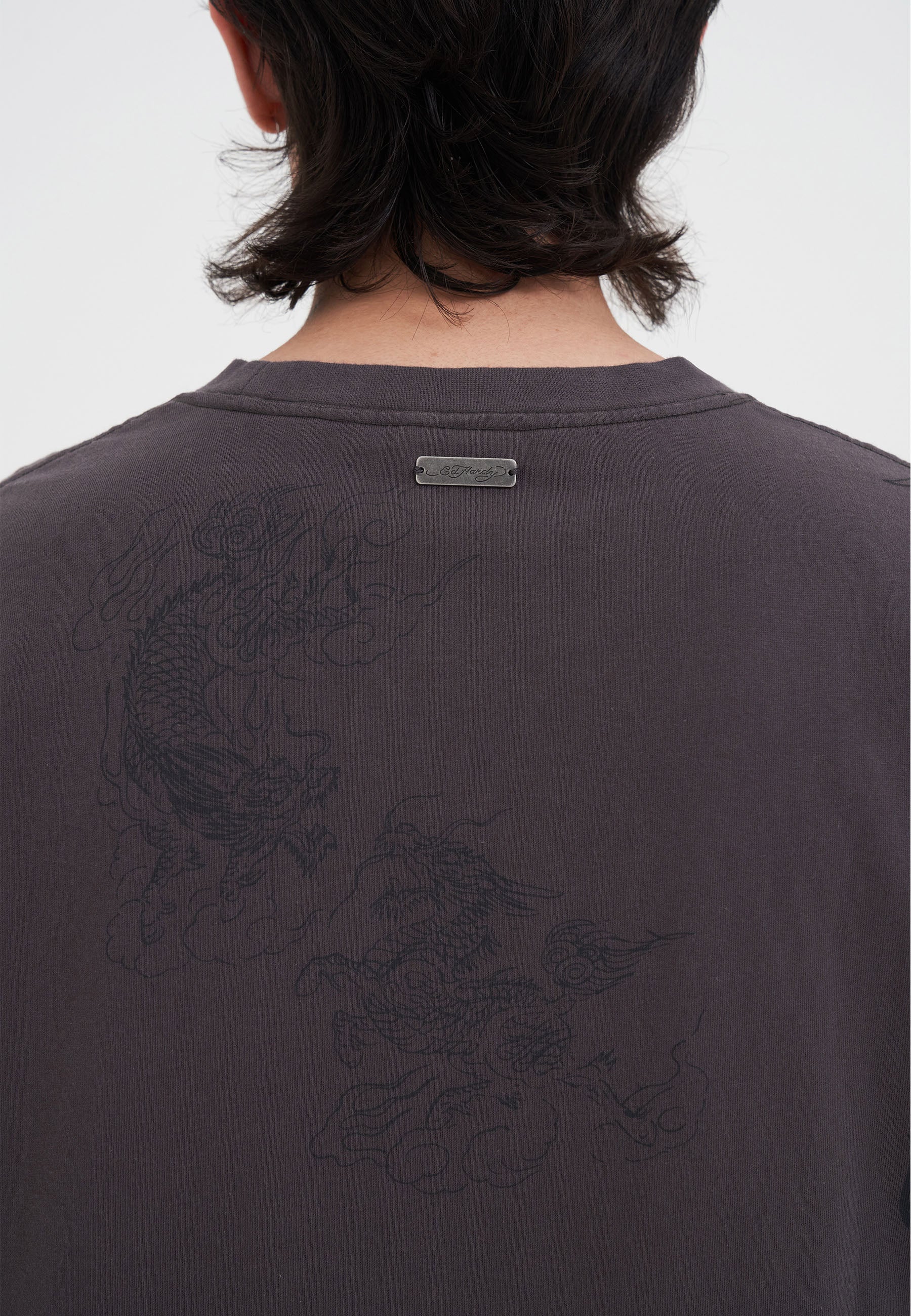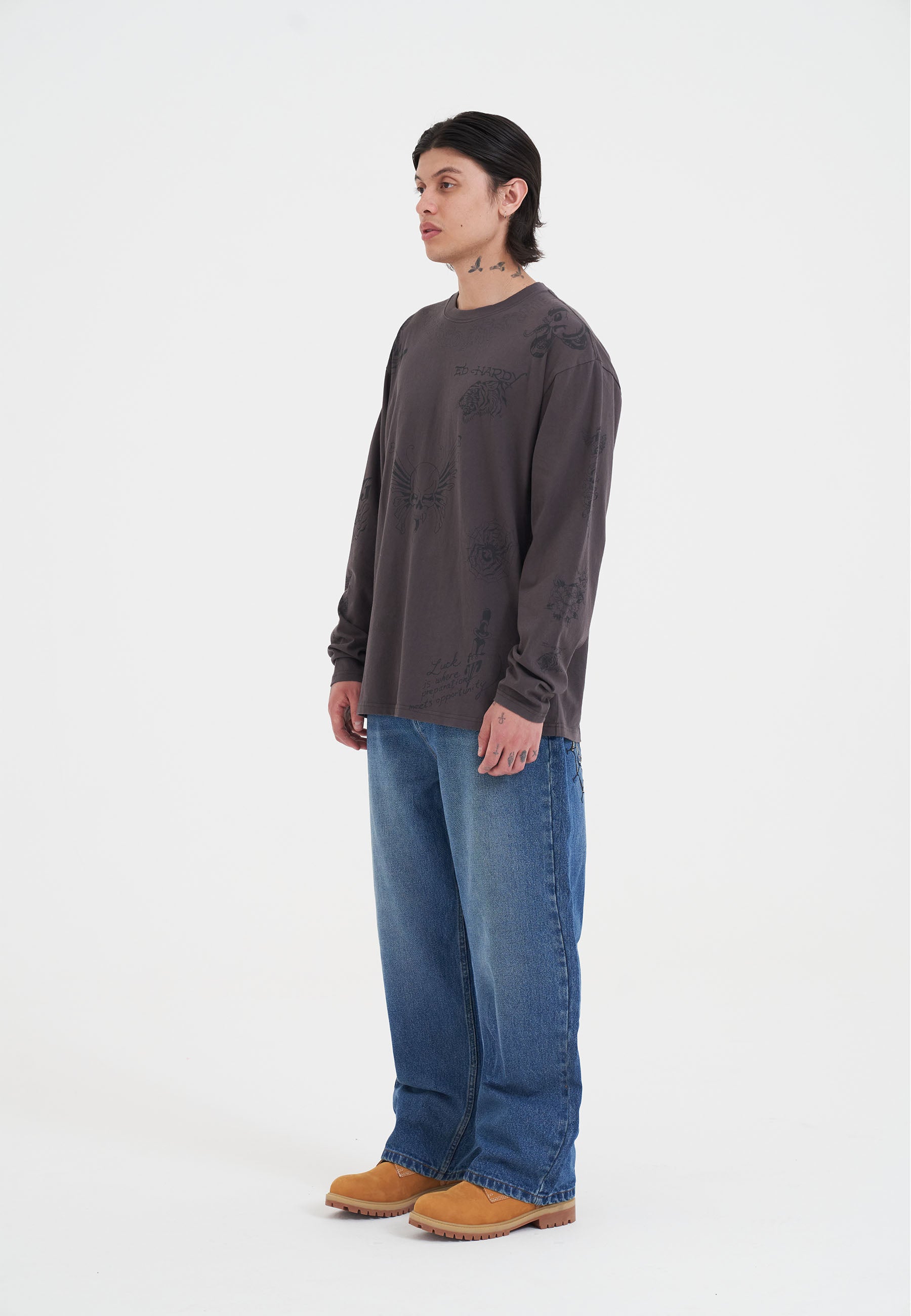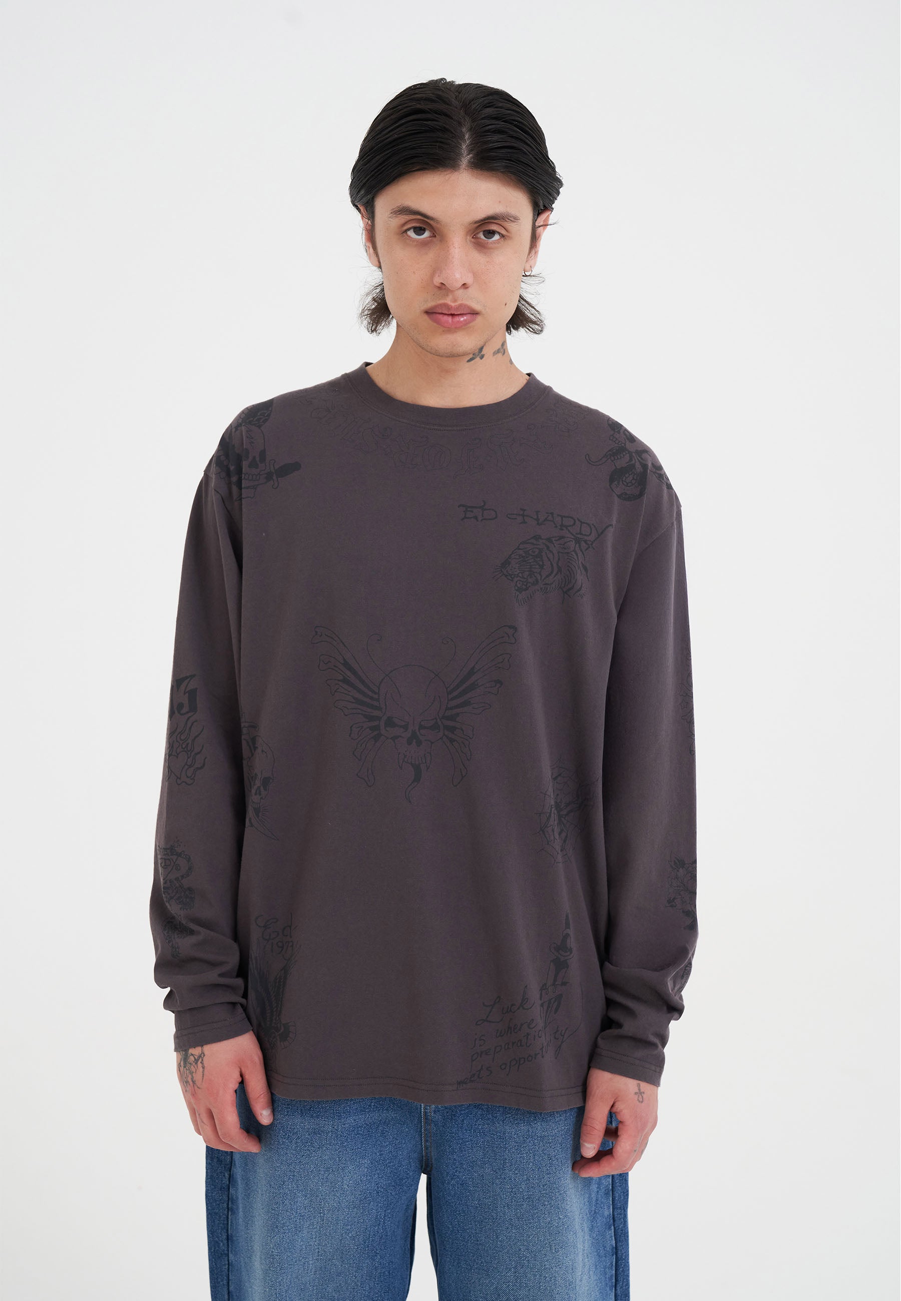 Mens Multi Tattoo Ed Hardy Long Sleeve T-Shirt - Charcoal