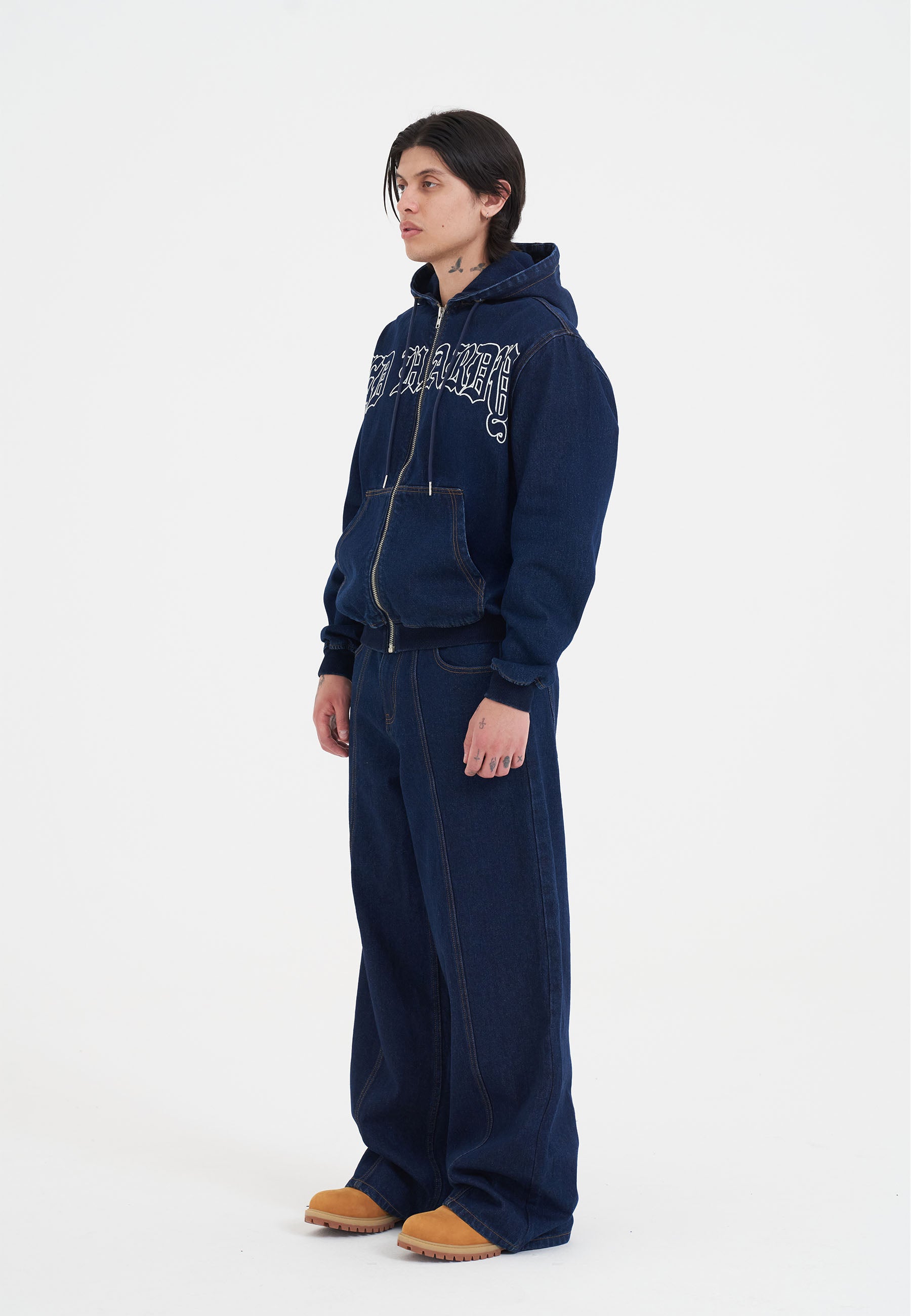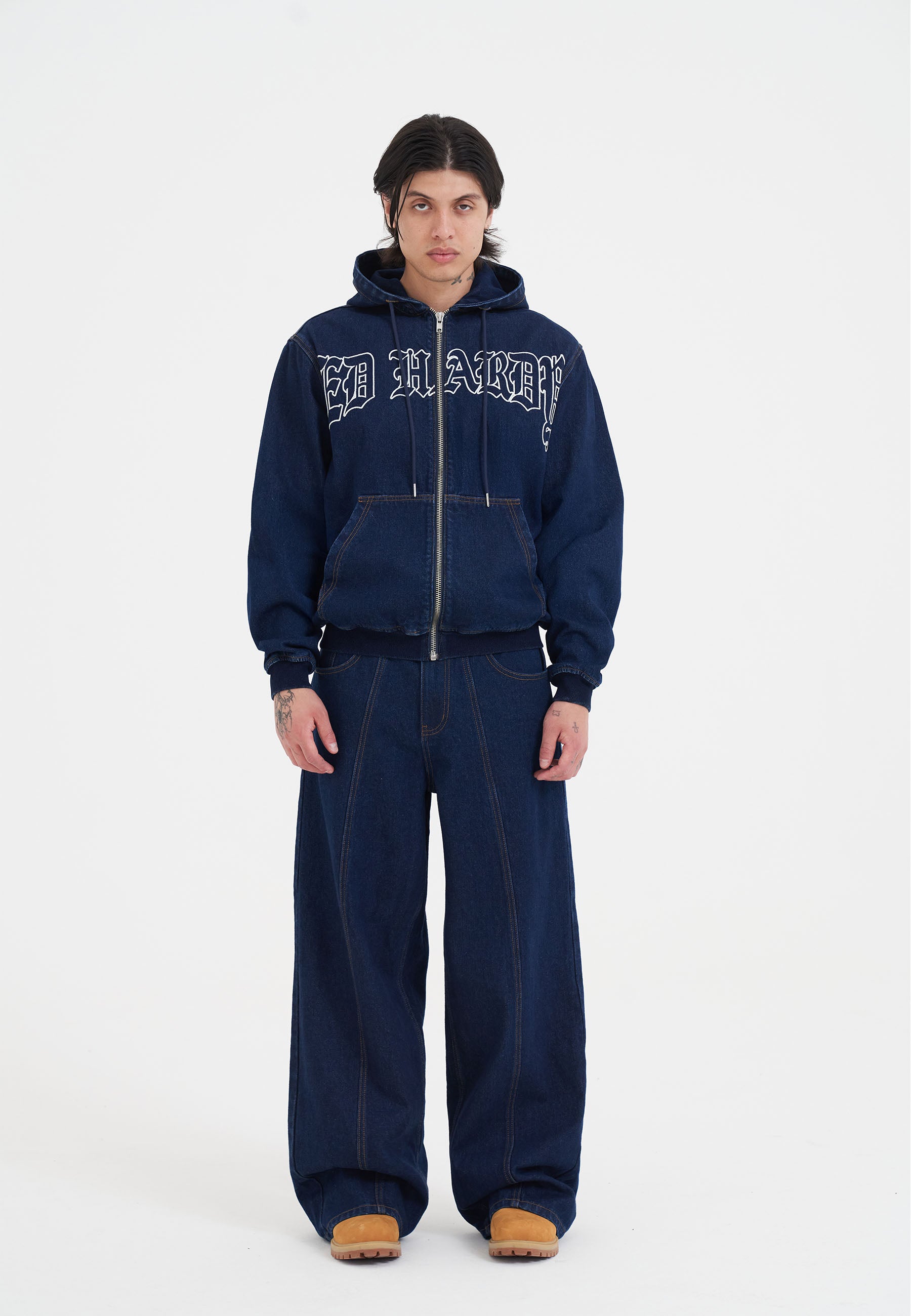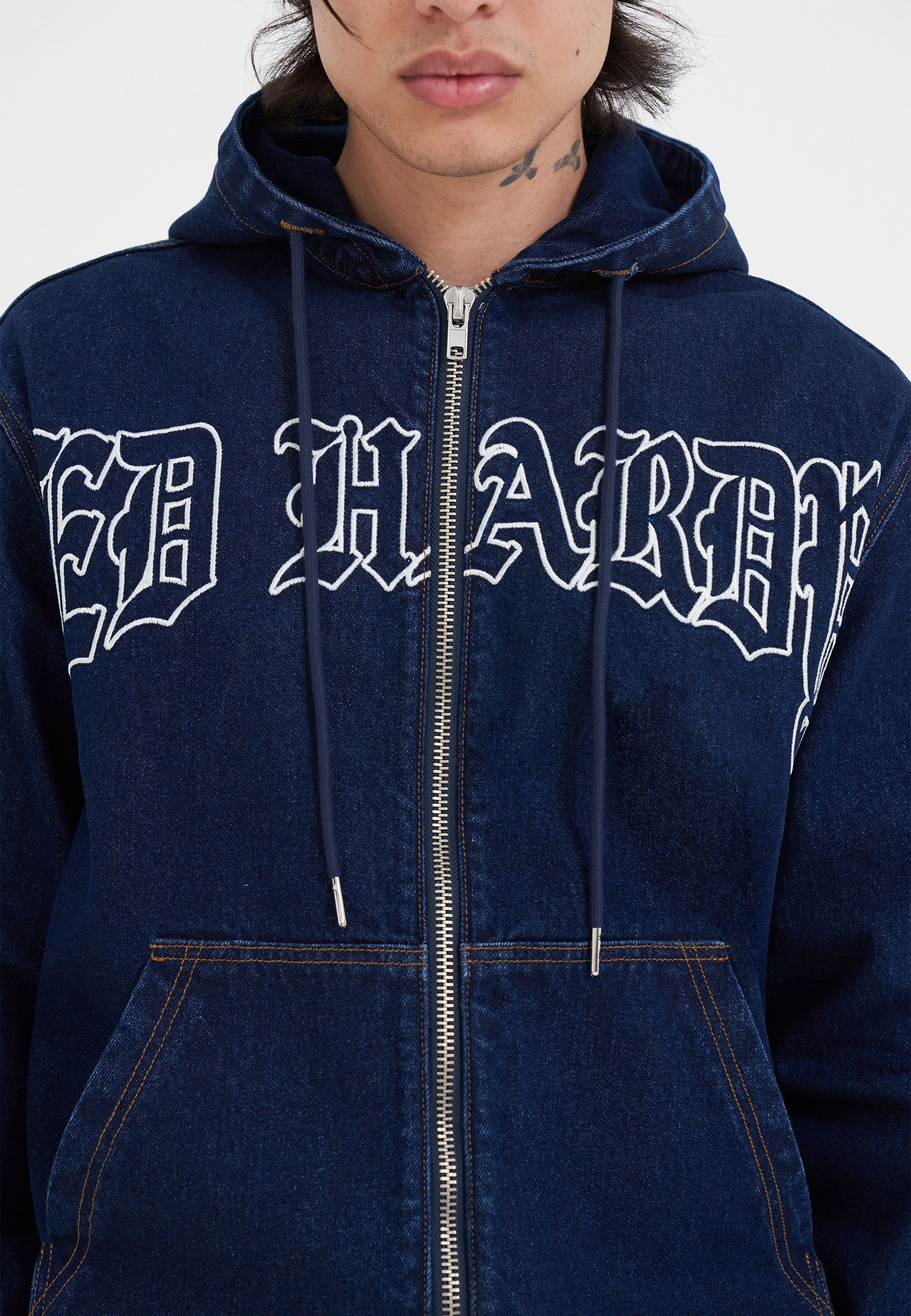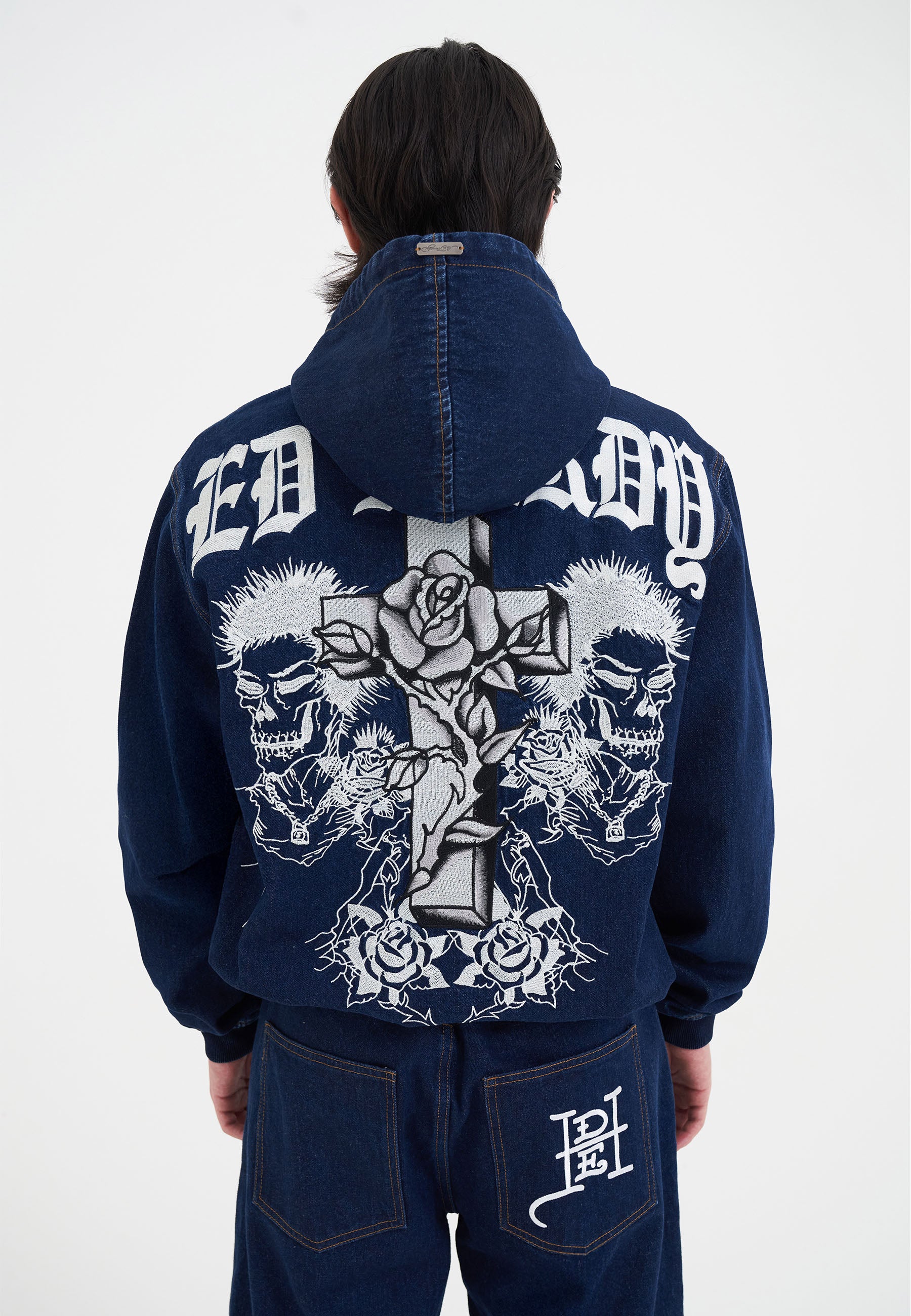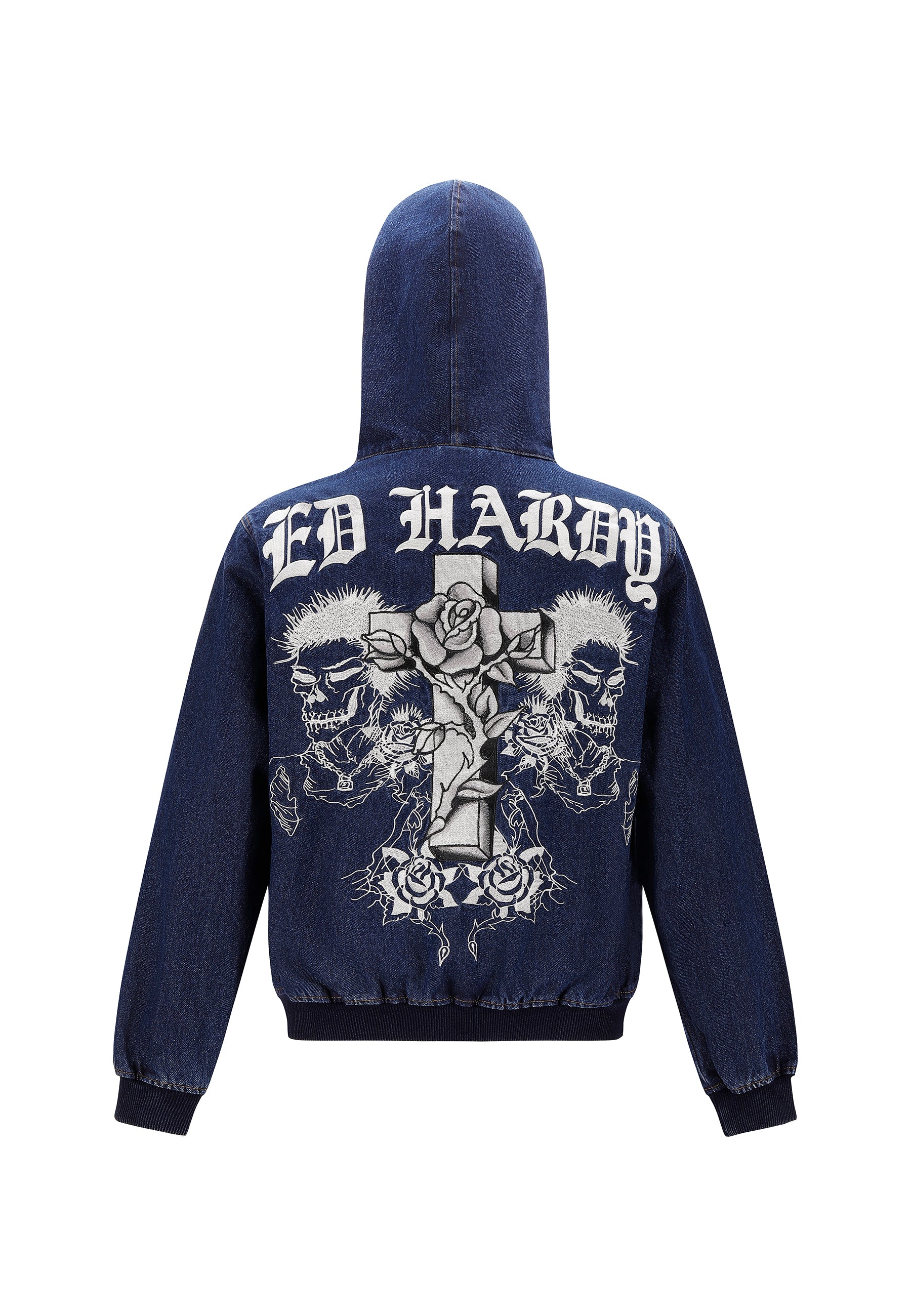 Mens Flaming Cross Denim Zip Thru Hoodie - Indigo