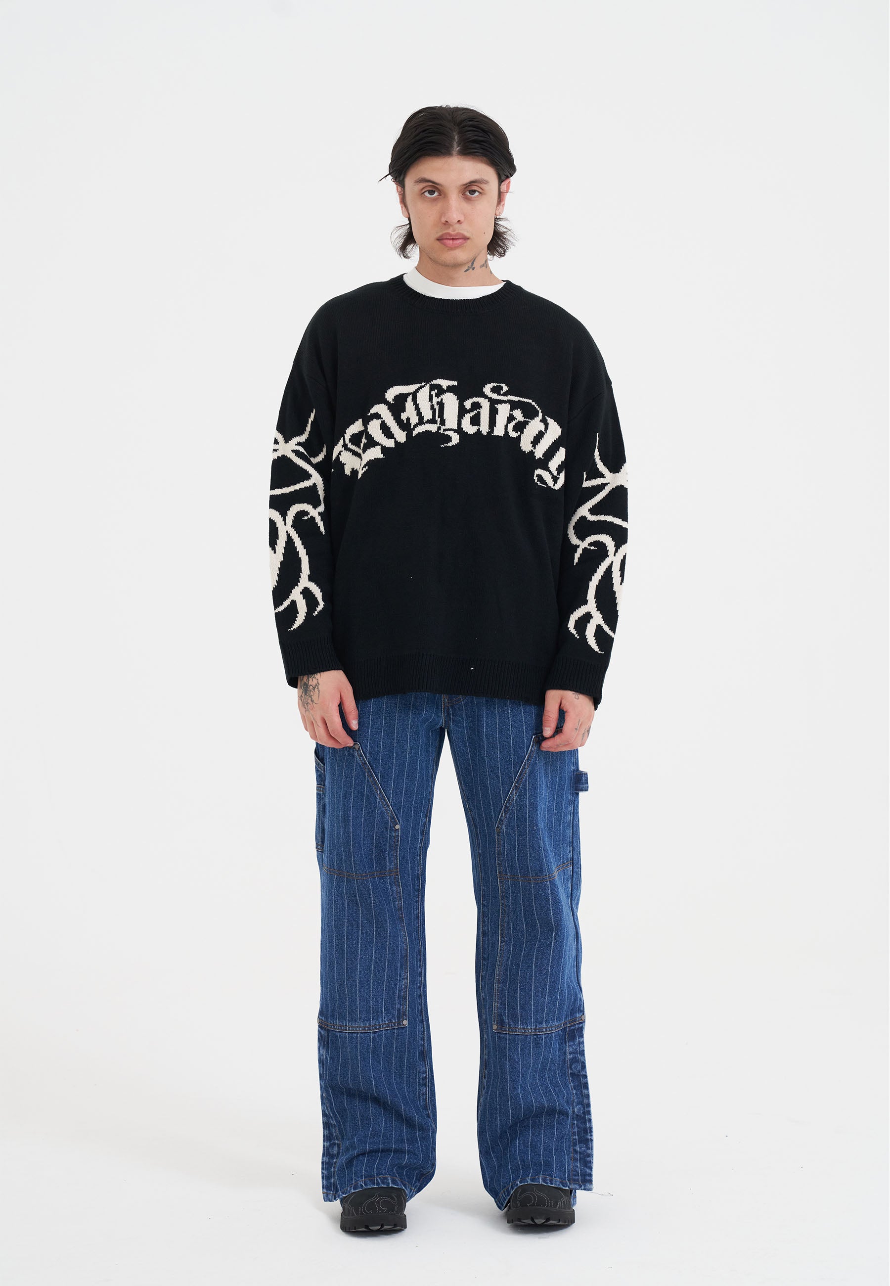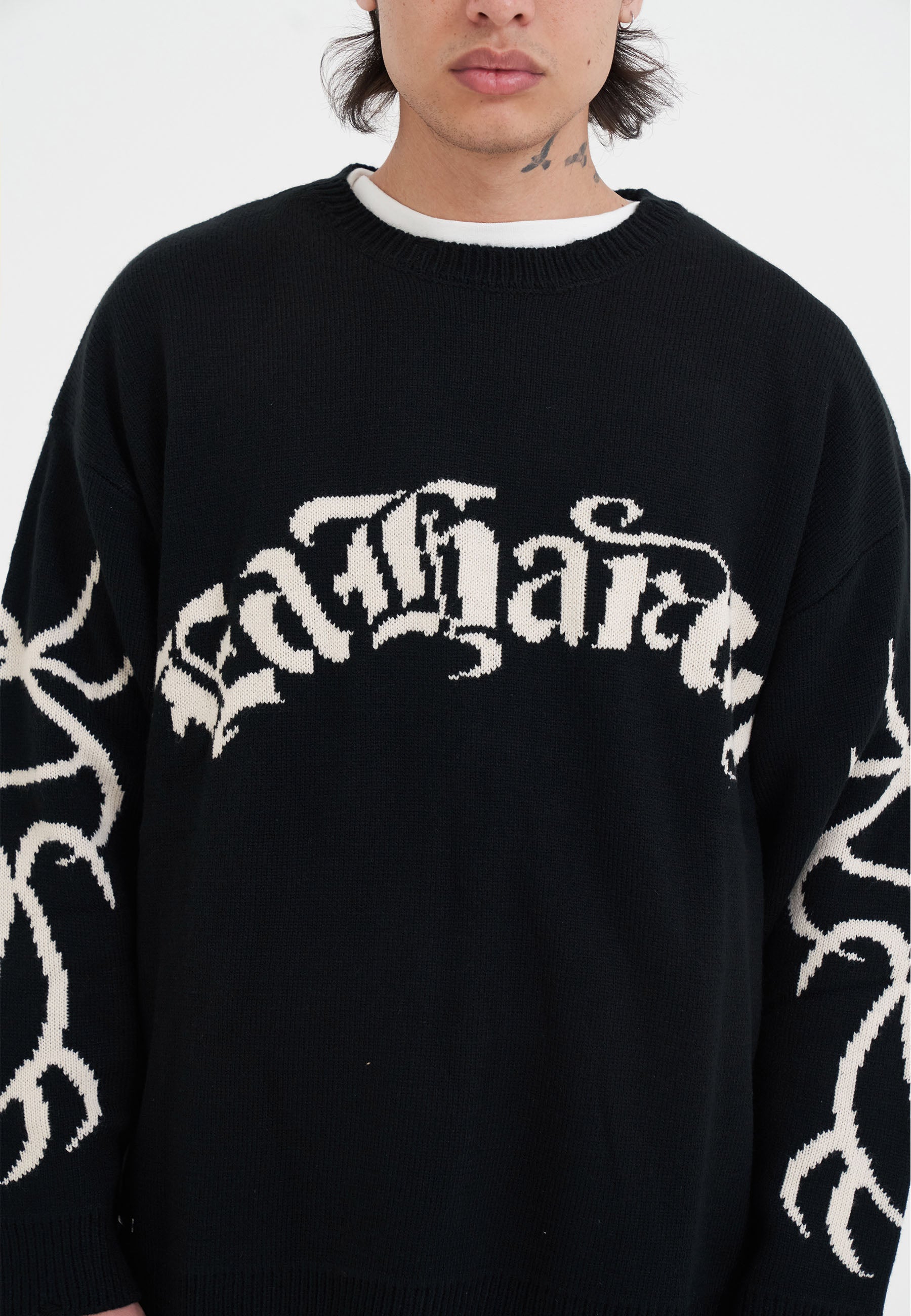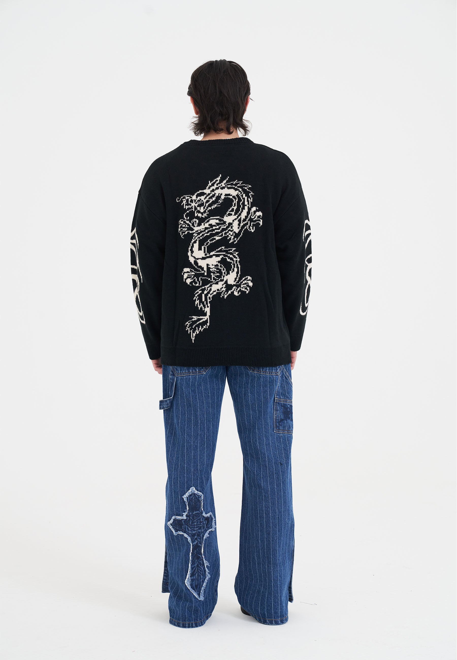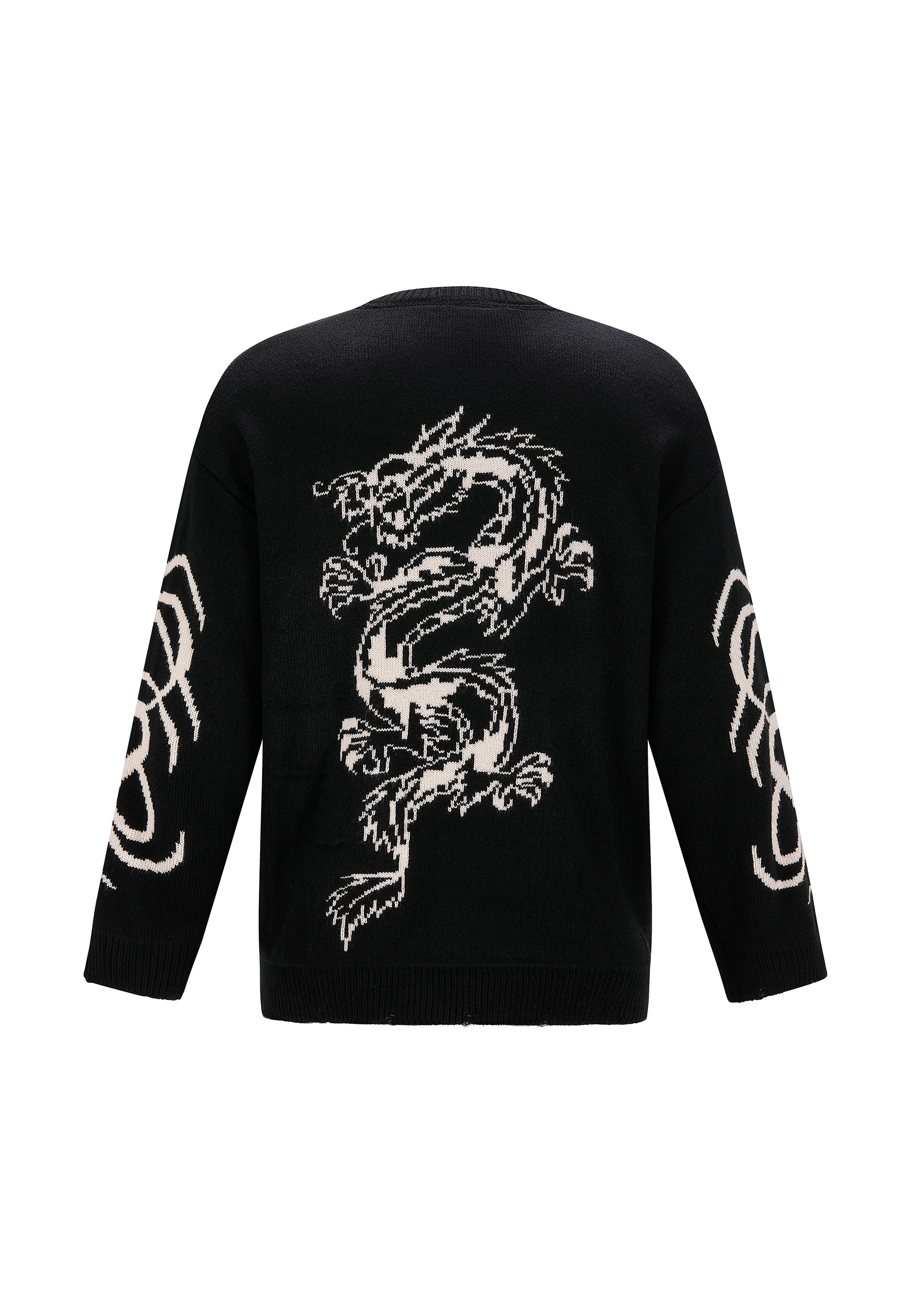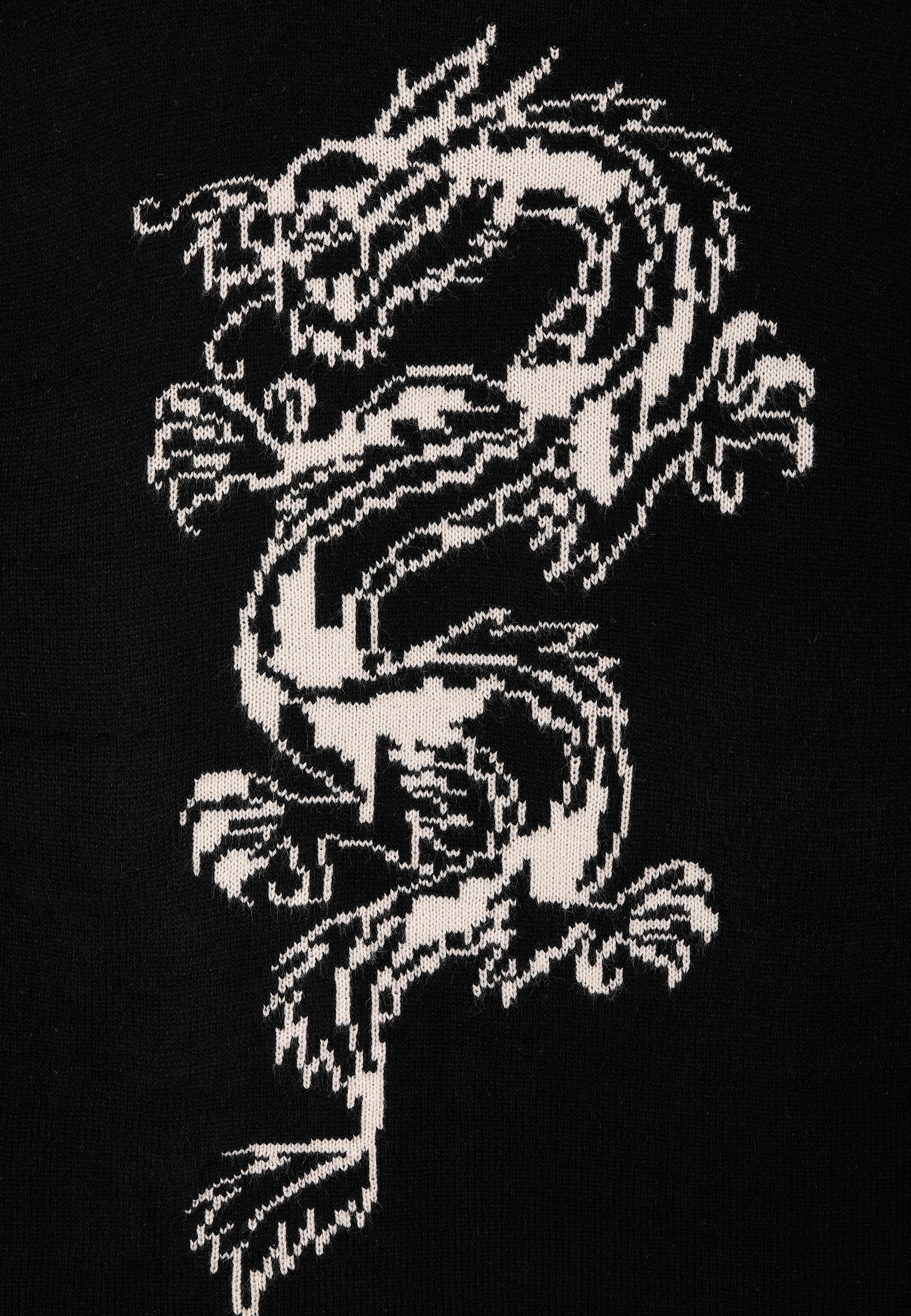 Mens Intarsia Tattoo Dragon Knitted Crew Jumper - Black