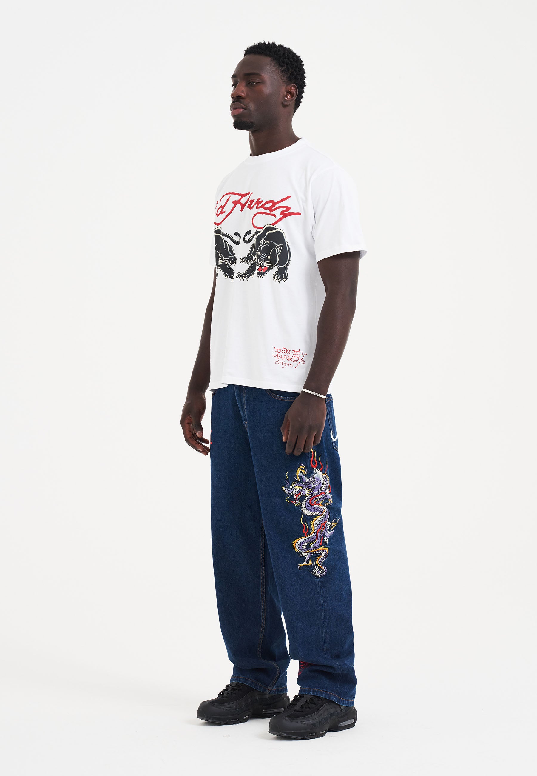 Mens Panther-Crouch-Leap Tattoo Graphic Relaxed Denim Trousers Jeans - Indigo