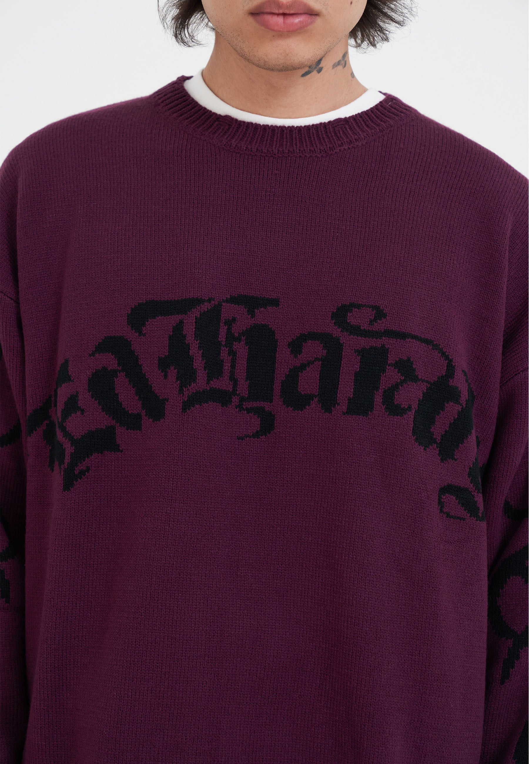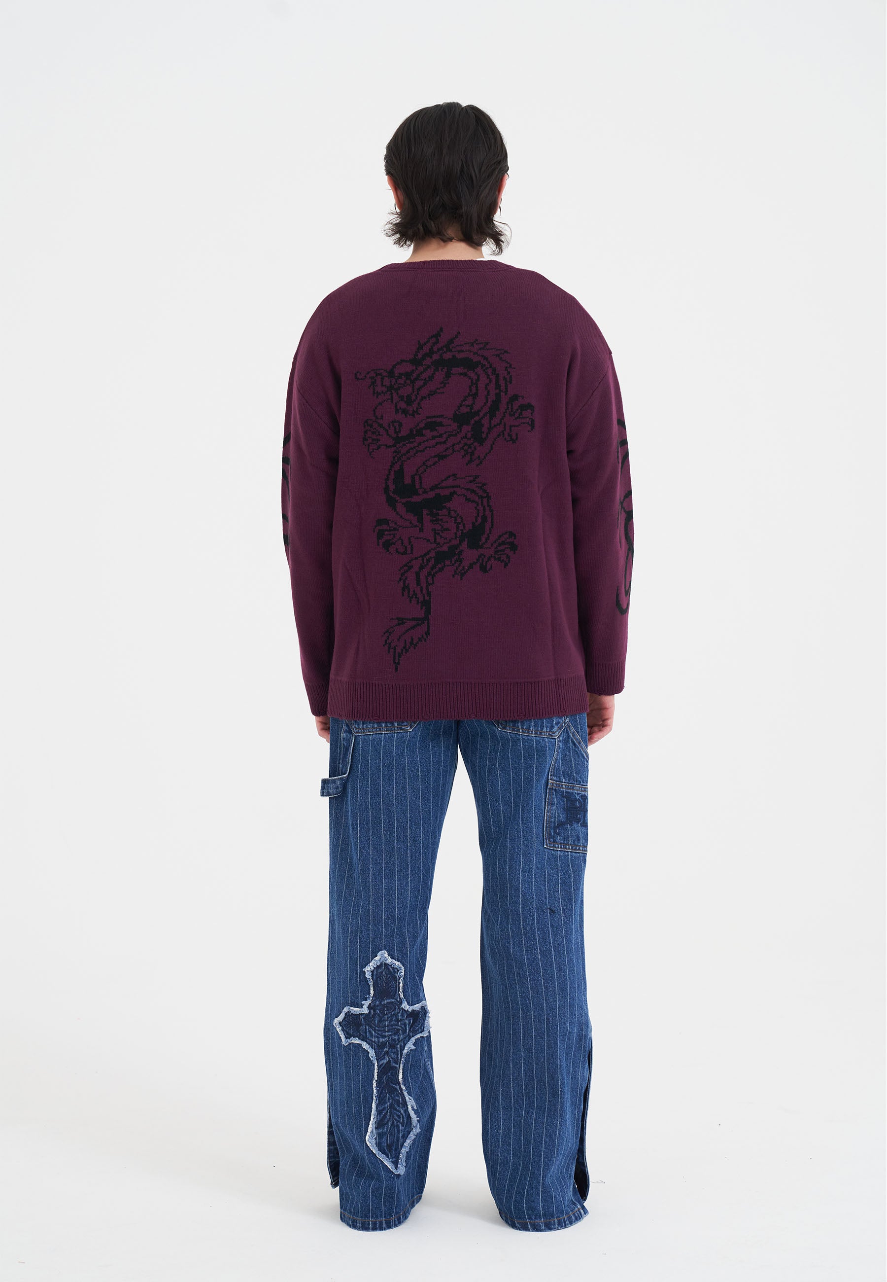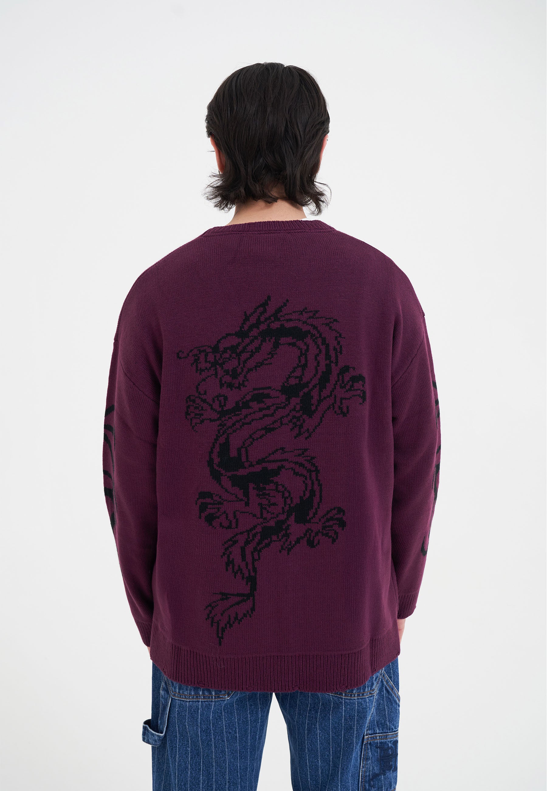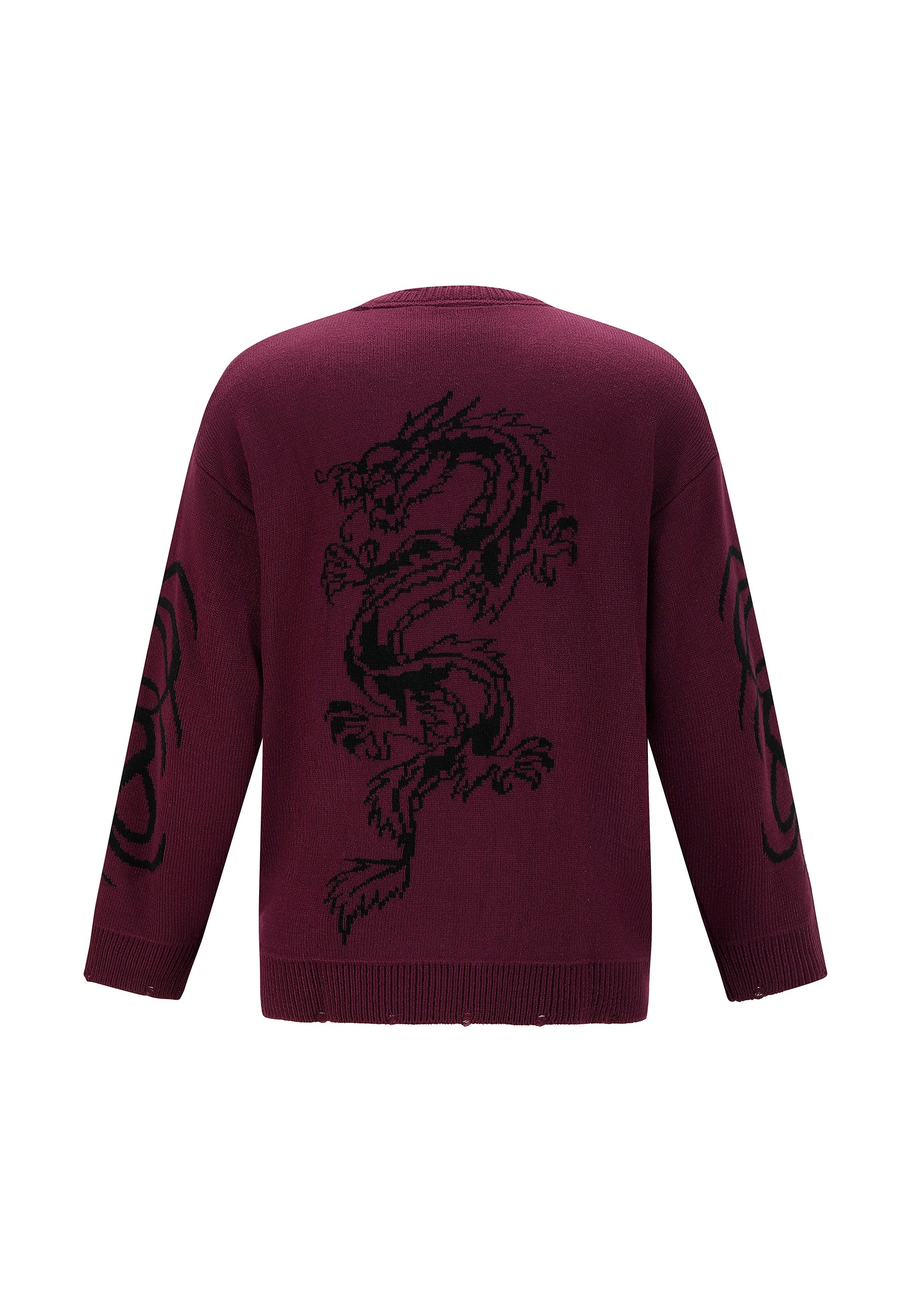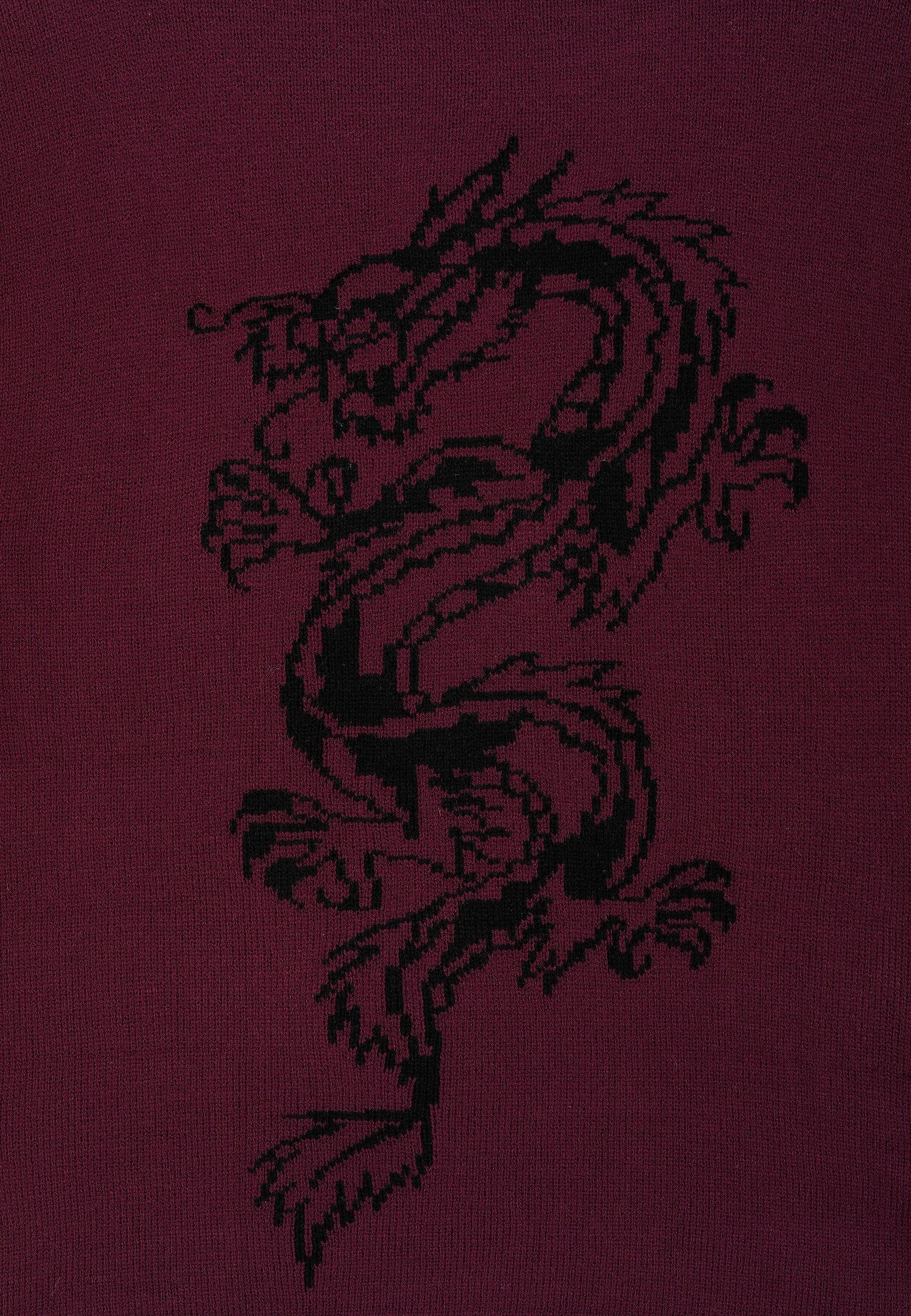 Mens Intarsia Tattoo Dragon Knitted Crew Jumper - Burgundy