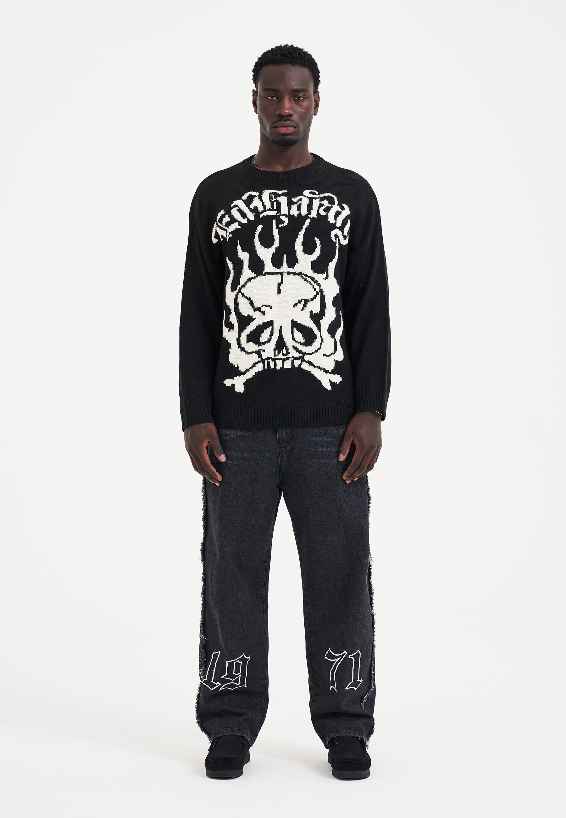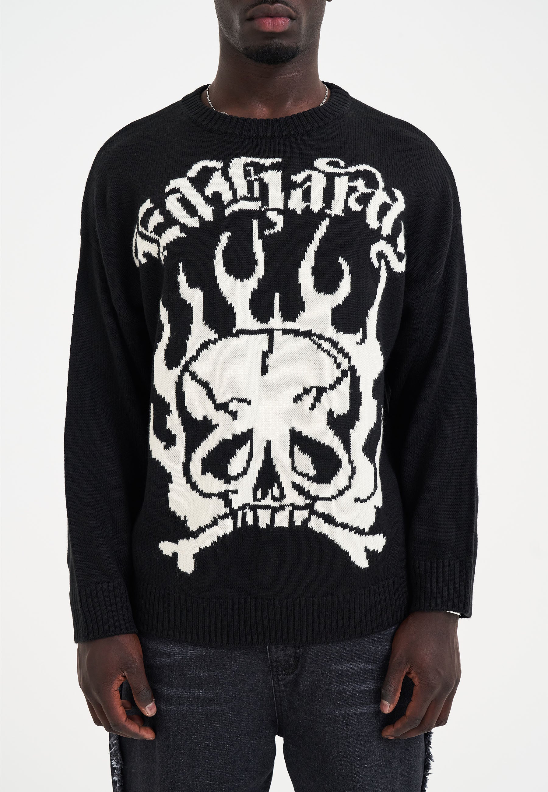 Mens Skull In Flames Jaquard Knitted Jumper - Black/Off White
