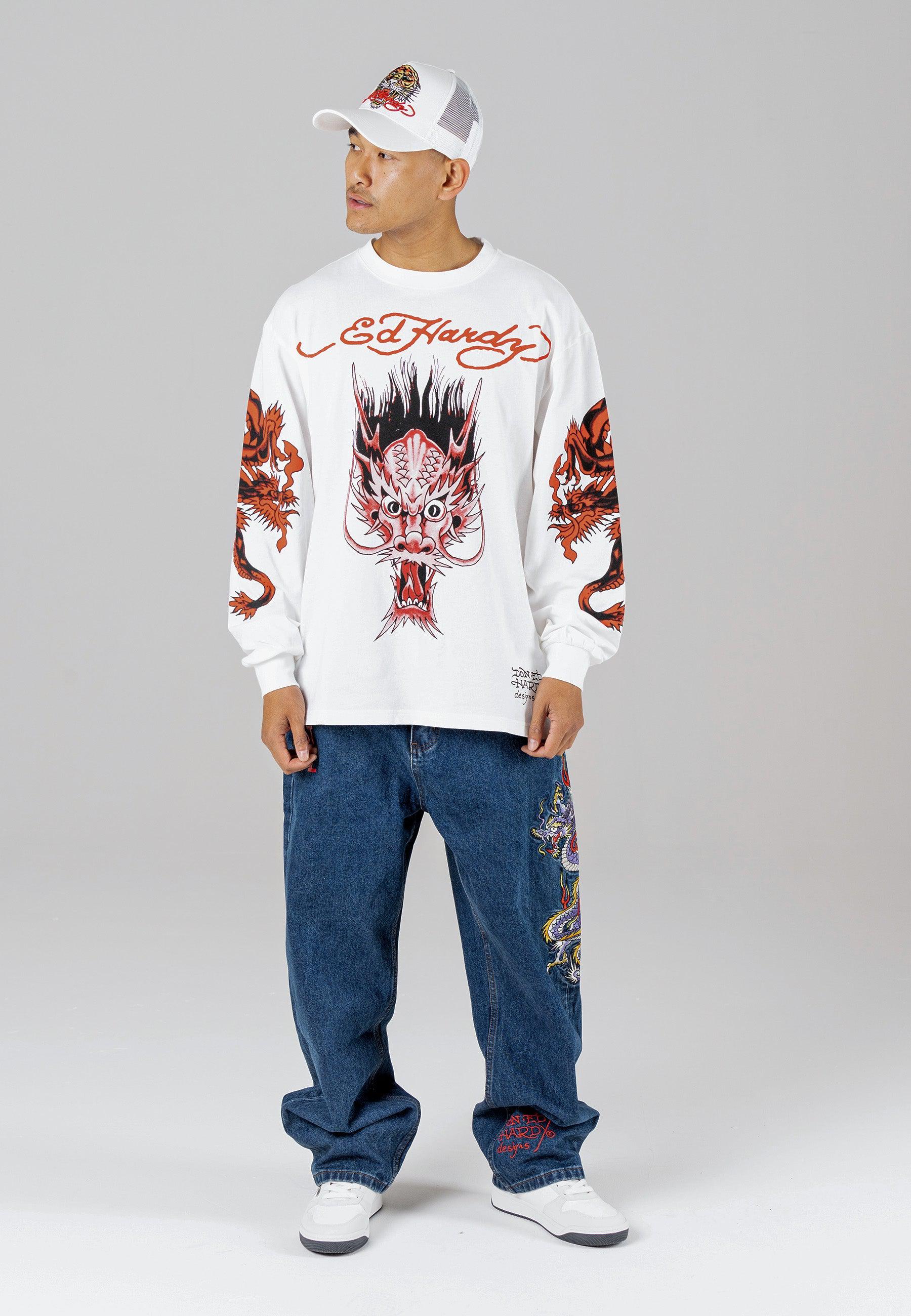 Mens Red-Dragon Long Sleeve T-Shirt - White