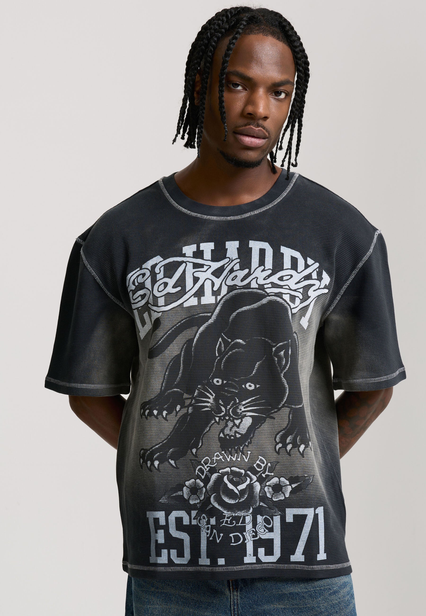 Mens Washed Waffle Panther Graphic Relaxed T-Shirt - Black