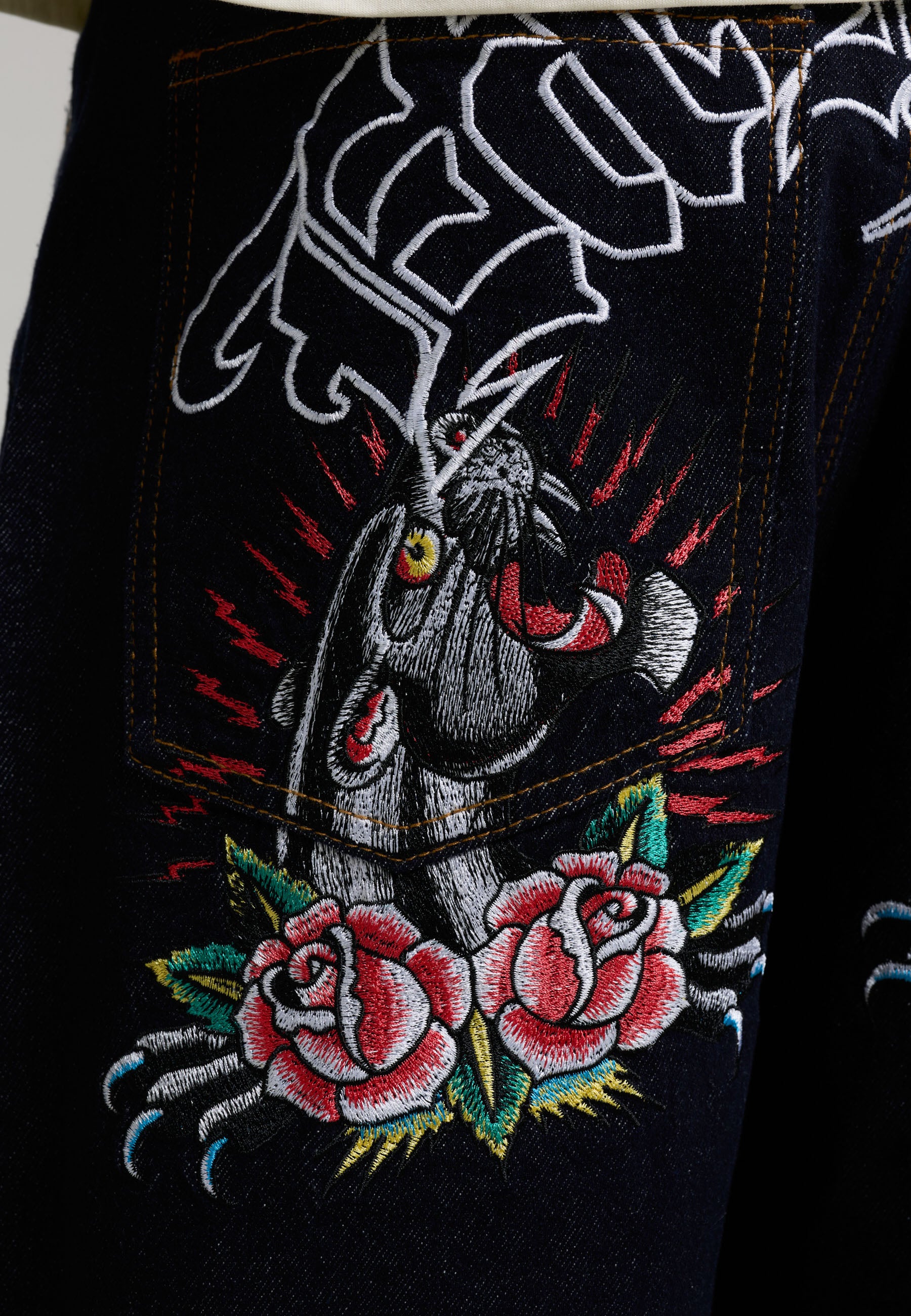 Mens Golden-Eagle Tattoo Graphic Denim Trousers Jeans - Indigo