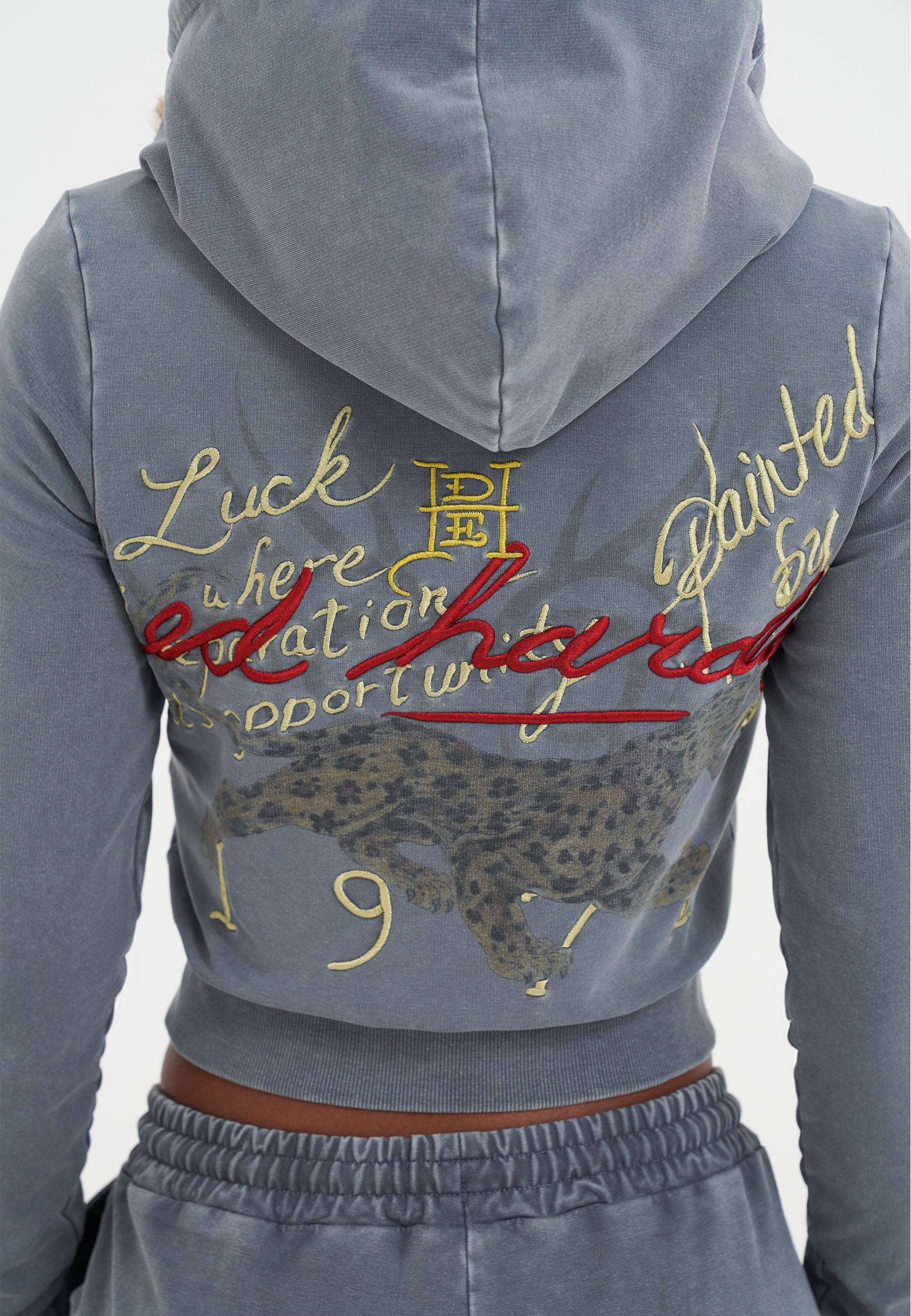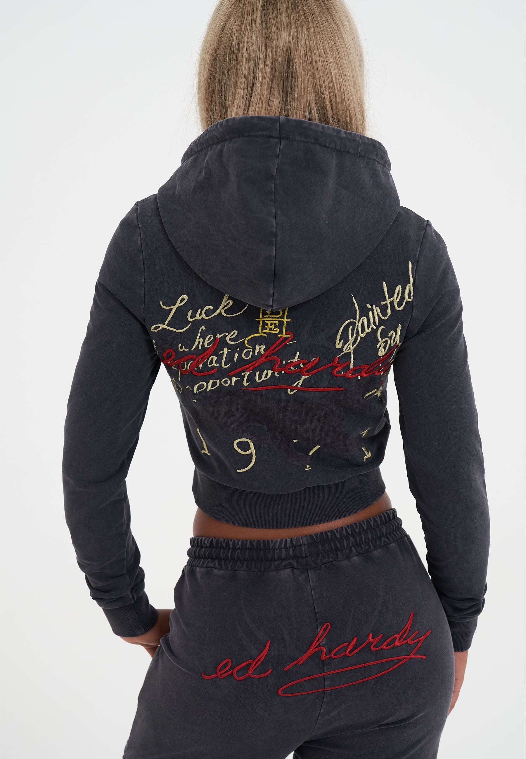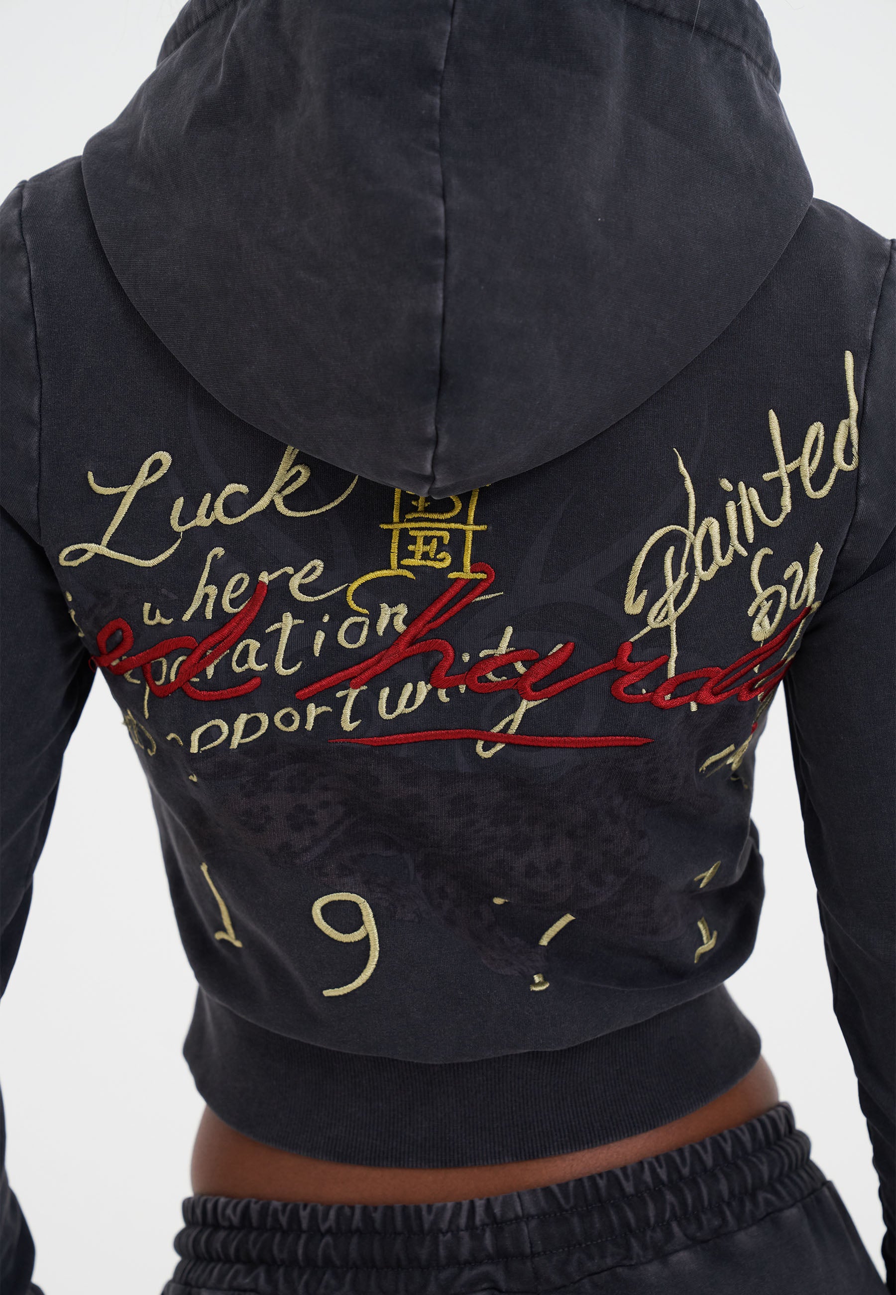 Womens Flaming Tiger Cropped Zip Thru Hoodie - Charcoal