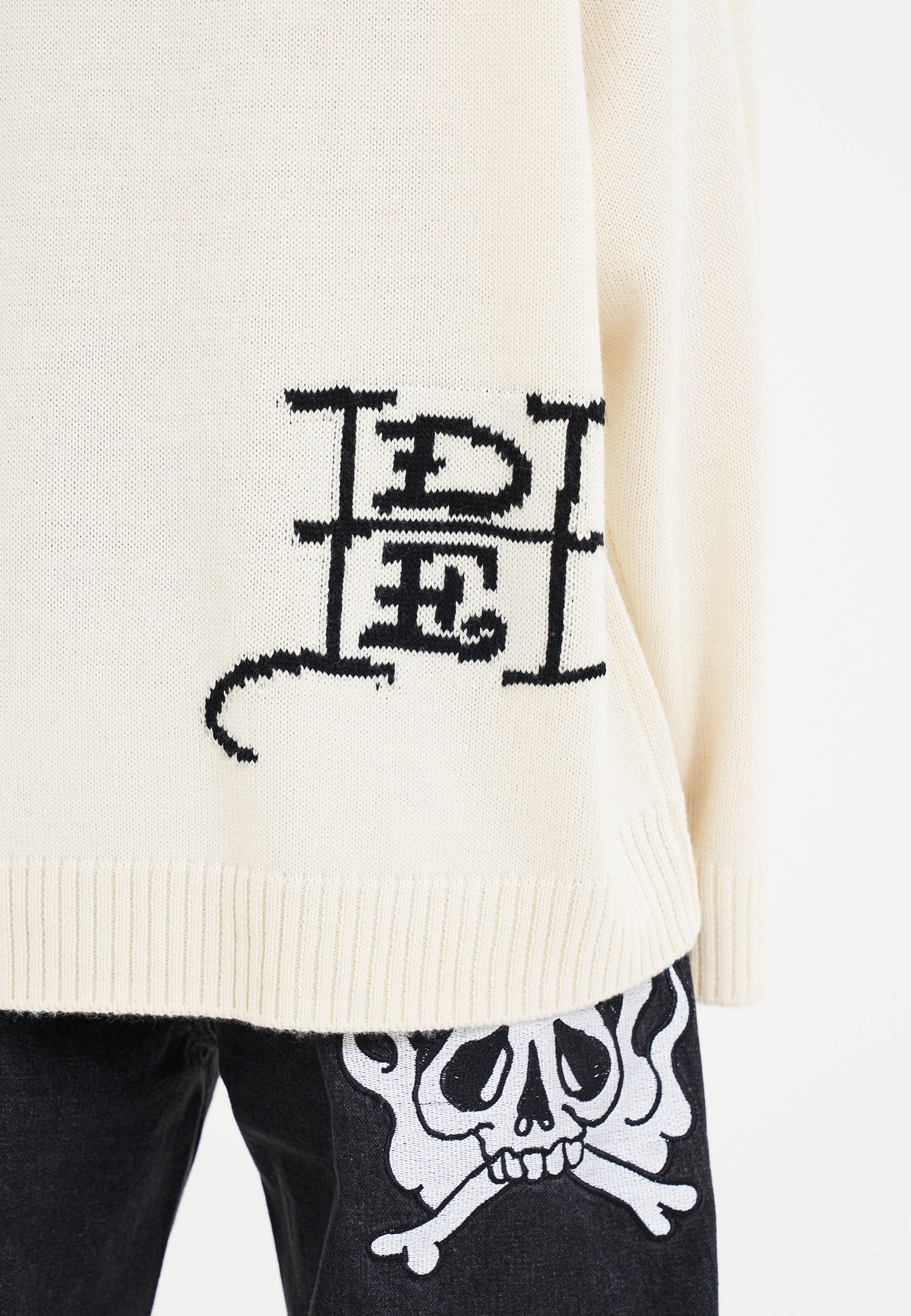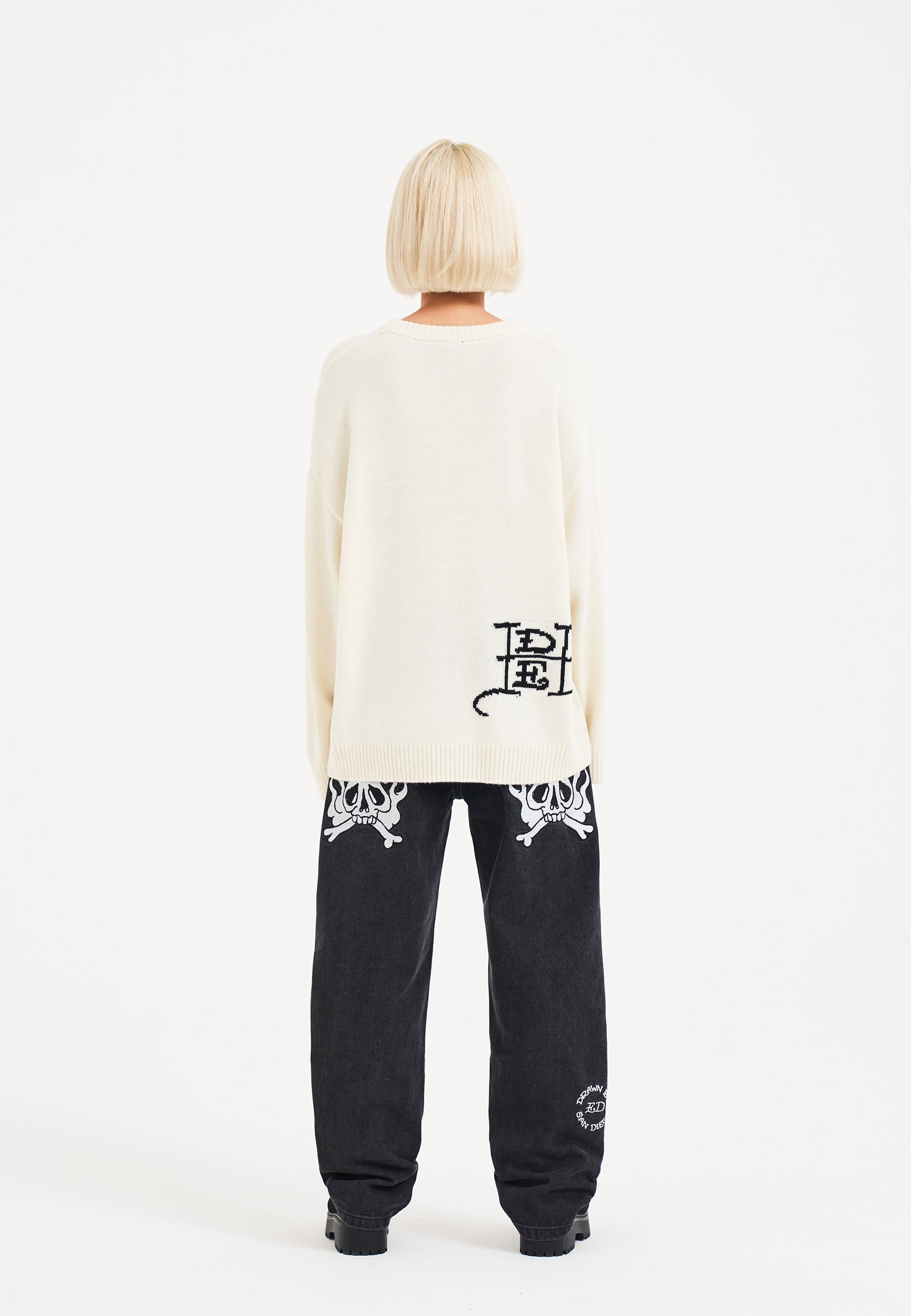 Womens Skull And Roses Distressed Knitted Jumper - Ecru