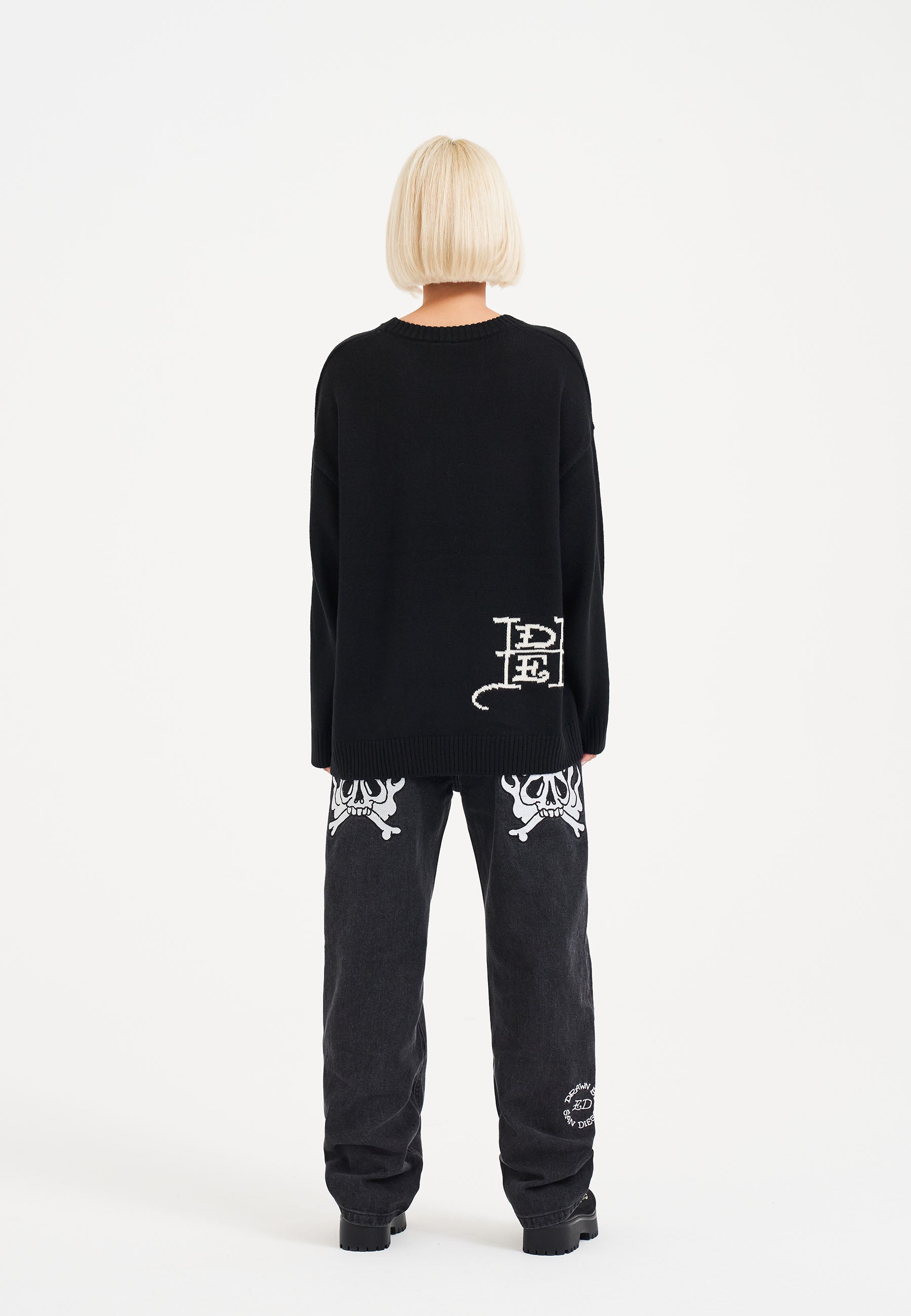 Womens Skull And Roses Distressed Knitted Jumper - Black