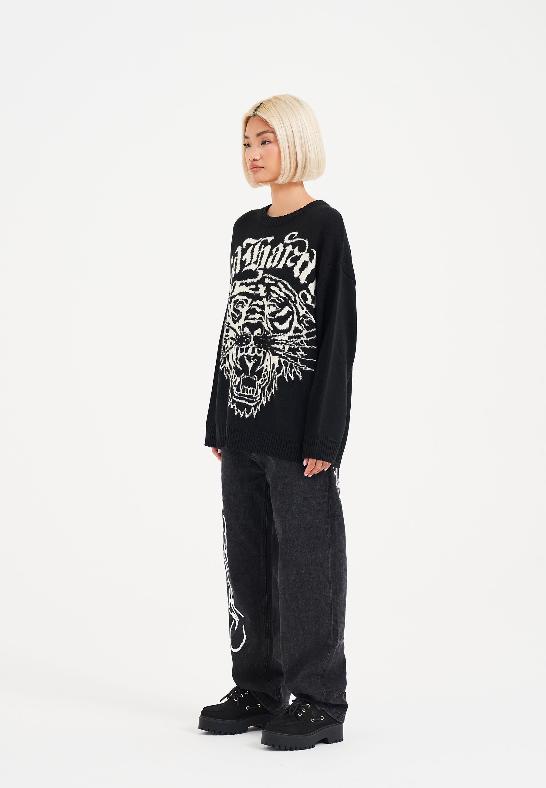 Womens Tiger-Roar Jaquard Knitted Jumper - Black/Off White