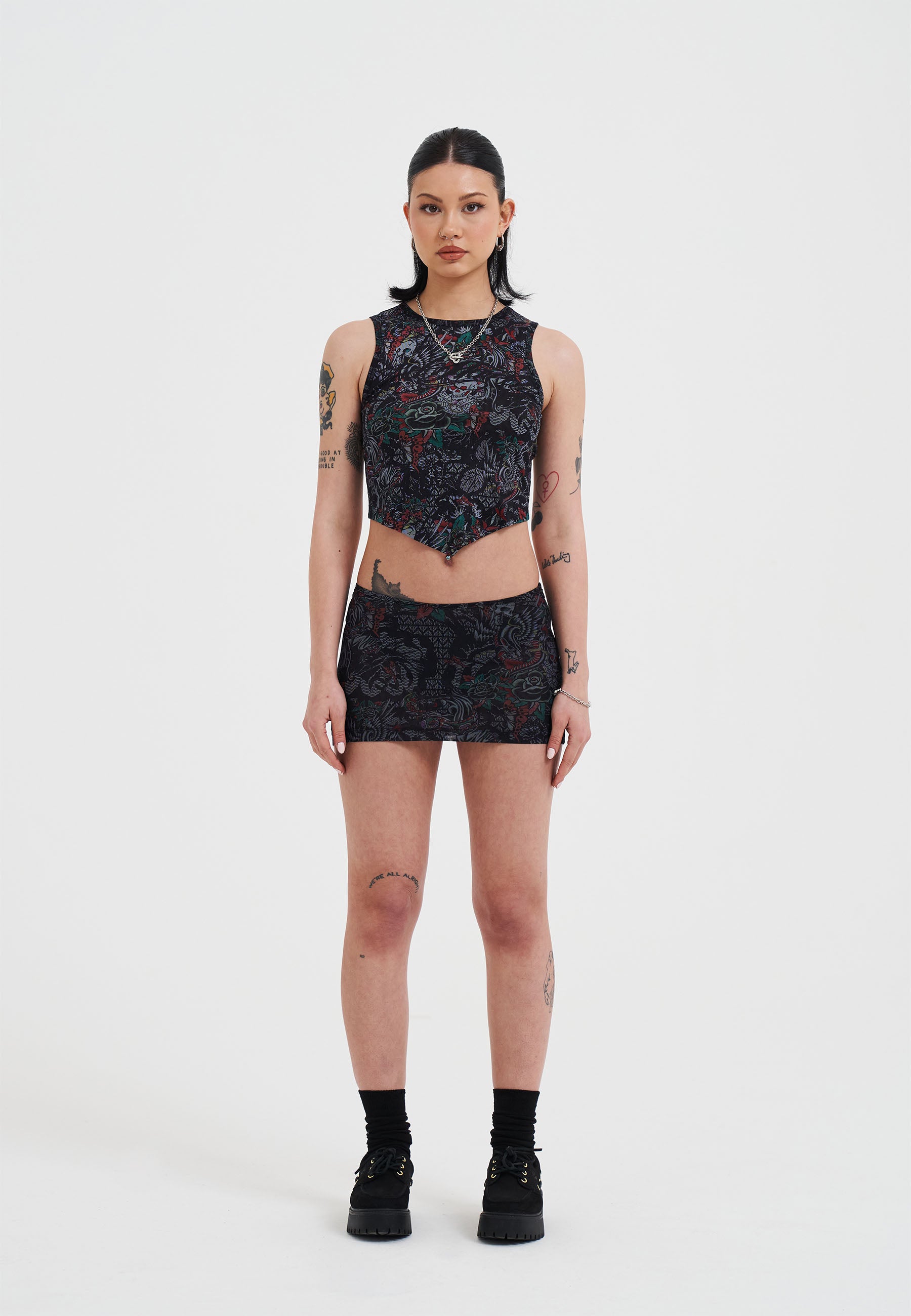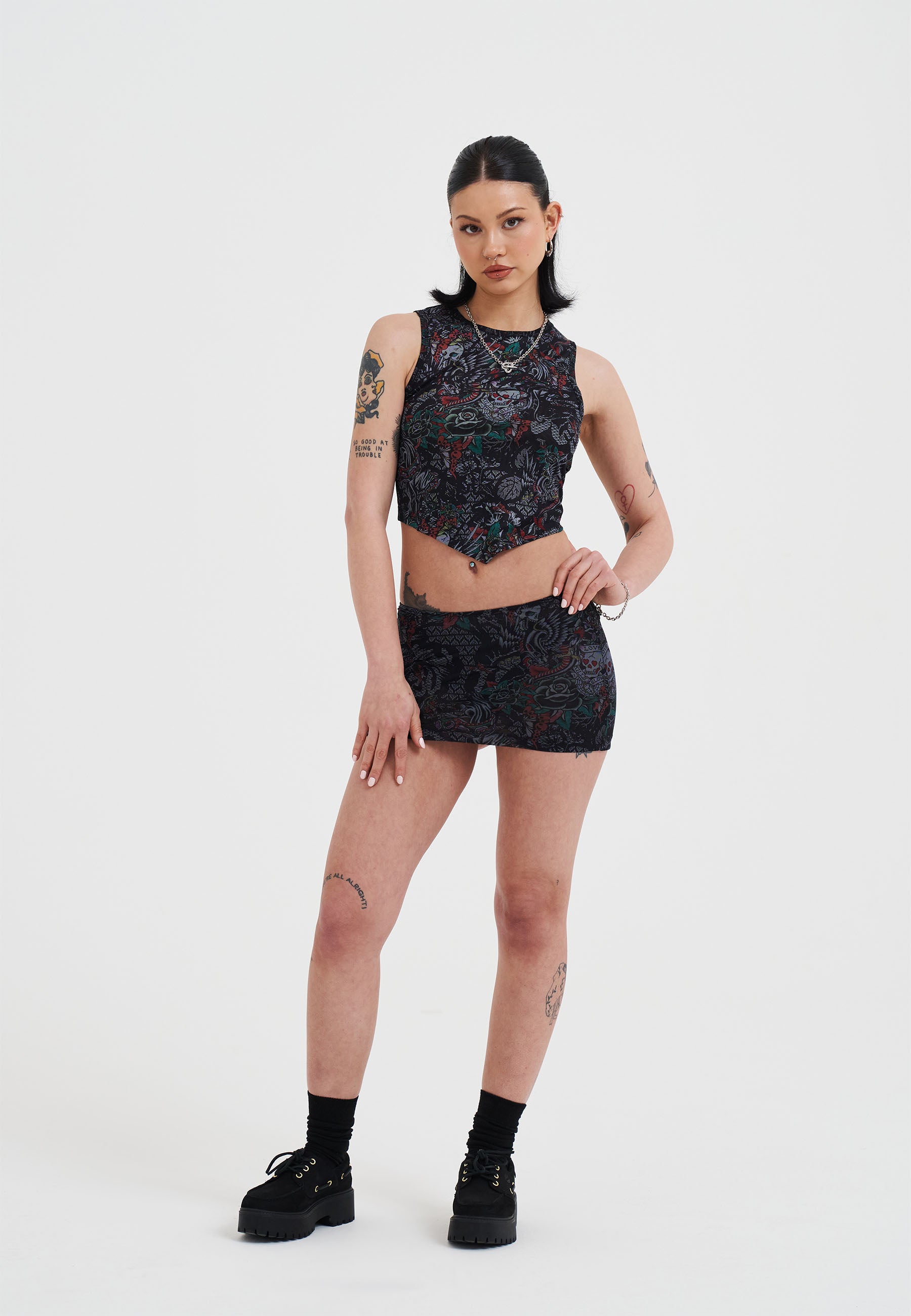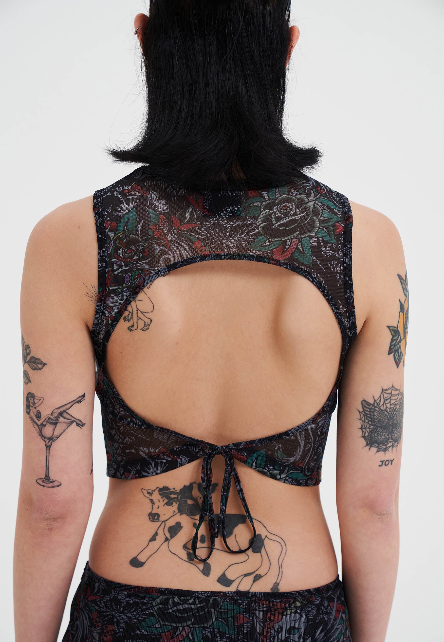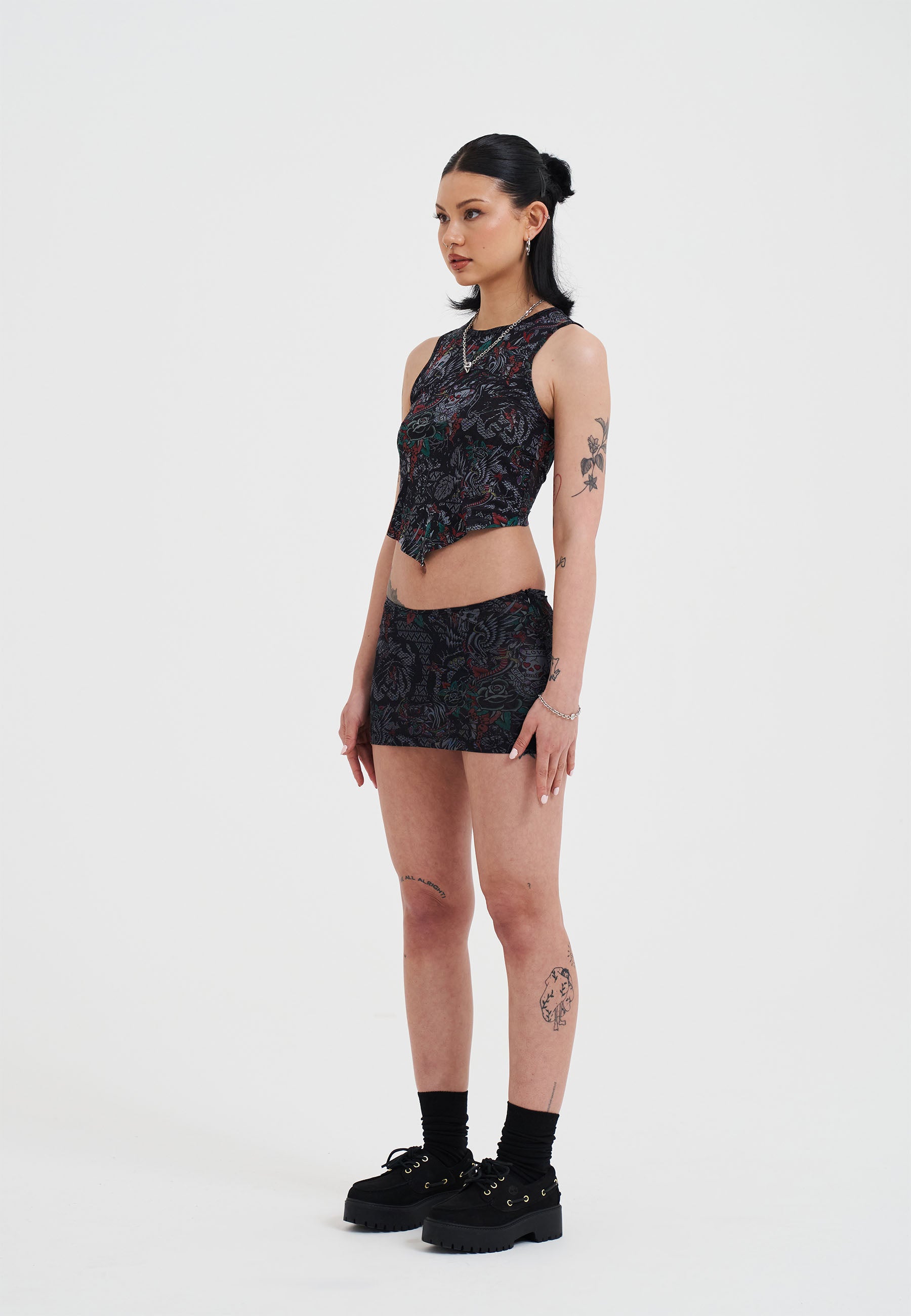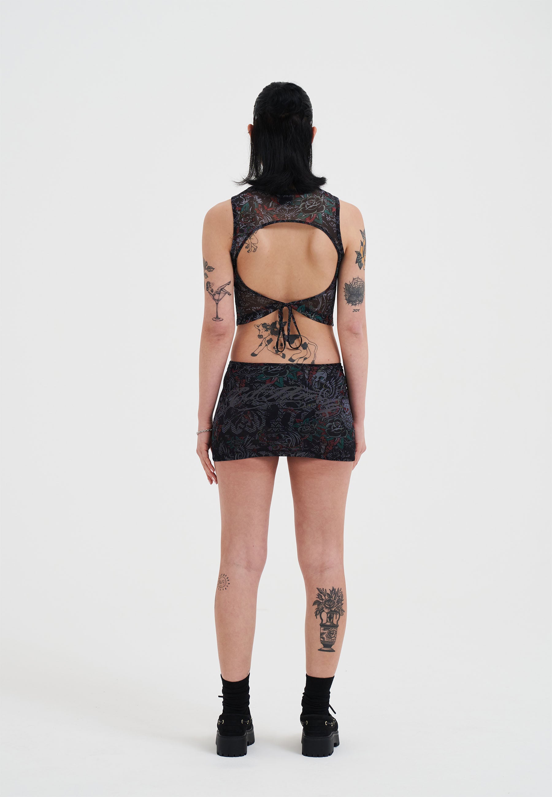 Womens Dragon Repeat Tied Back Mesh Vest Top - Black