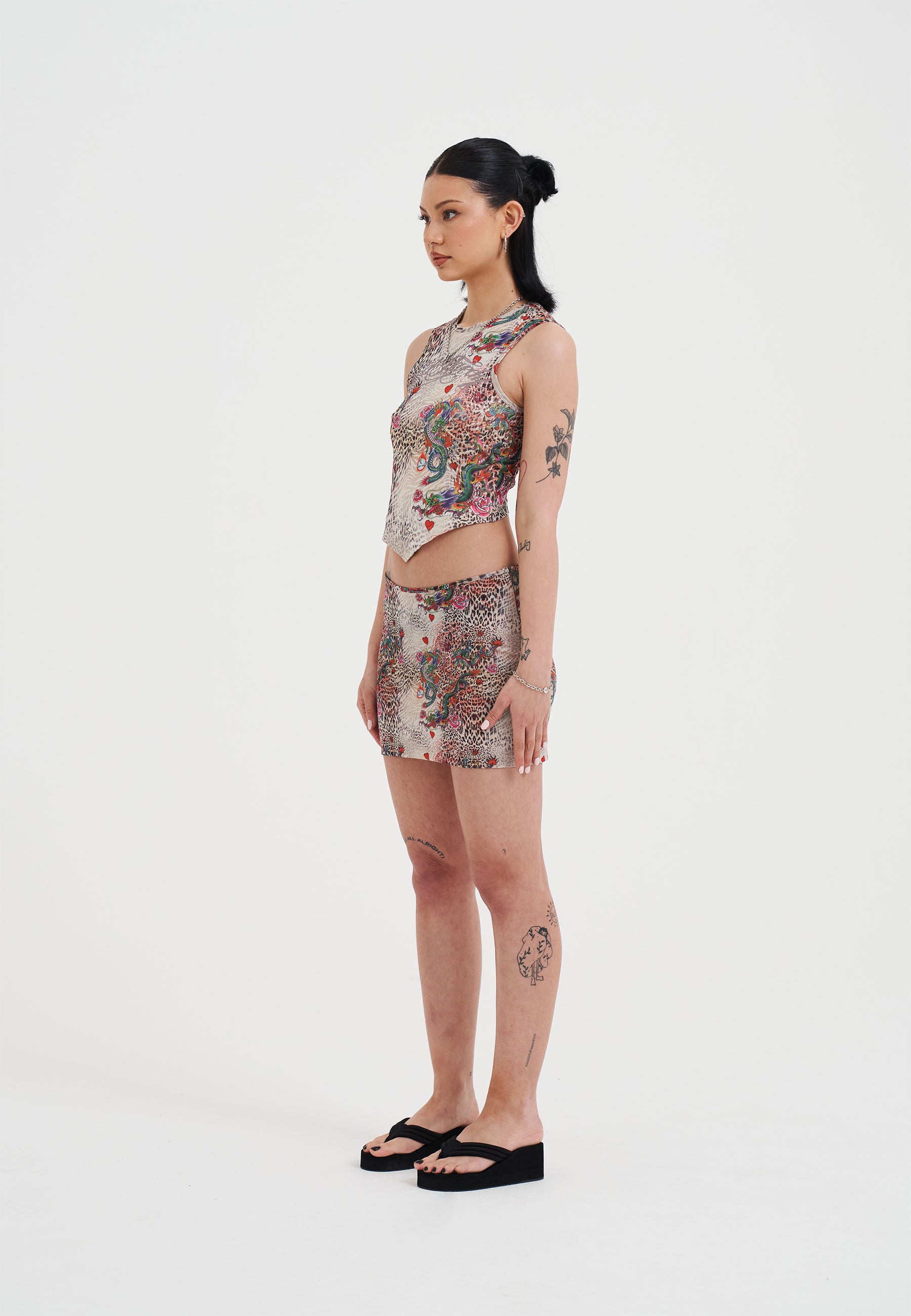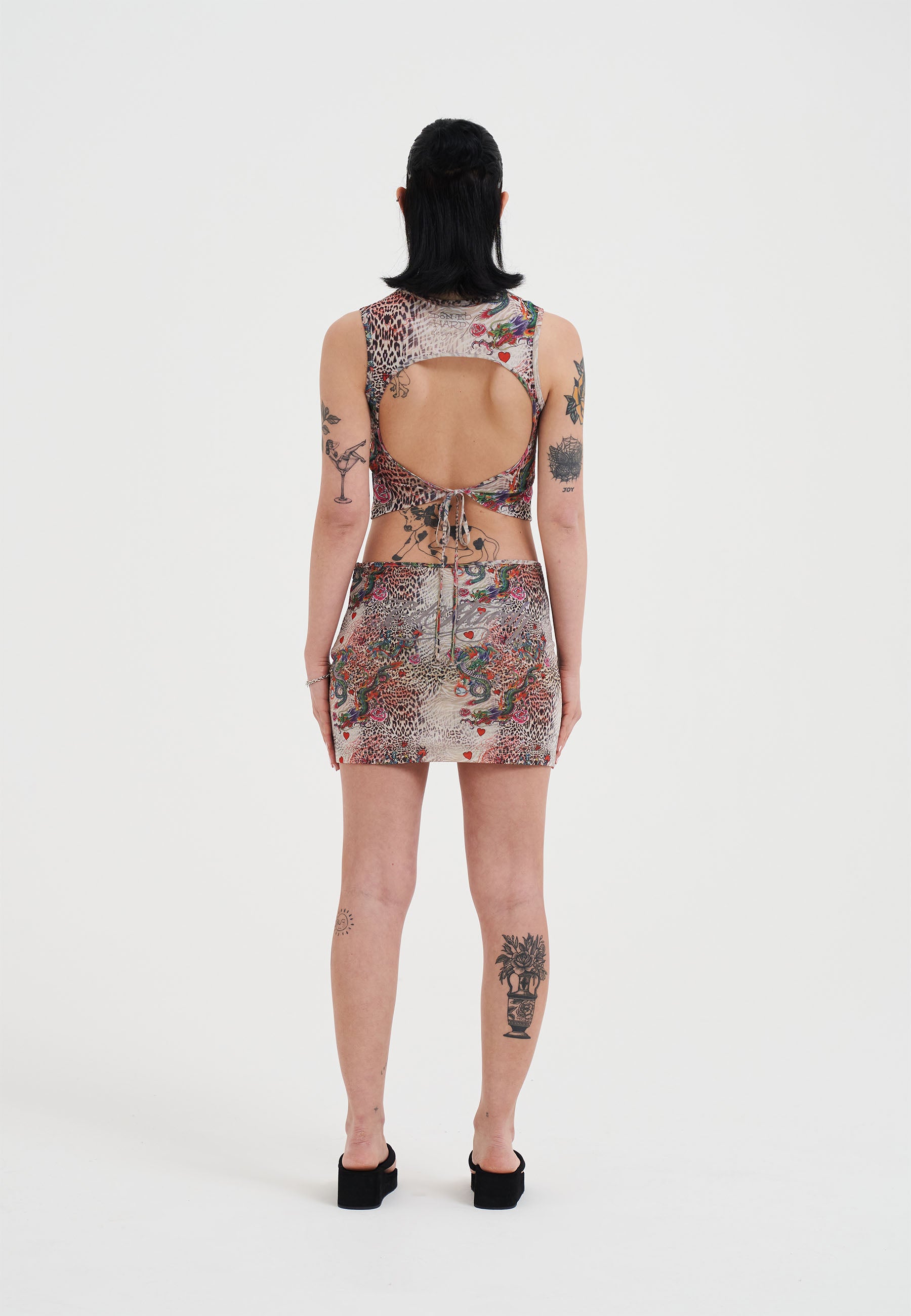 Womens Dragon Repeat Tied Back Mesh Vest Top - Ecru