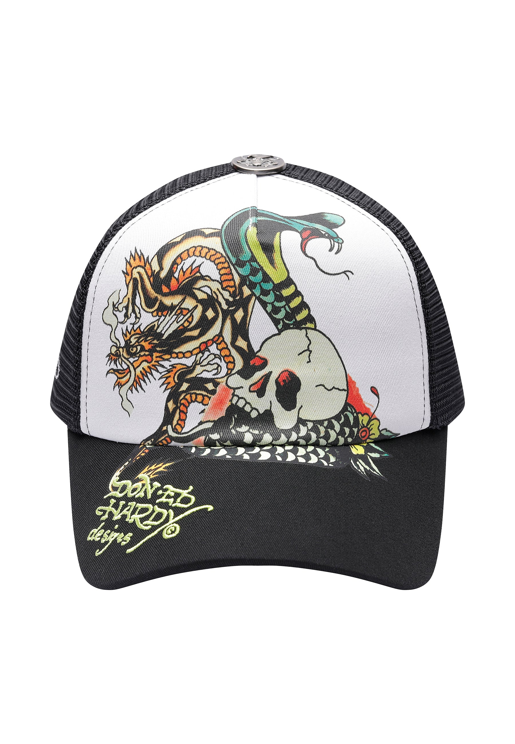Unisex Snake And Skull 5 Panel Trucker Cap - White
