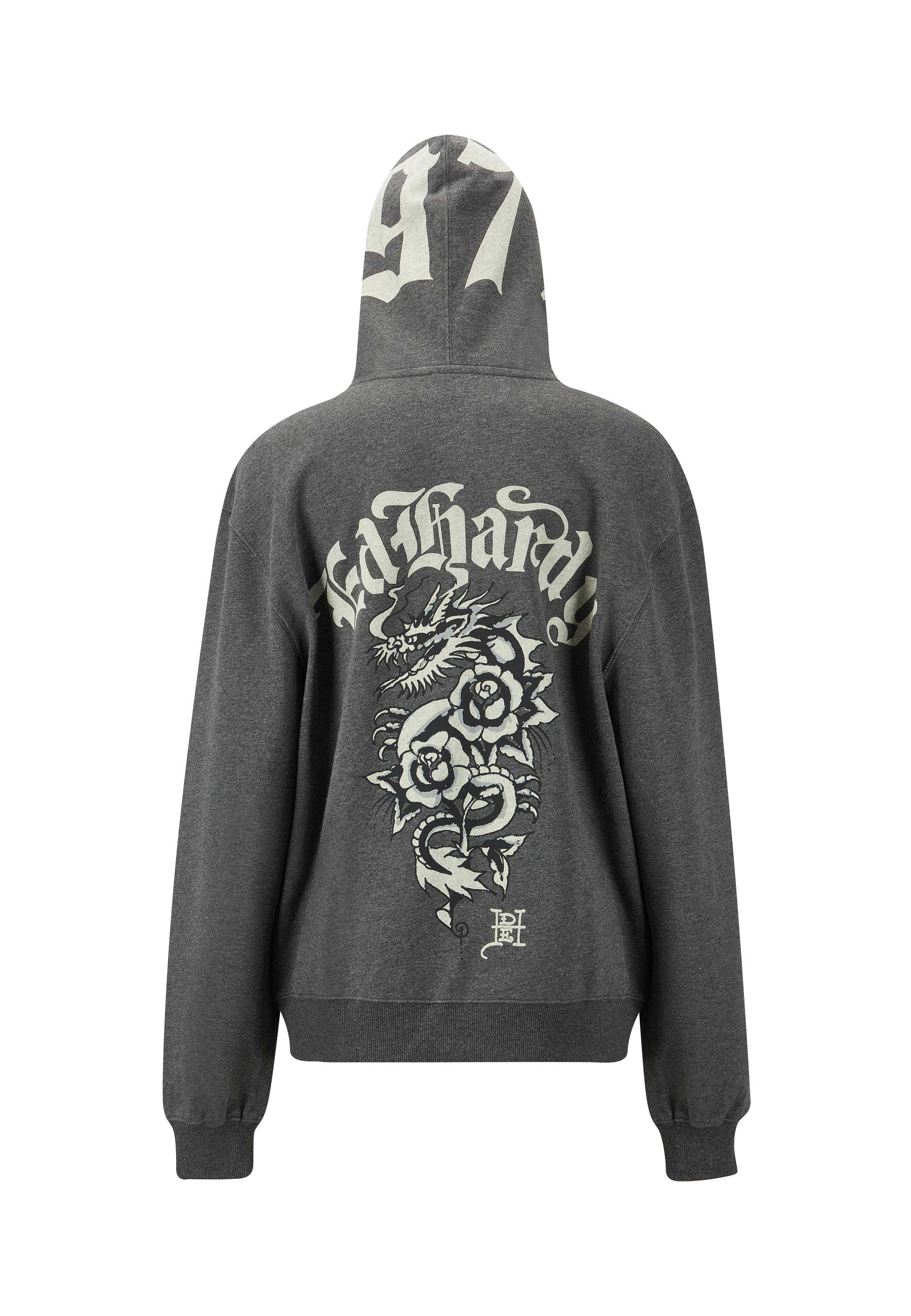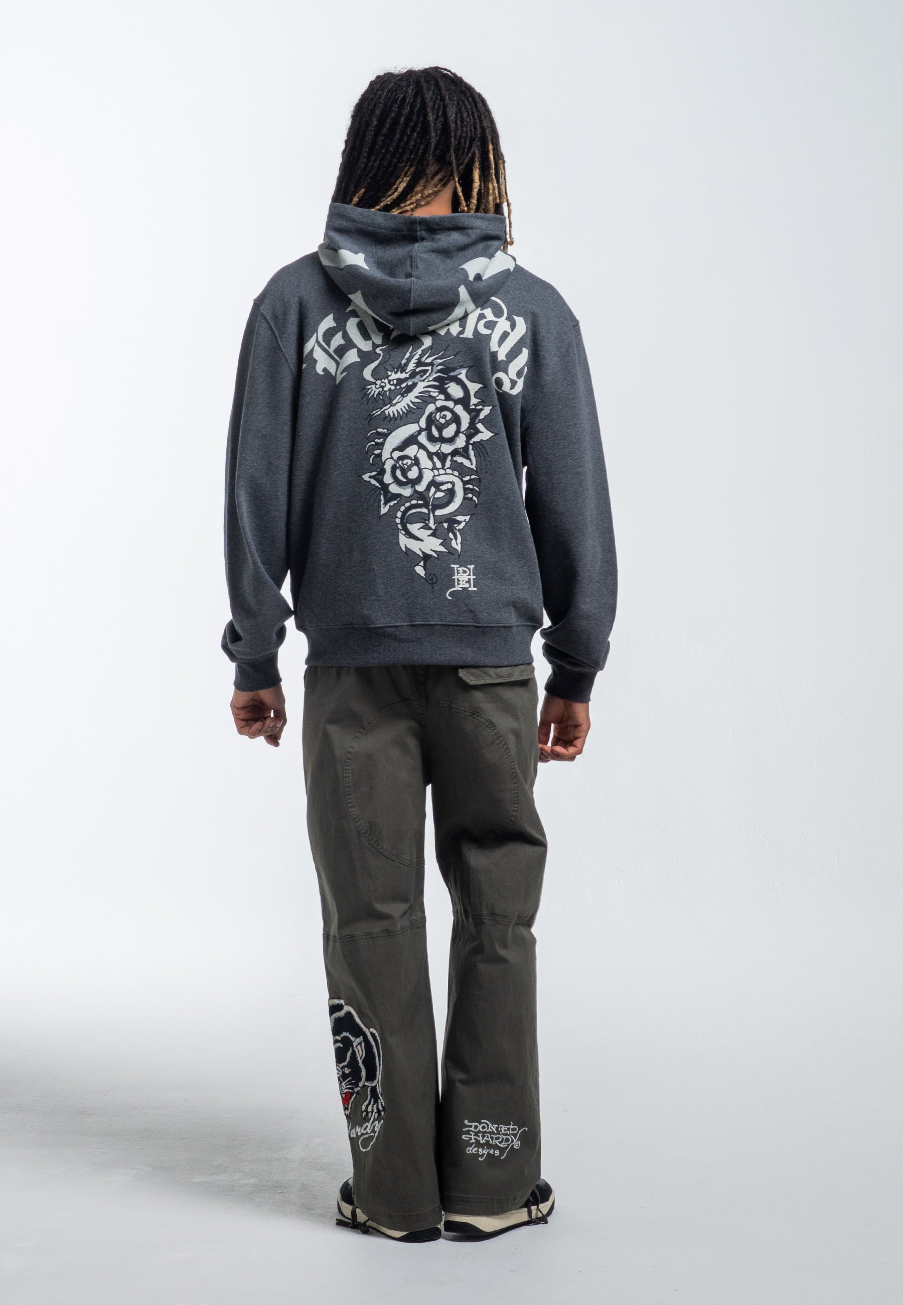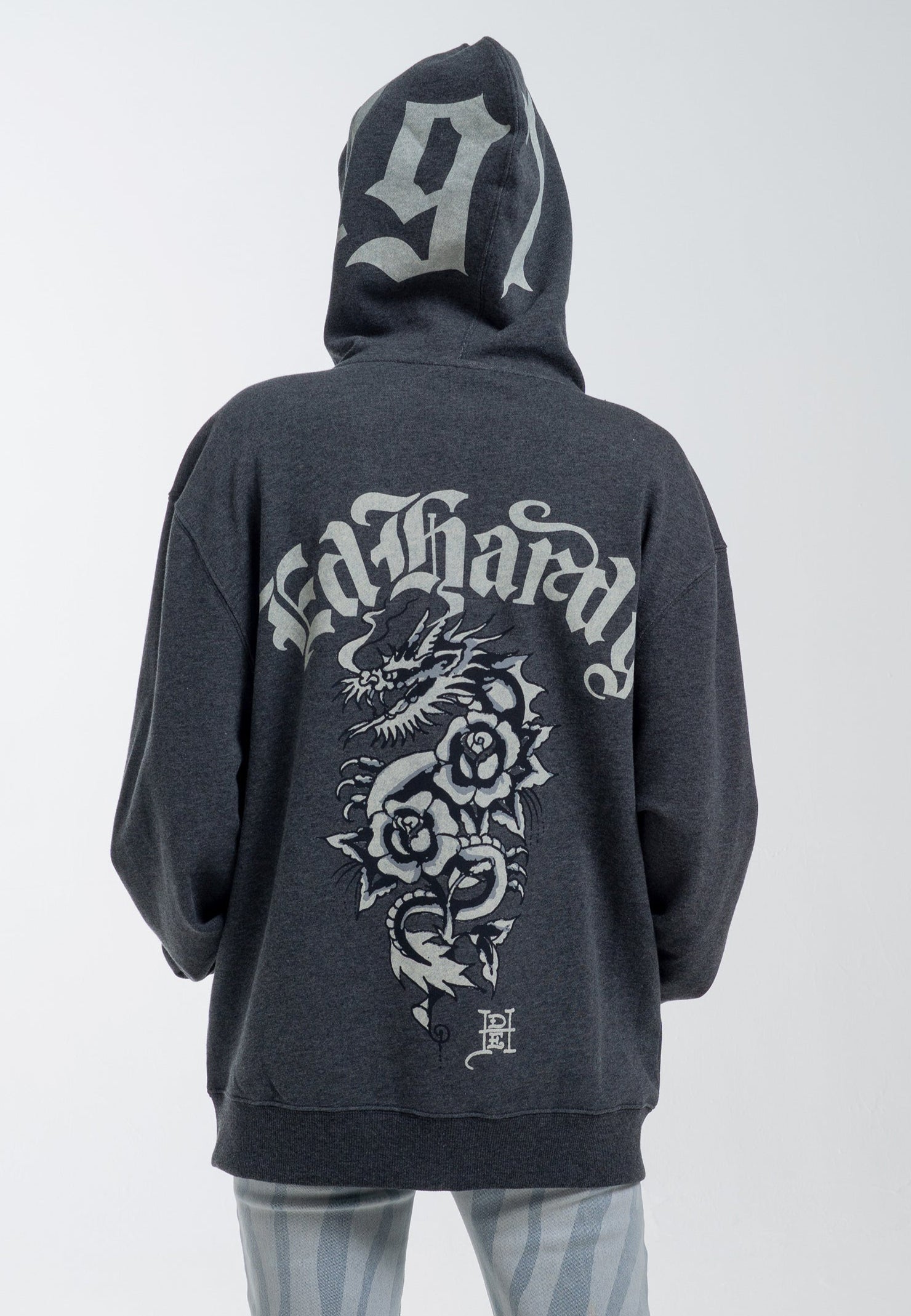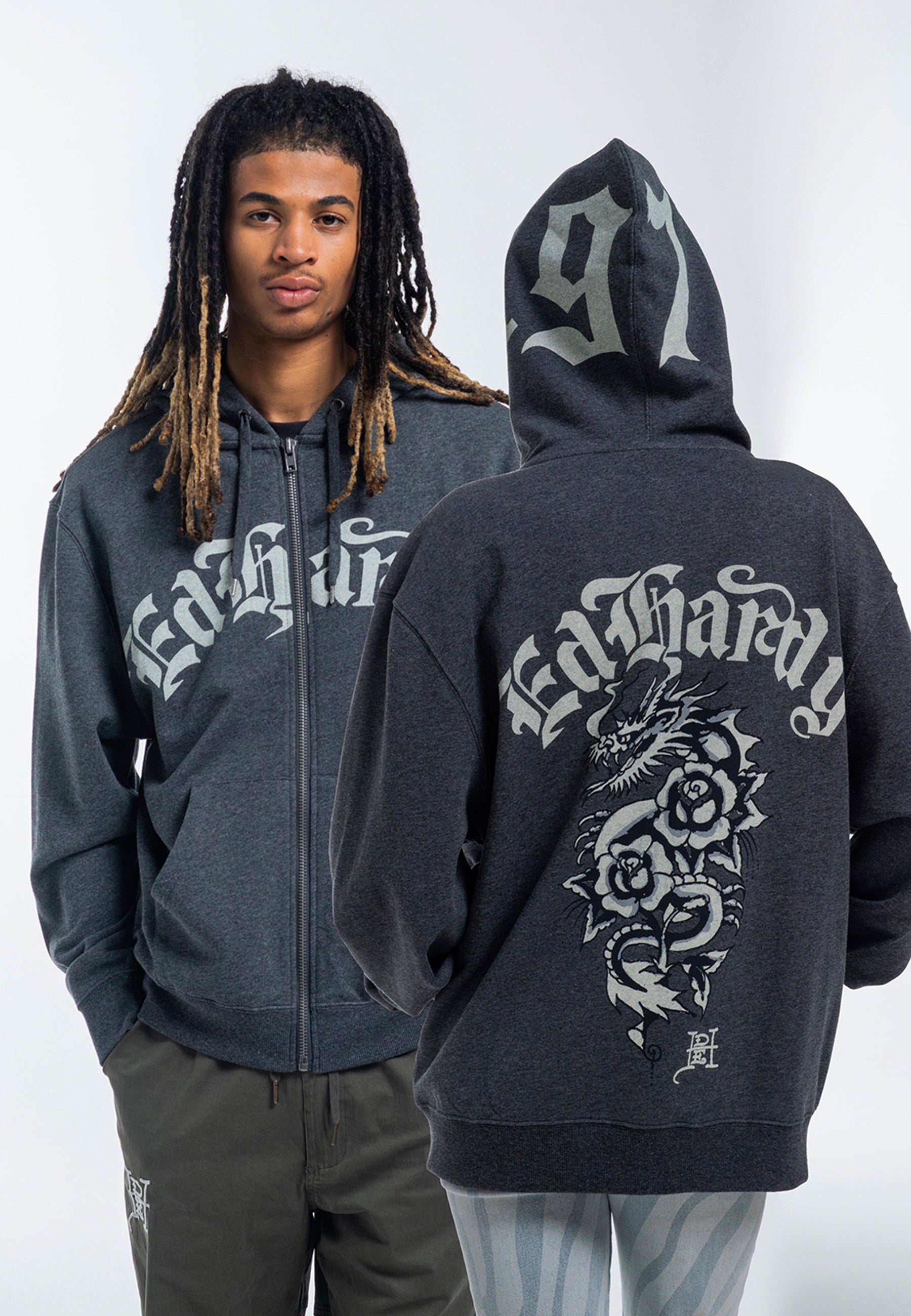 Med et talent for at væve tråde af inspiration fra kunst-, mode- og musiksubkulturer ind i hans design, udstråler Dragon Rose Zip-Thru Hoodie en gotisk essens, der altid har været et kendetegn for Eds arkiv.
