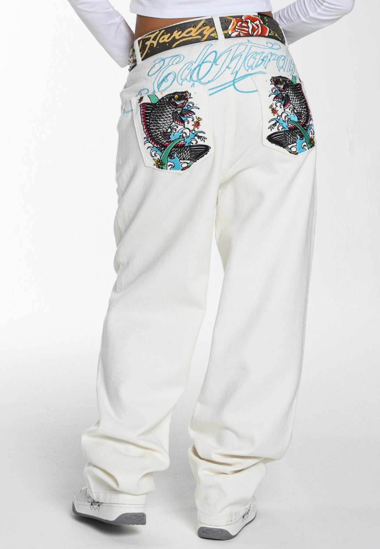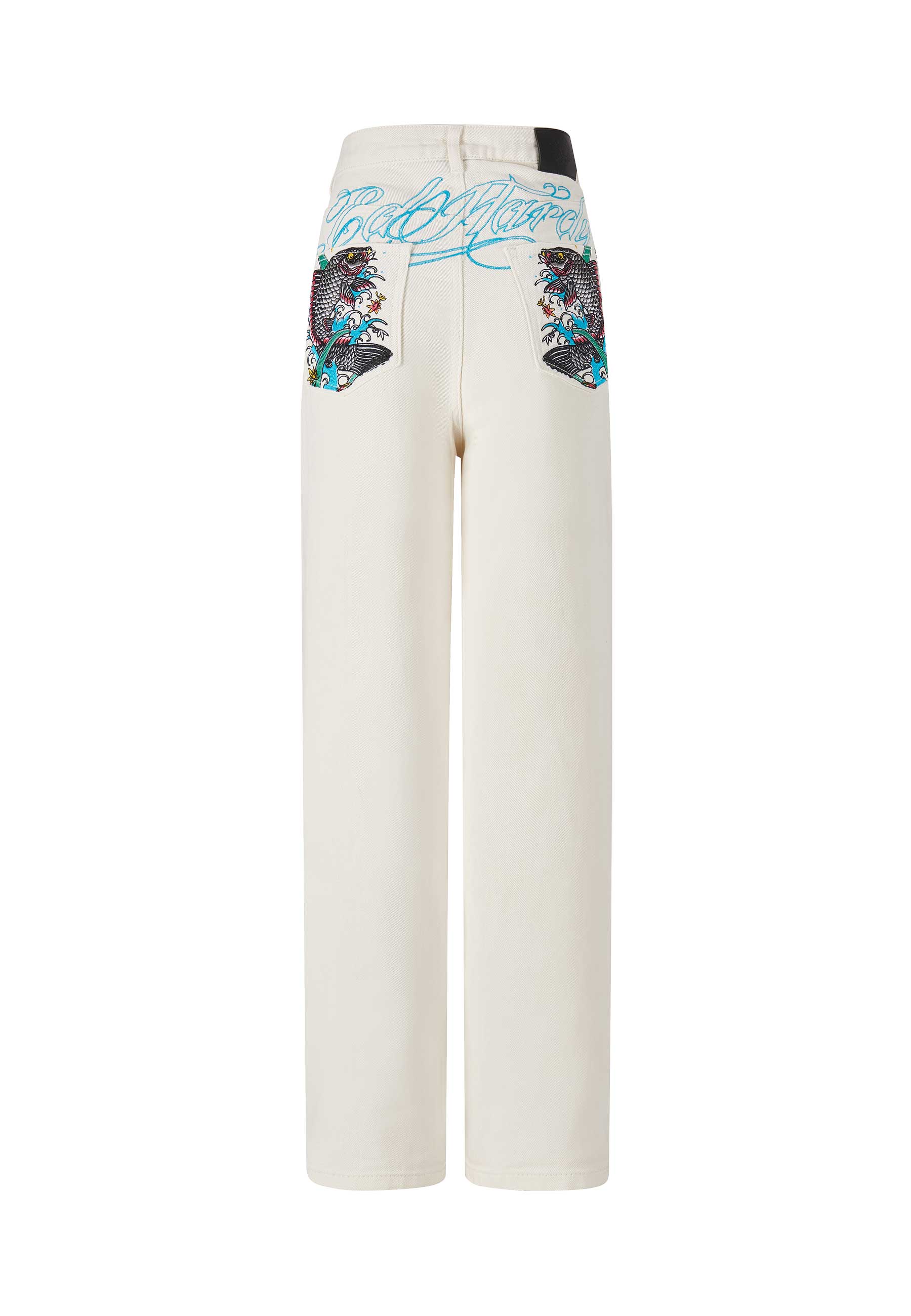 Denne AW, disse jeans genopliver klassiske designs med levende broderi og en ny silhuet, der viser Ed Hardys signaturlogo og fuldfarvegrafik. Lavet af 100 % hvid bomuldsdenim for en afslappet pasform.