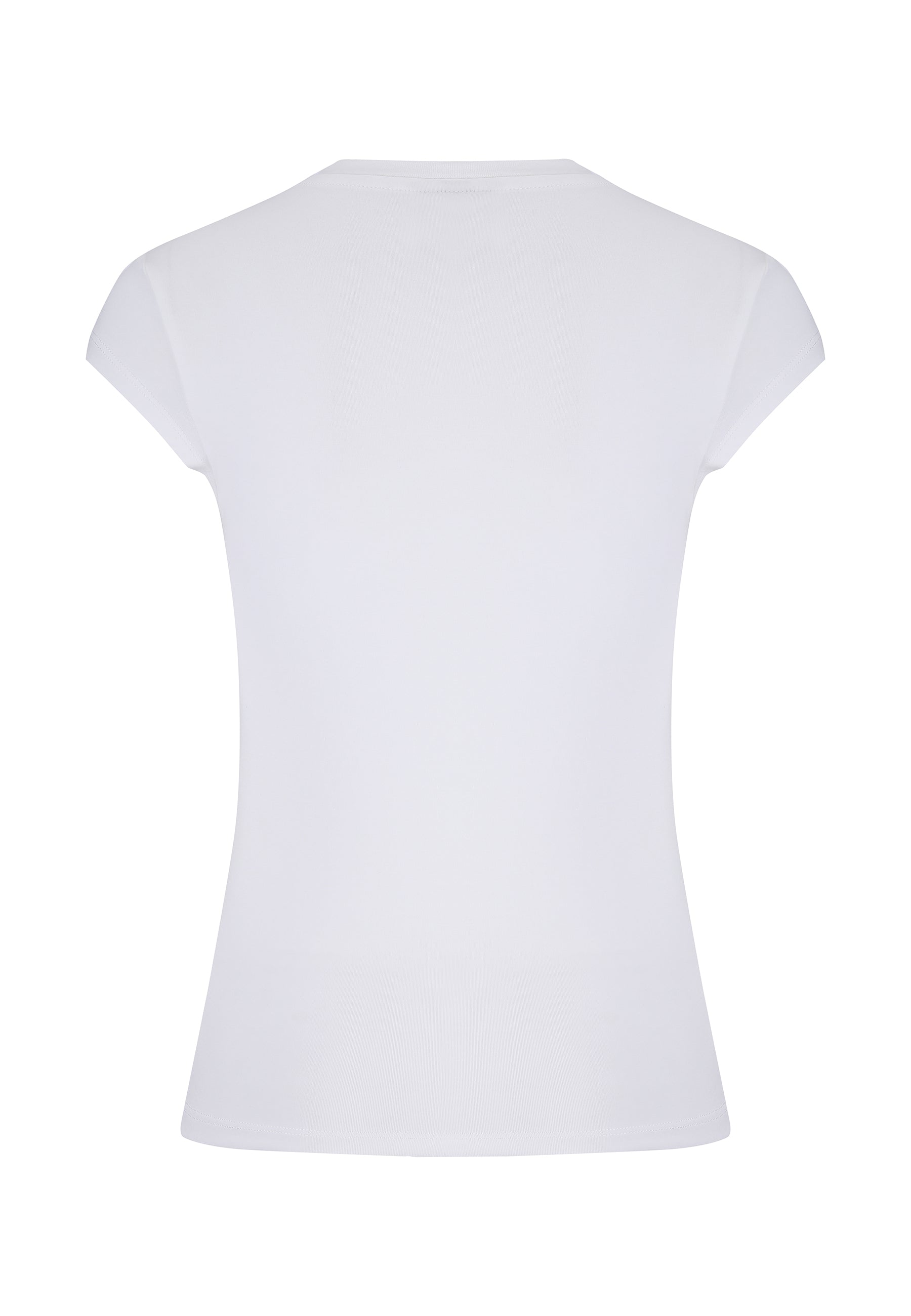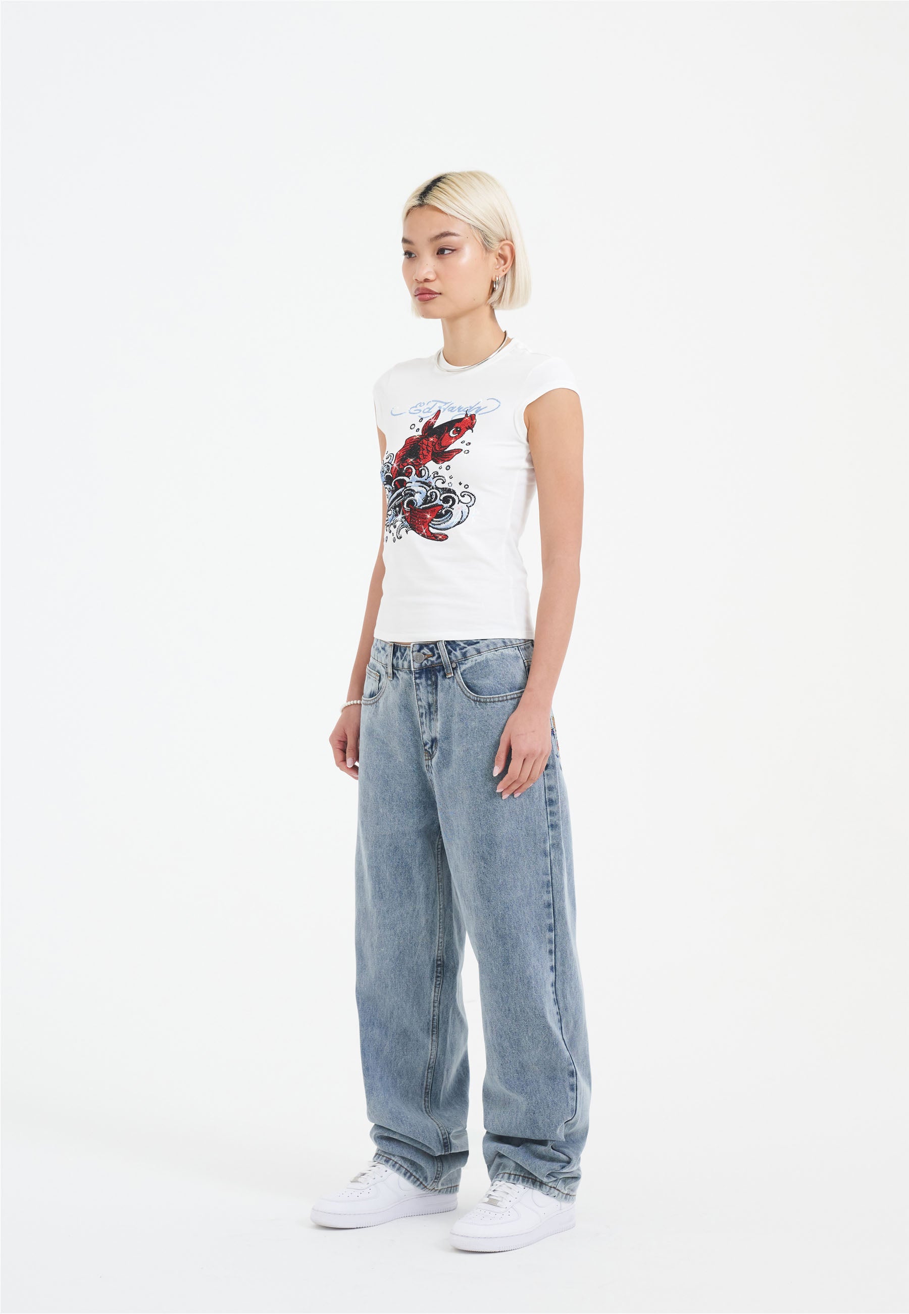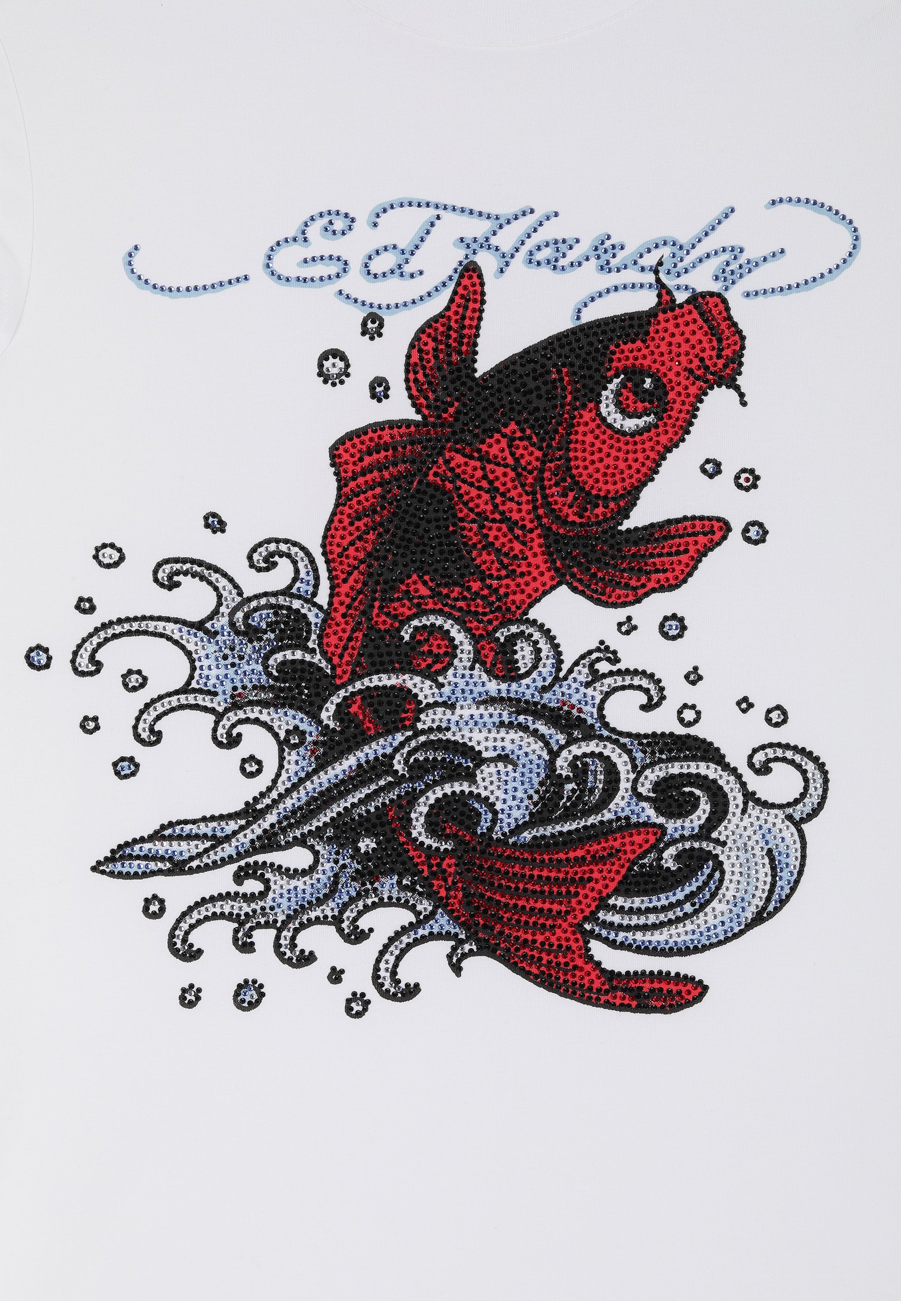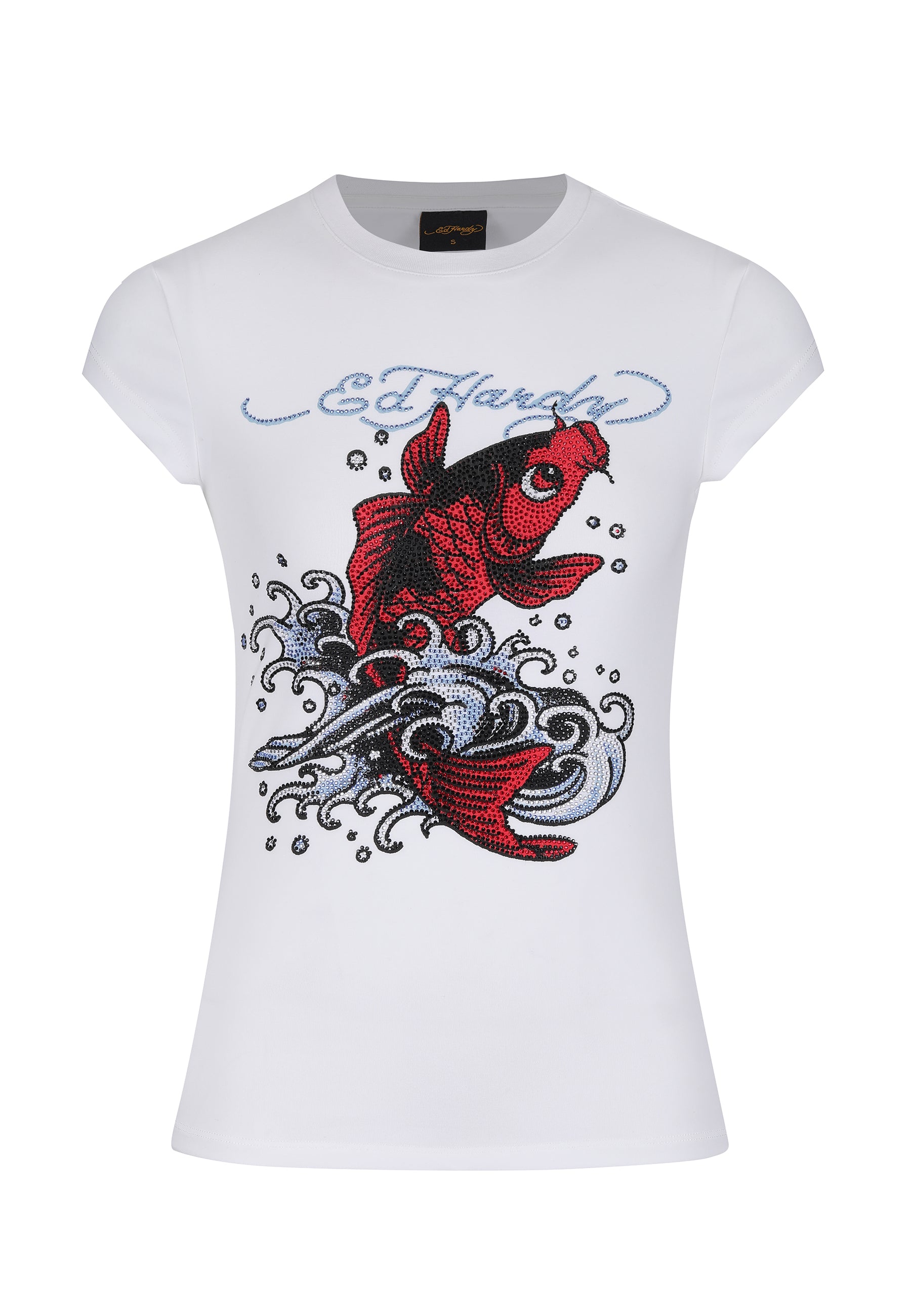 Dame Koi Wave Diamante Cap Sleeve Tshirt Top - Hvid
