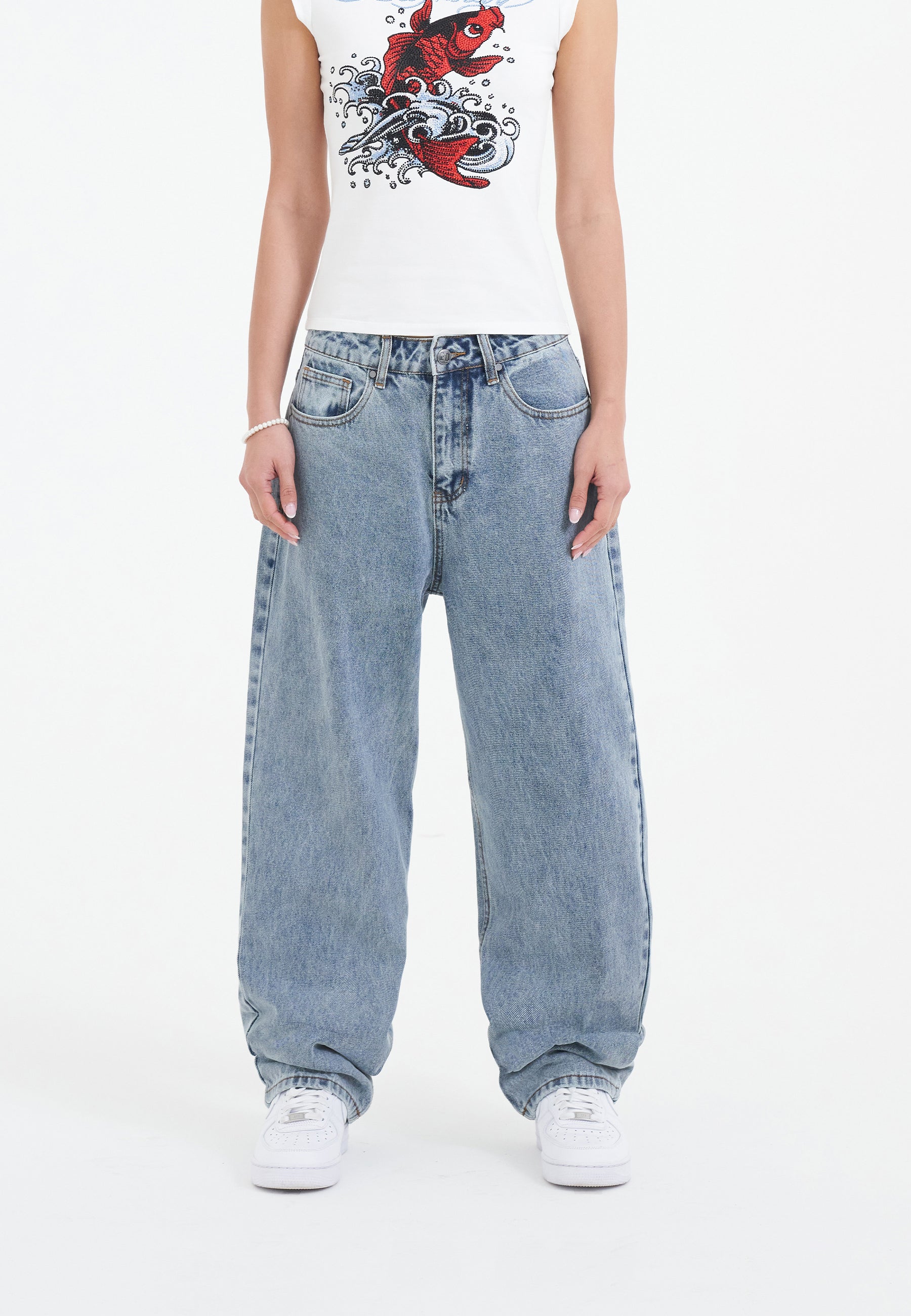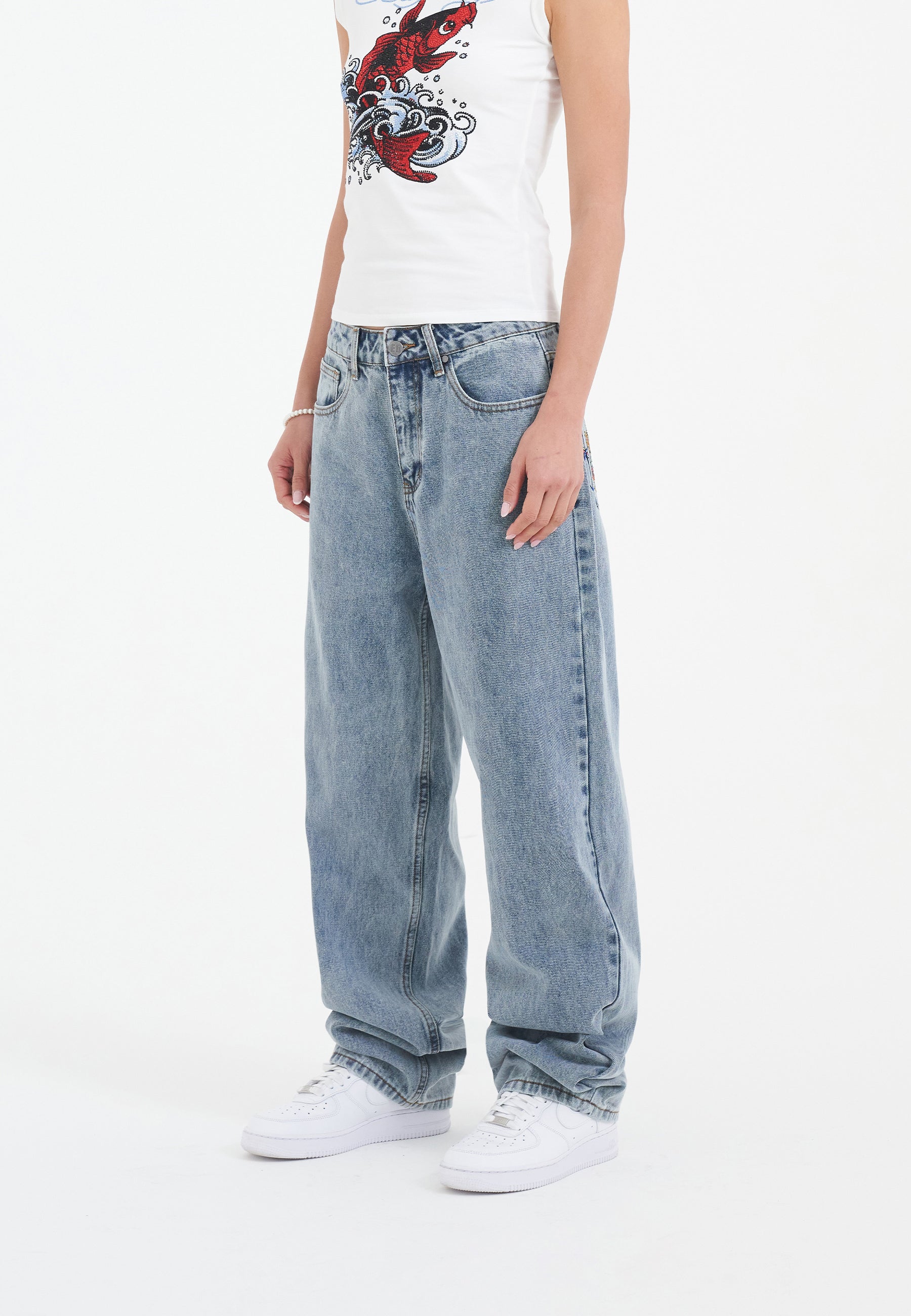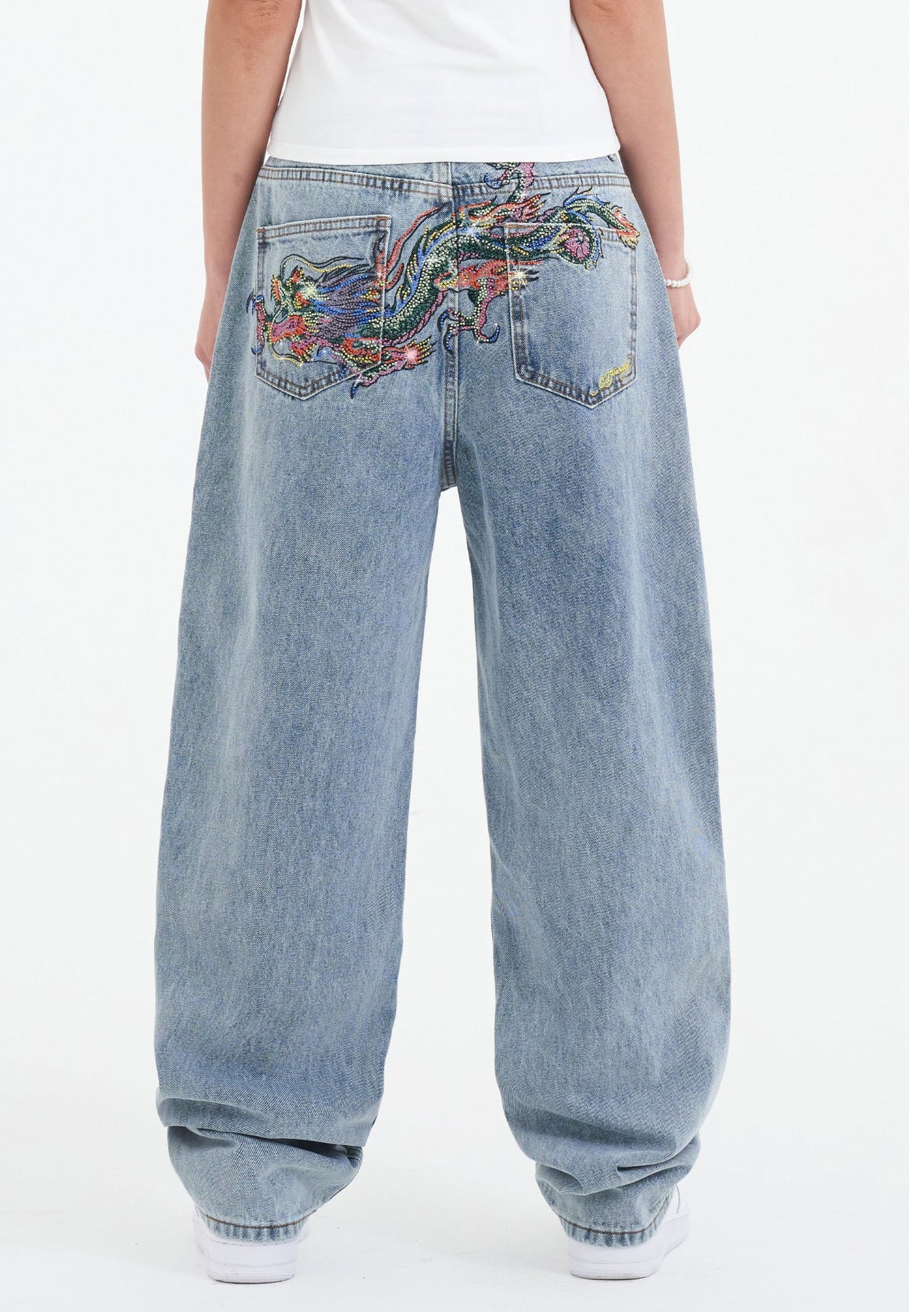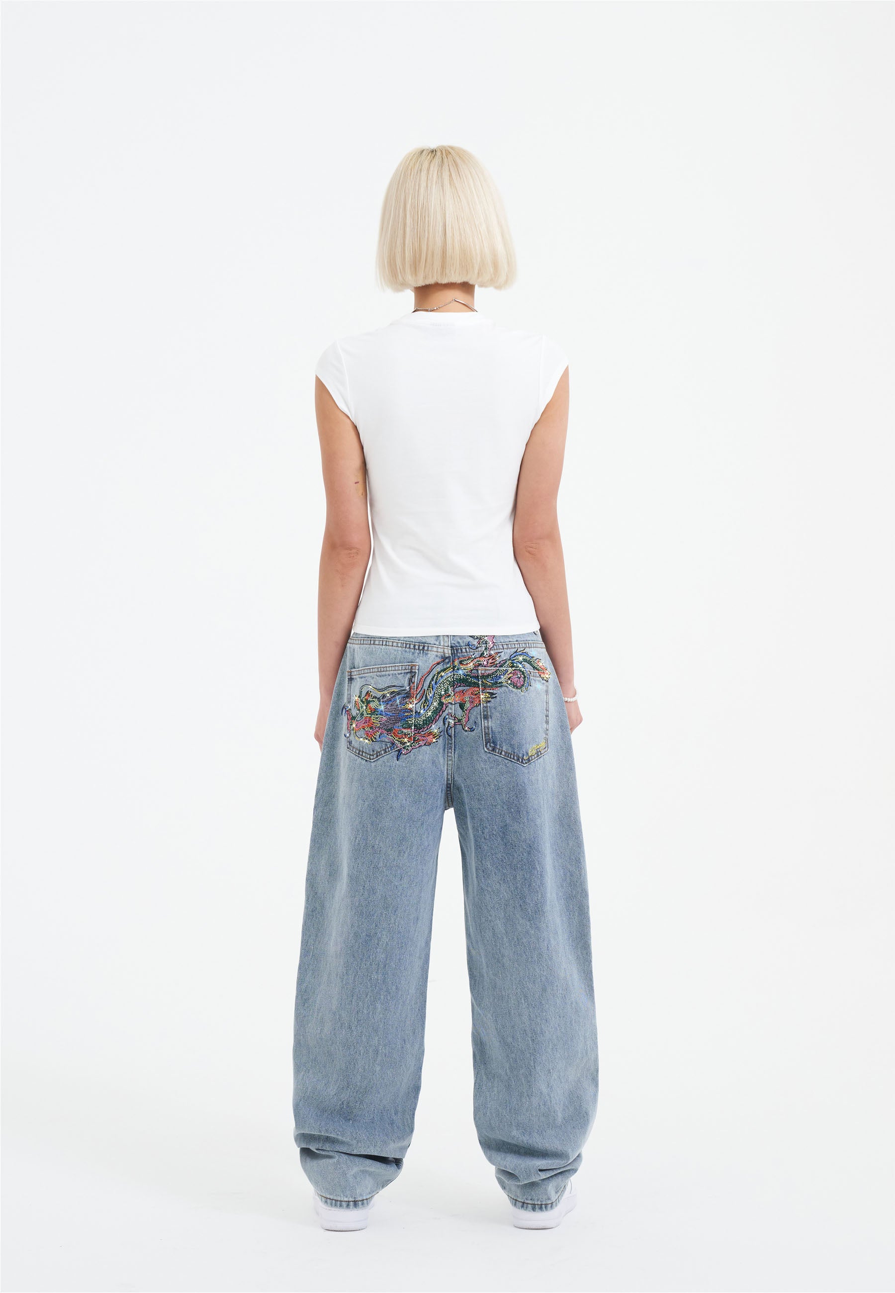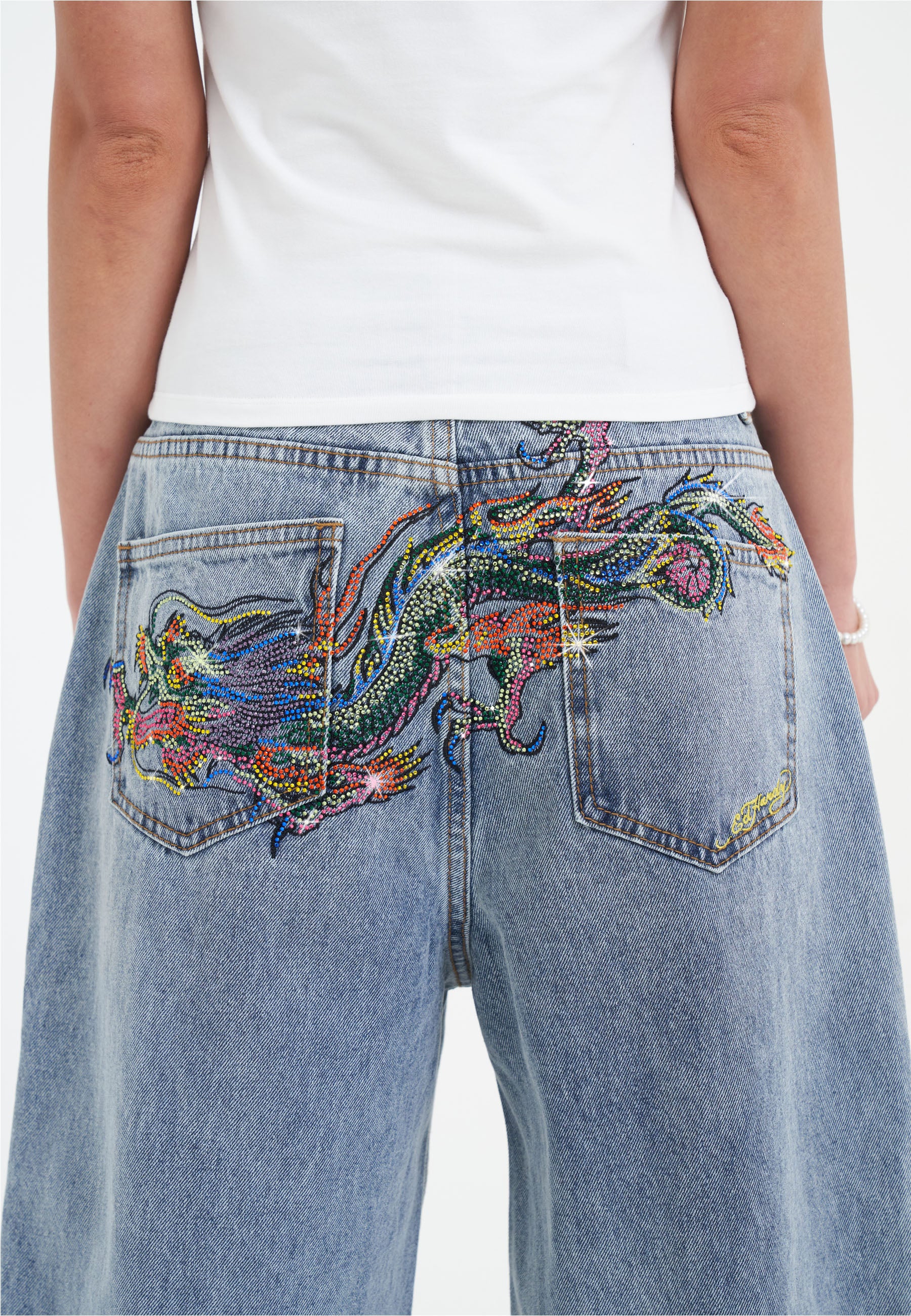 Dame Crystal Crawler Diamante Relaxed Denim Bukser Jeans - Bleach
