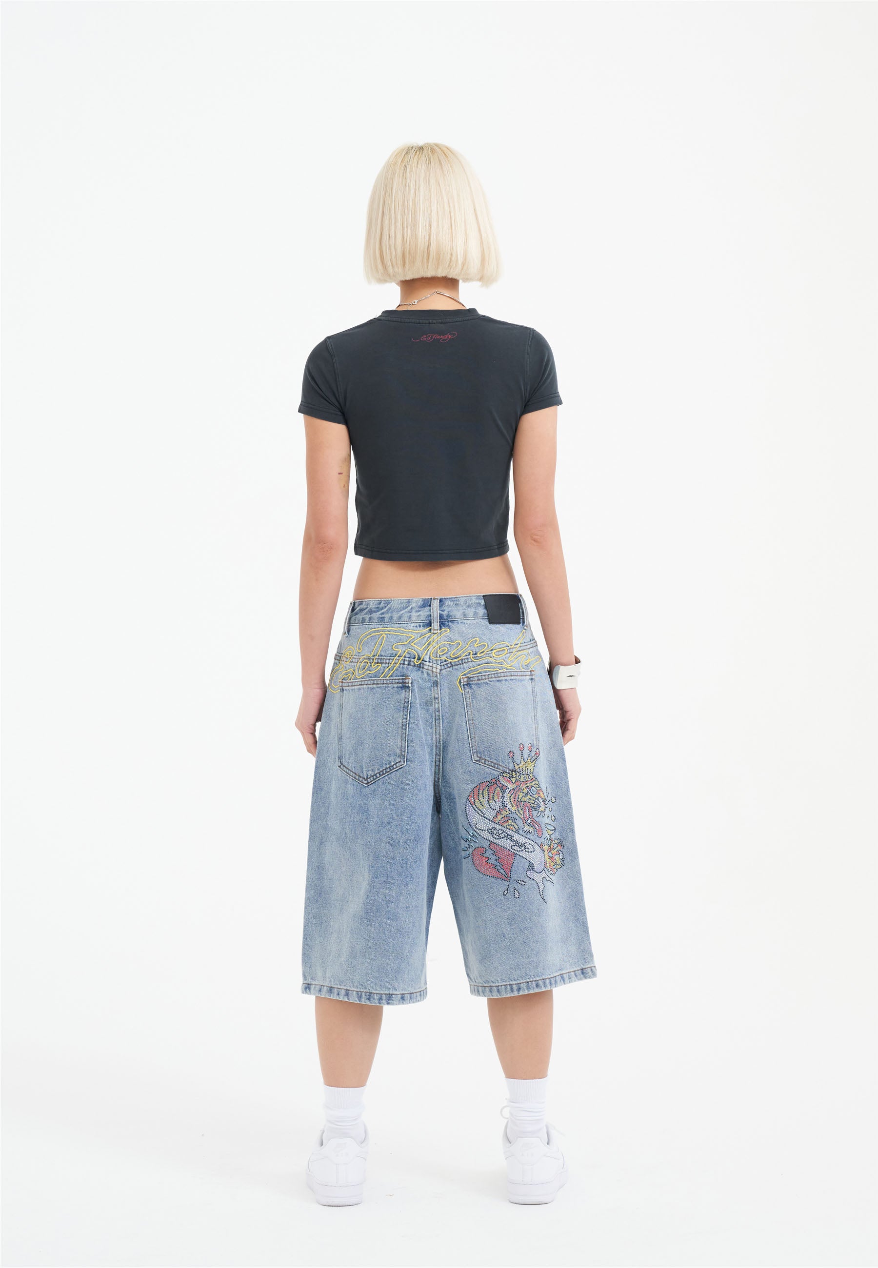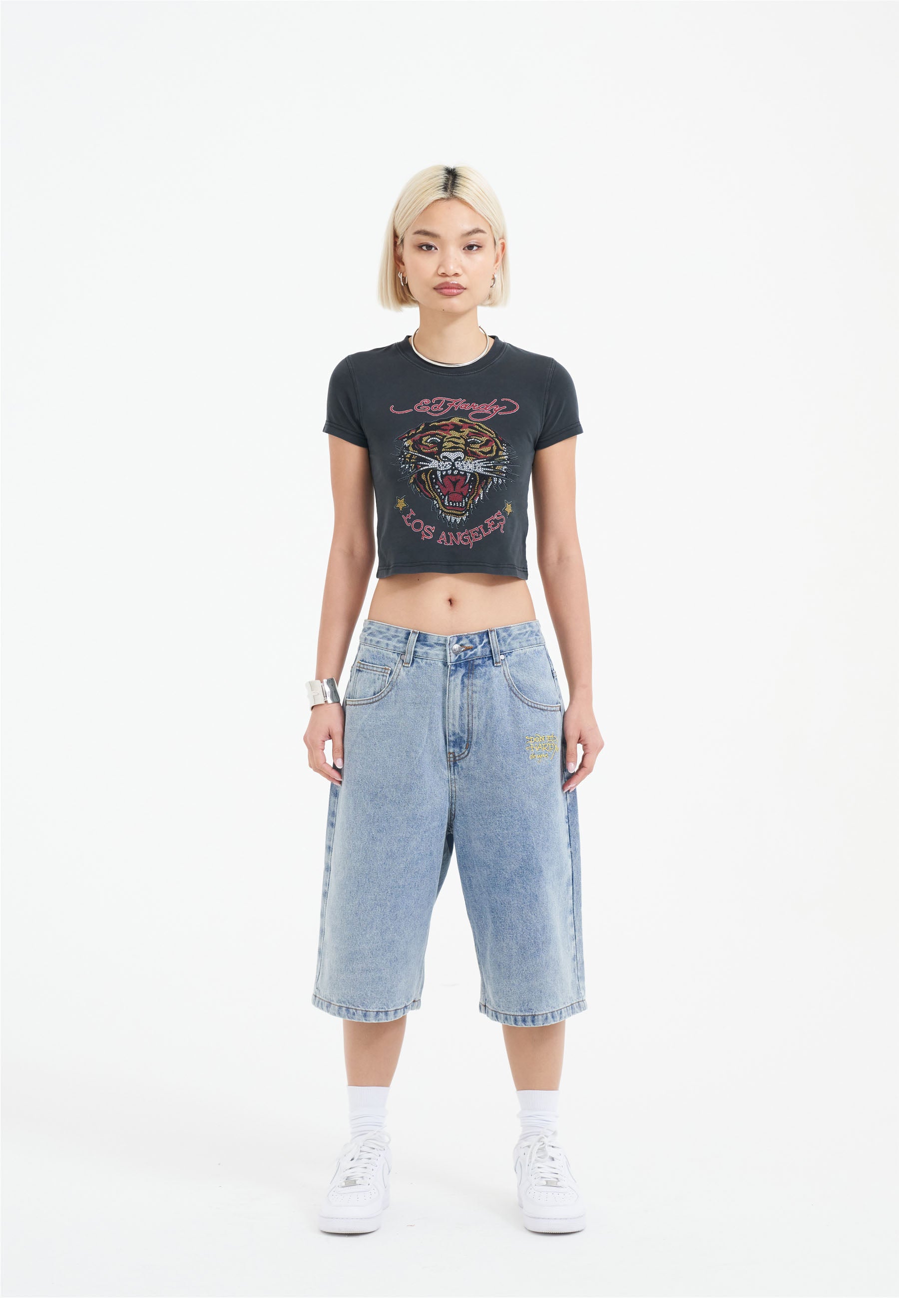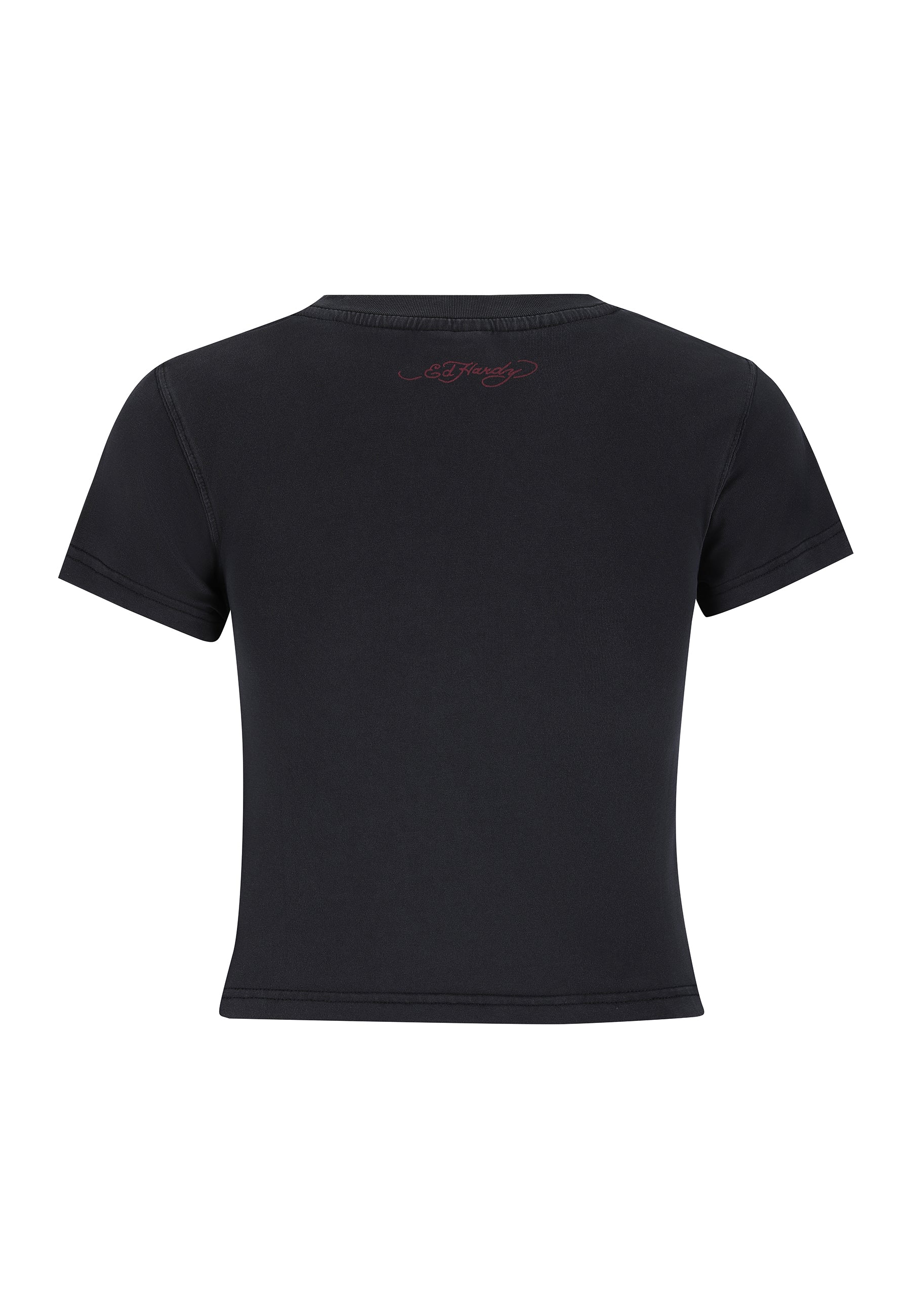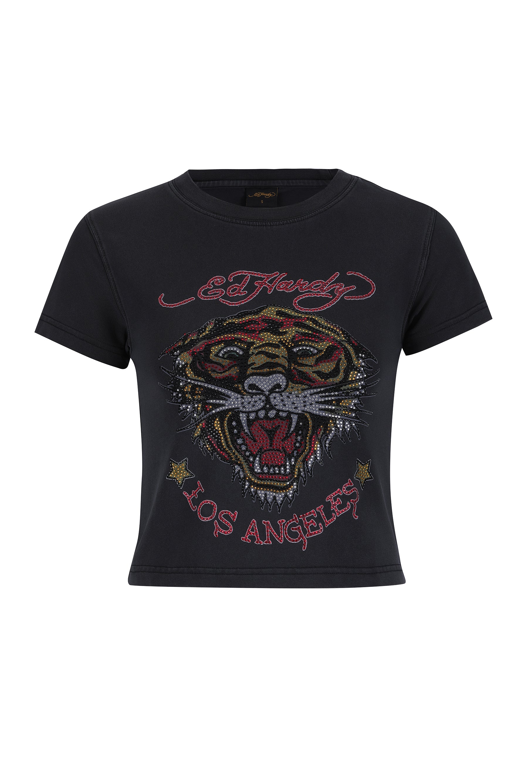Dame La-Roar-Tiger Diamante Cropped Baby Tshirt Top - Sort