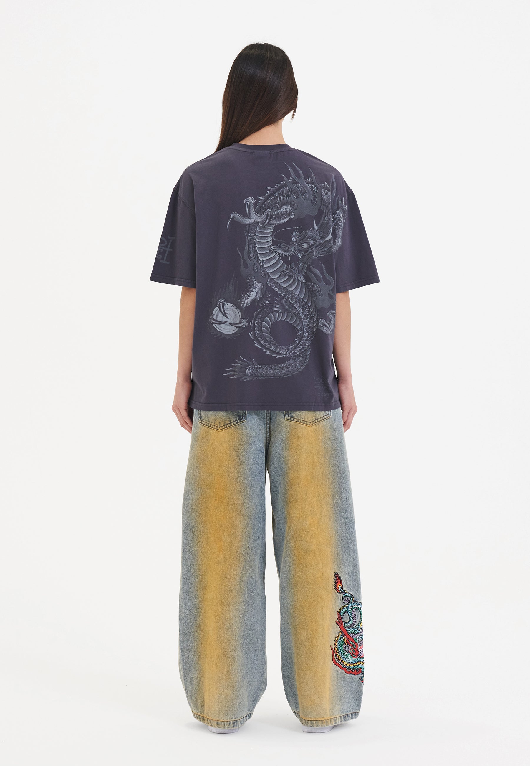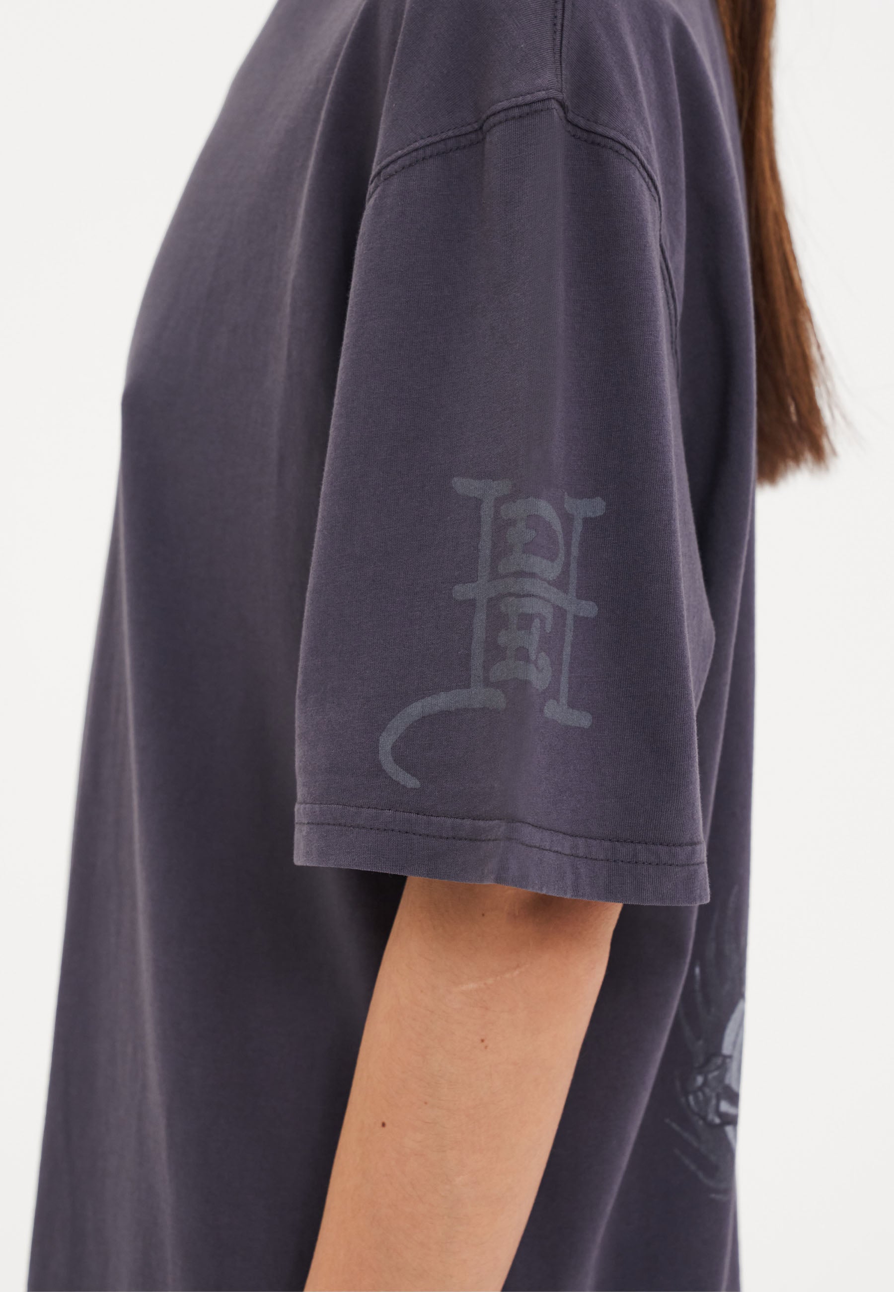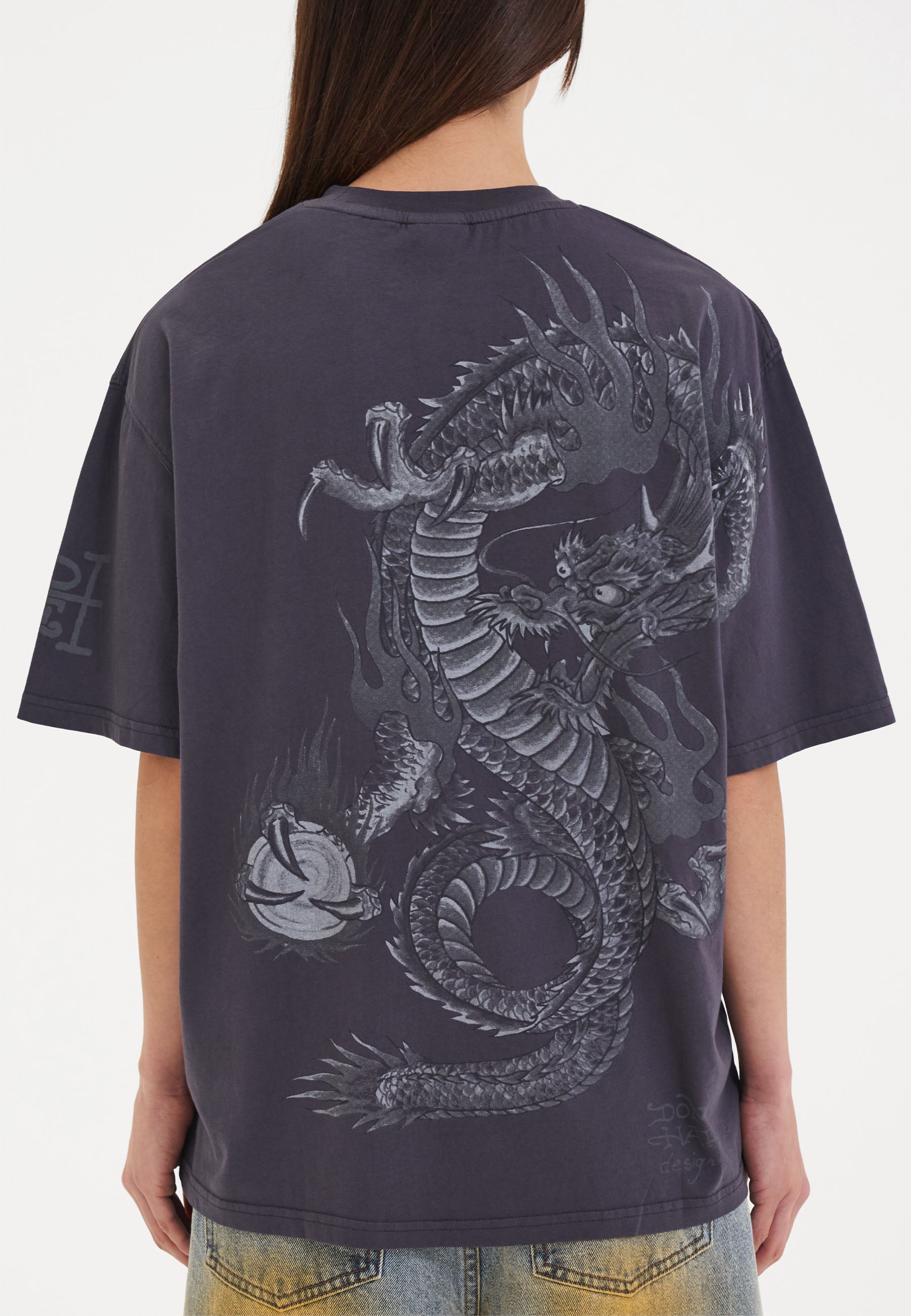 Dame Mono Fireball Dragon Tshirt Top - Mørkegrå