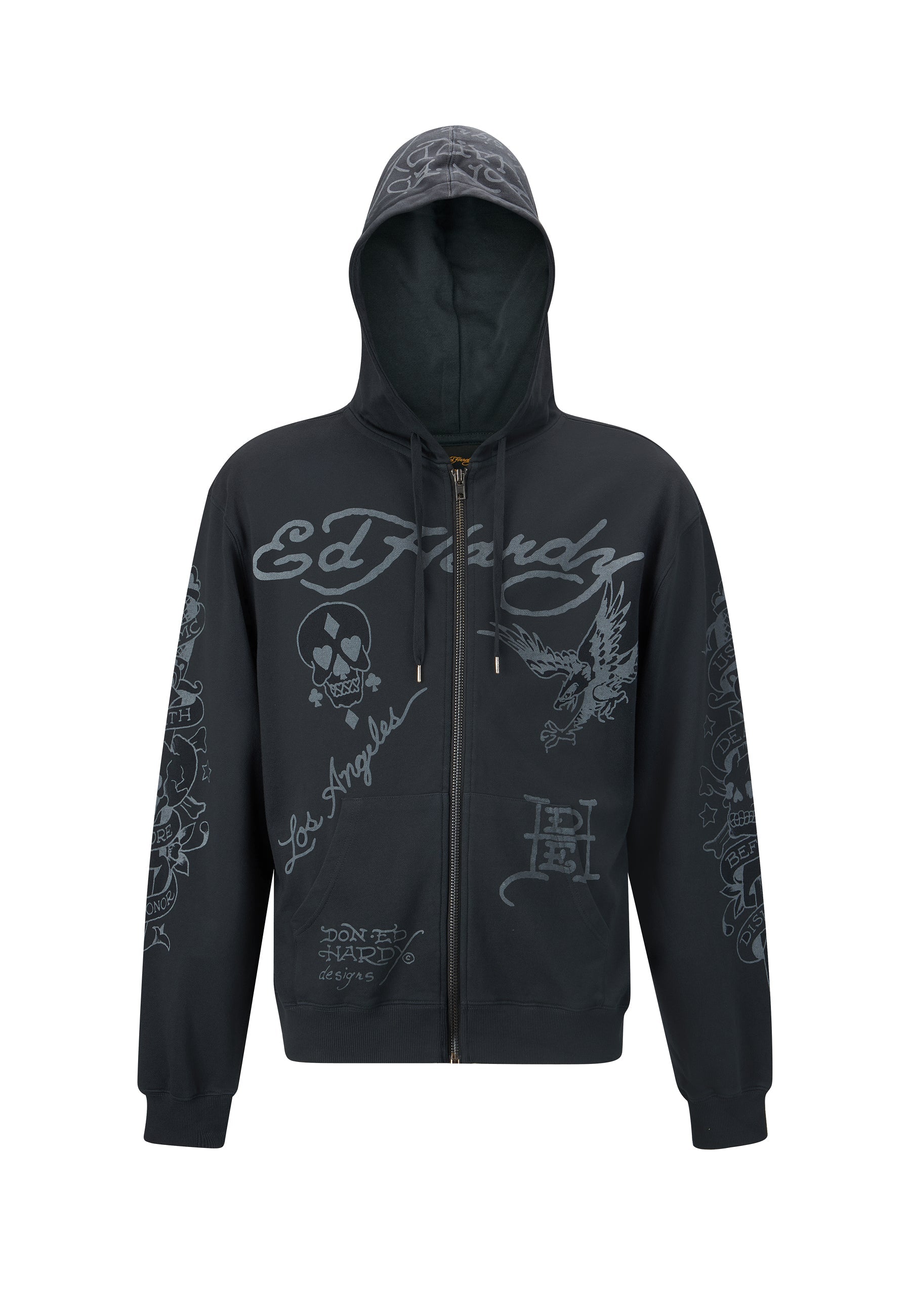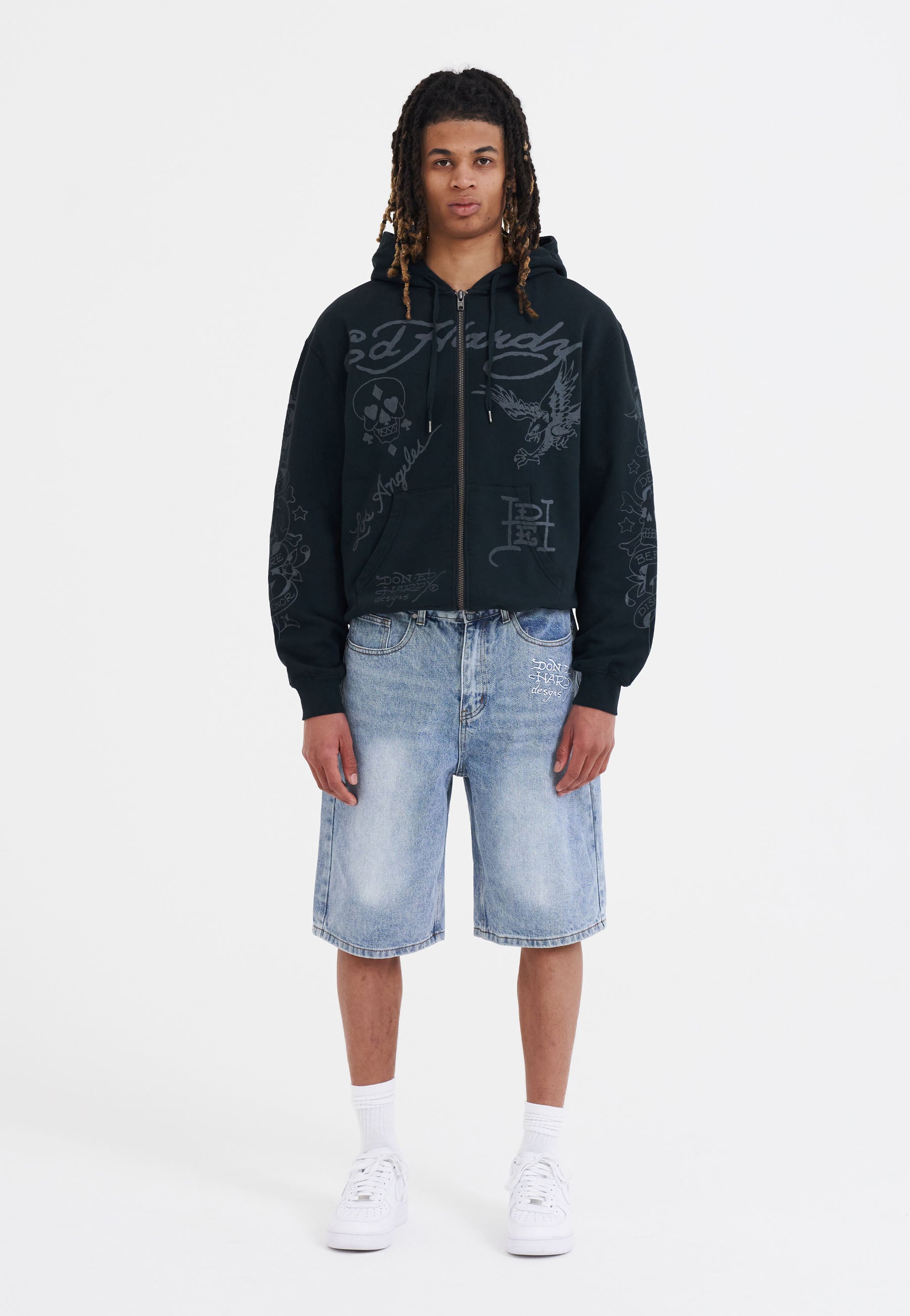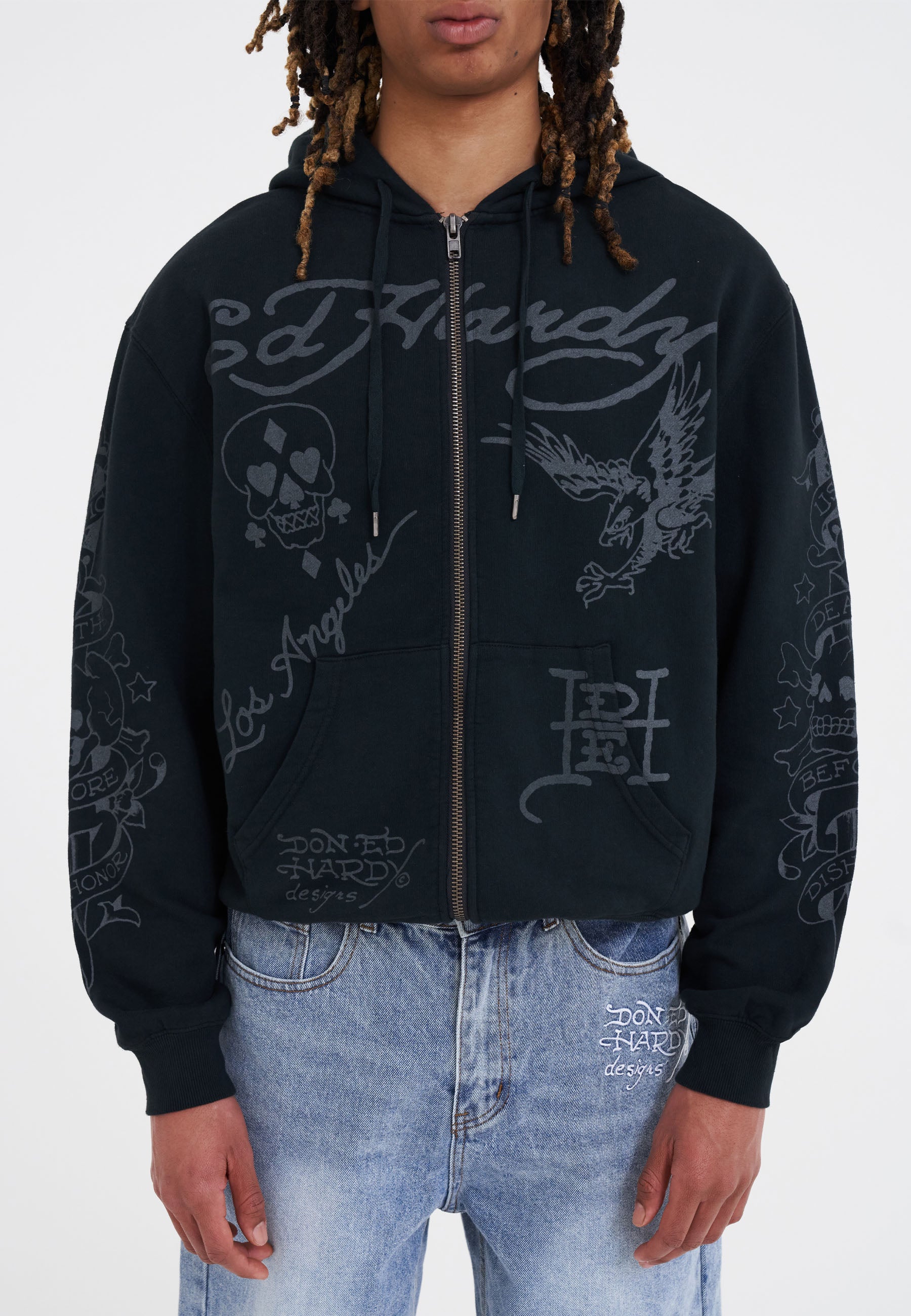 Denne jakke har forskellige fantastiske Ed Hardy-tatoveringsdesigns på tværs af fronten samt Ed Hardys ikoniske logo hen over brystet, alt i hvidt, og repræsenterer virkelig DEHs indflydelse på tatoveringsindustrien og dermed streetwear.