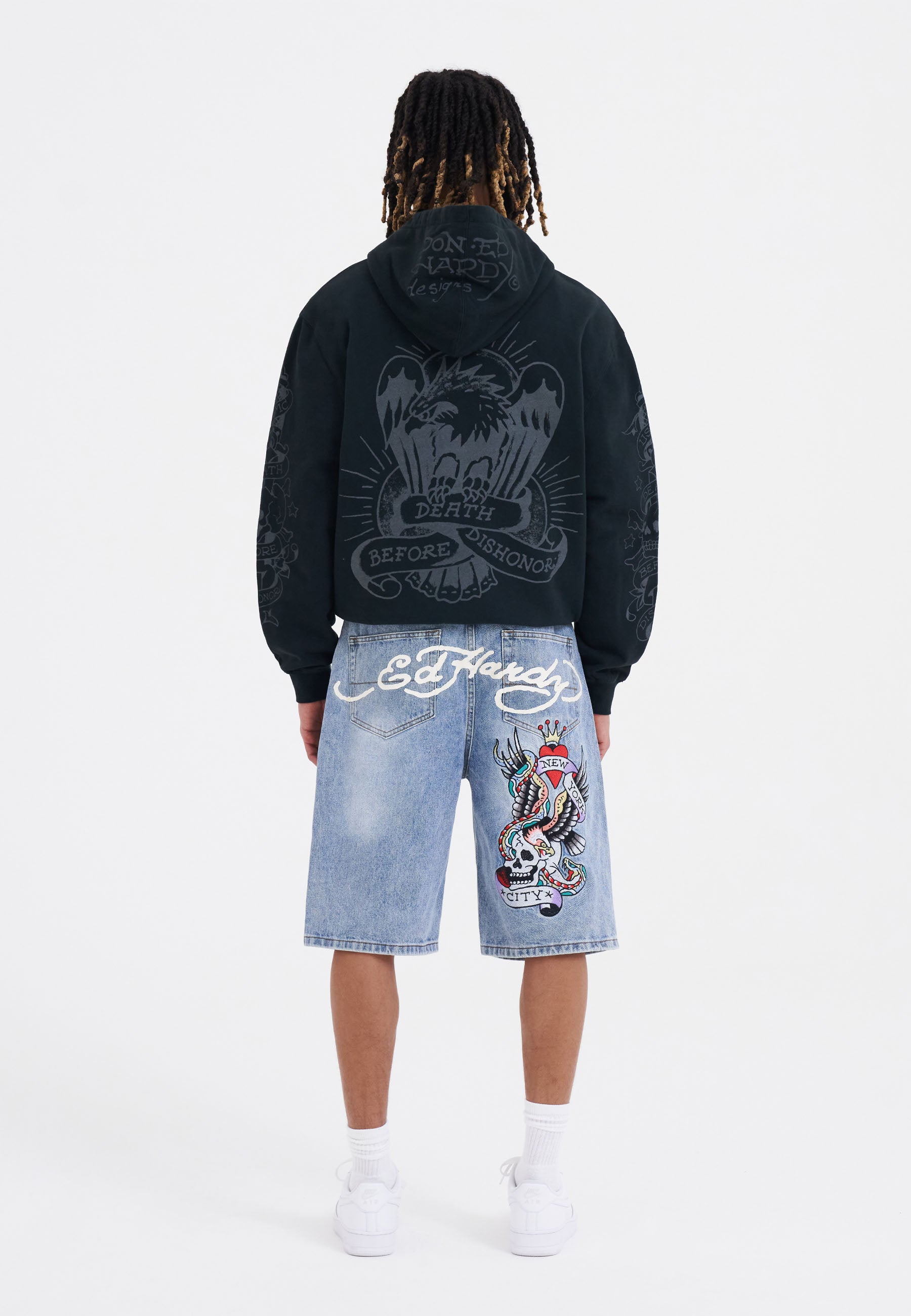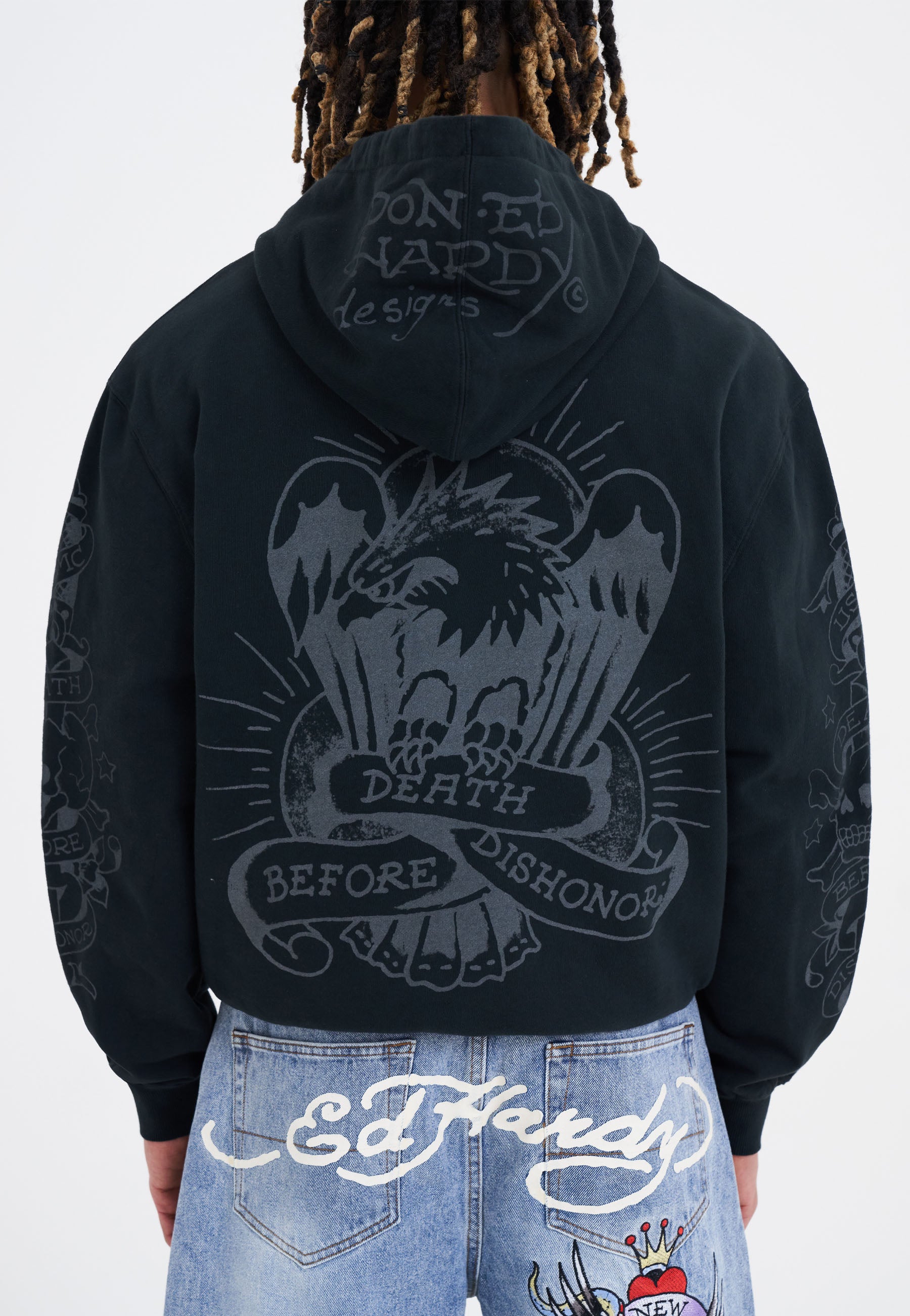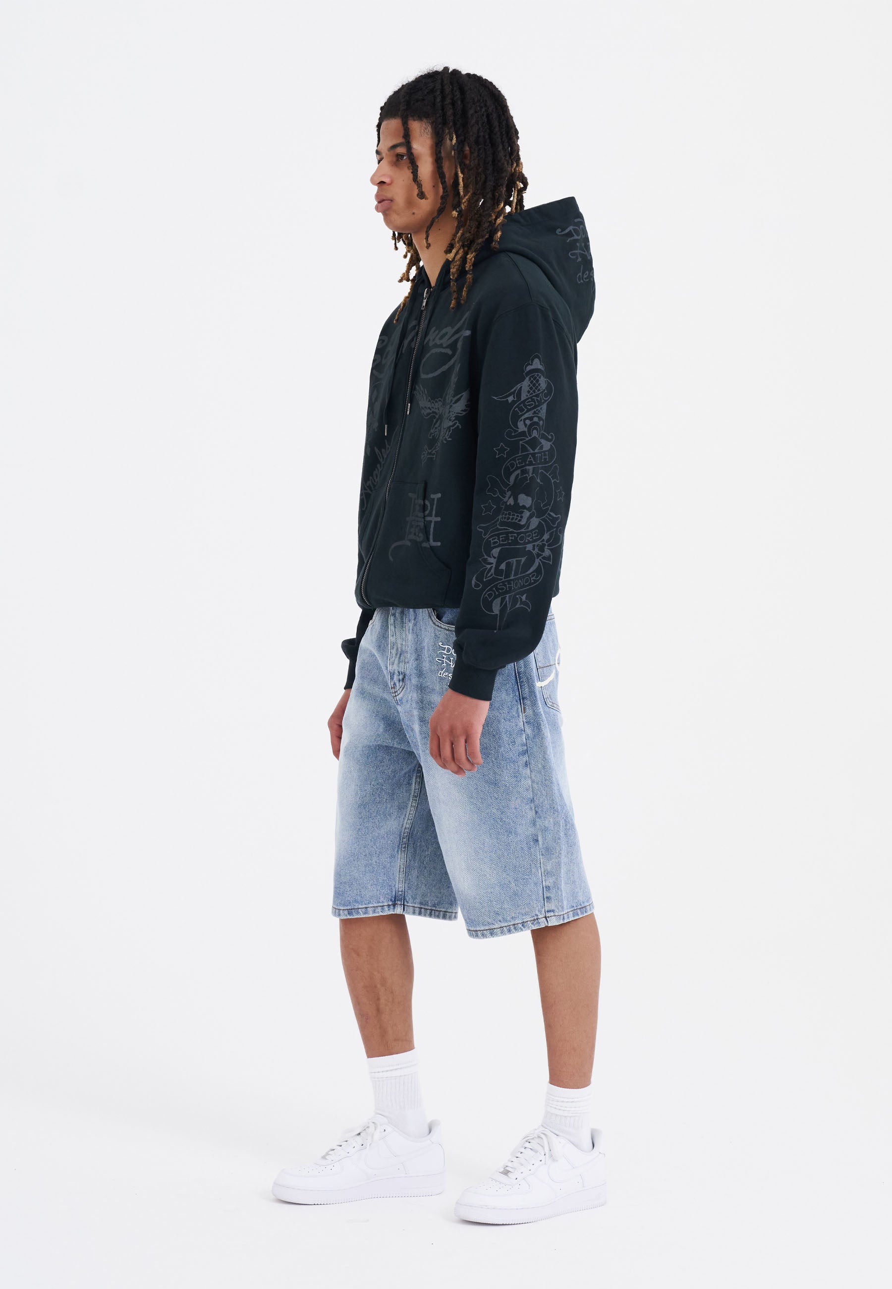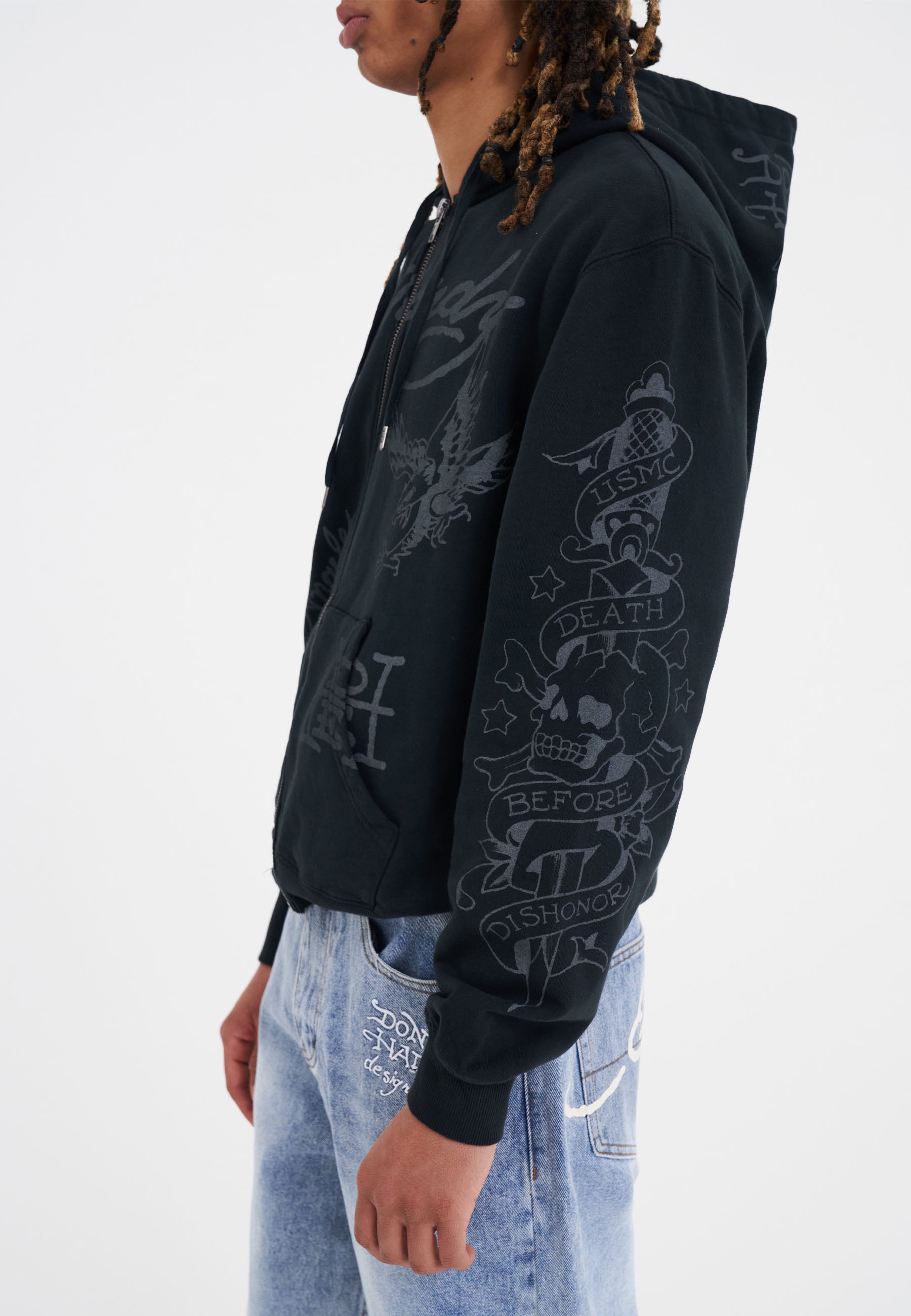 Denne jakke har forskellige fantastiske Ed Hardy-tatoveringsdesigns på tværs af fronten samt Ed Hardys ikoniske logo hen over brystet, alt i hvidt, og repræsenterer virkelig DEHs indflydelse på tatoveringsindustrien og dermed streetwear.