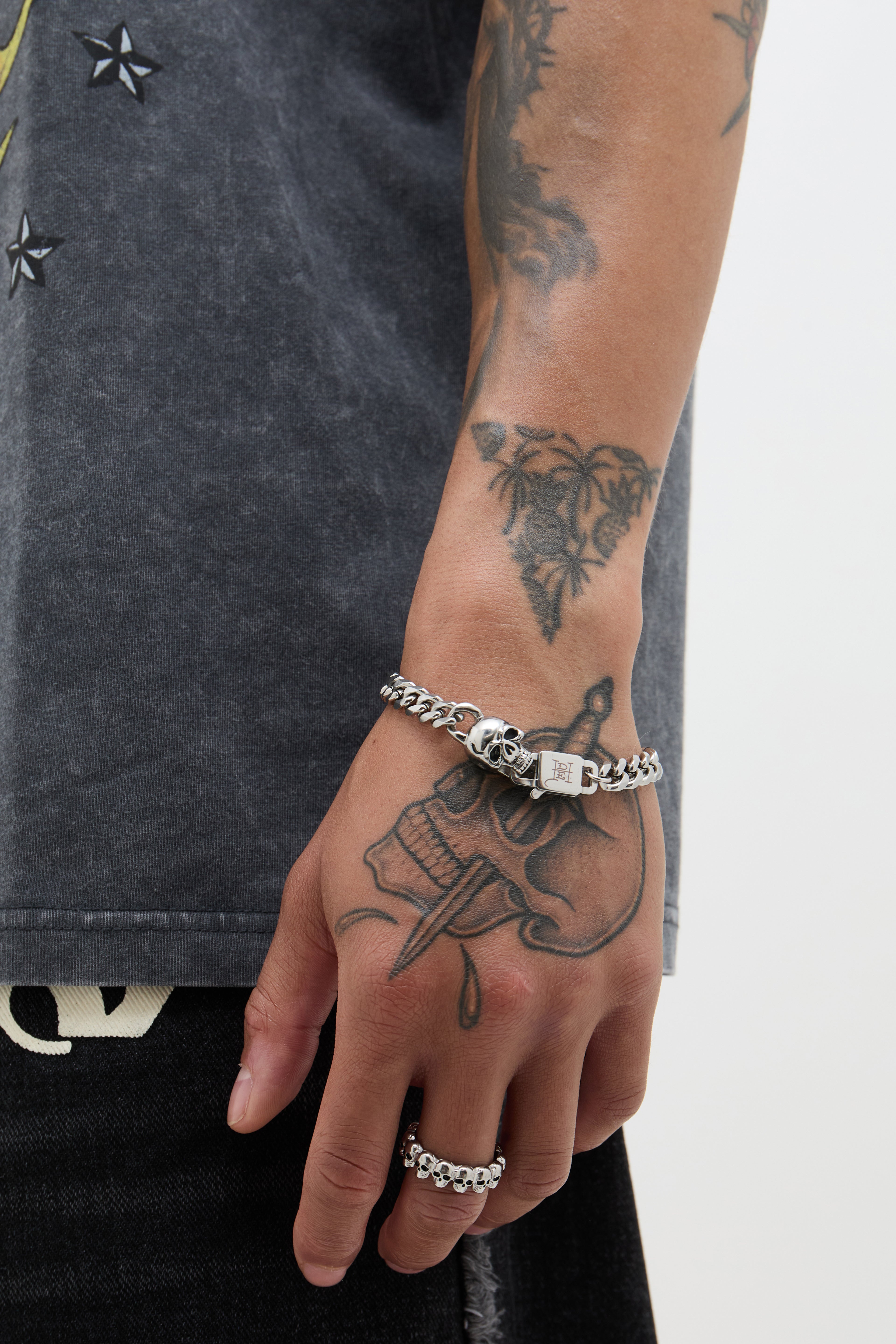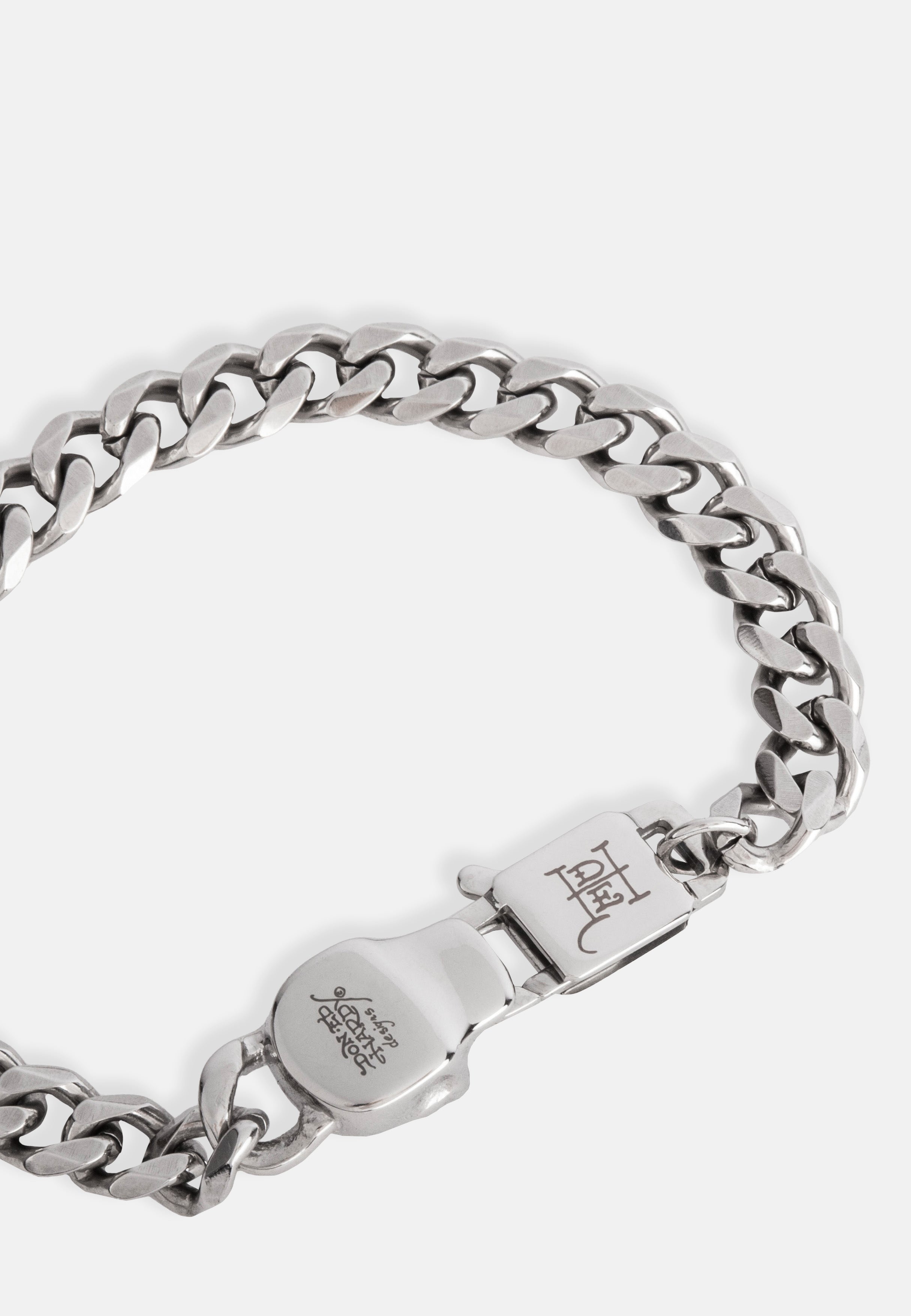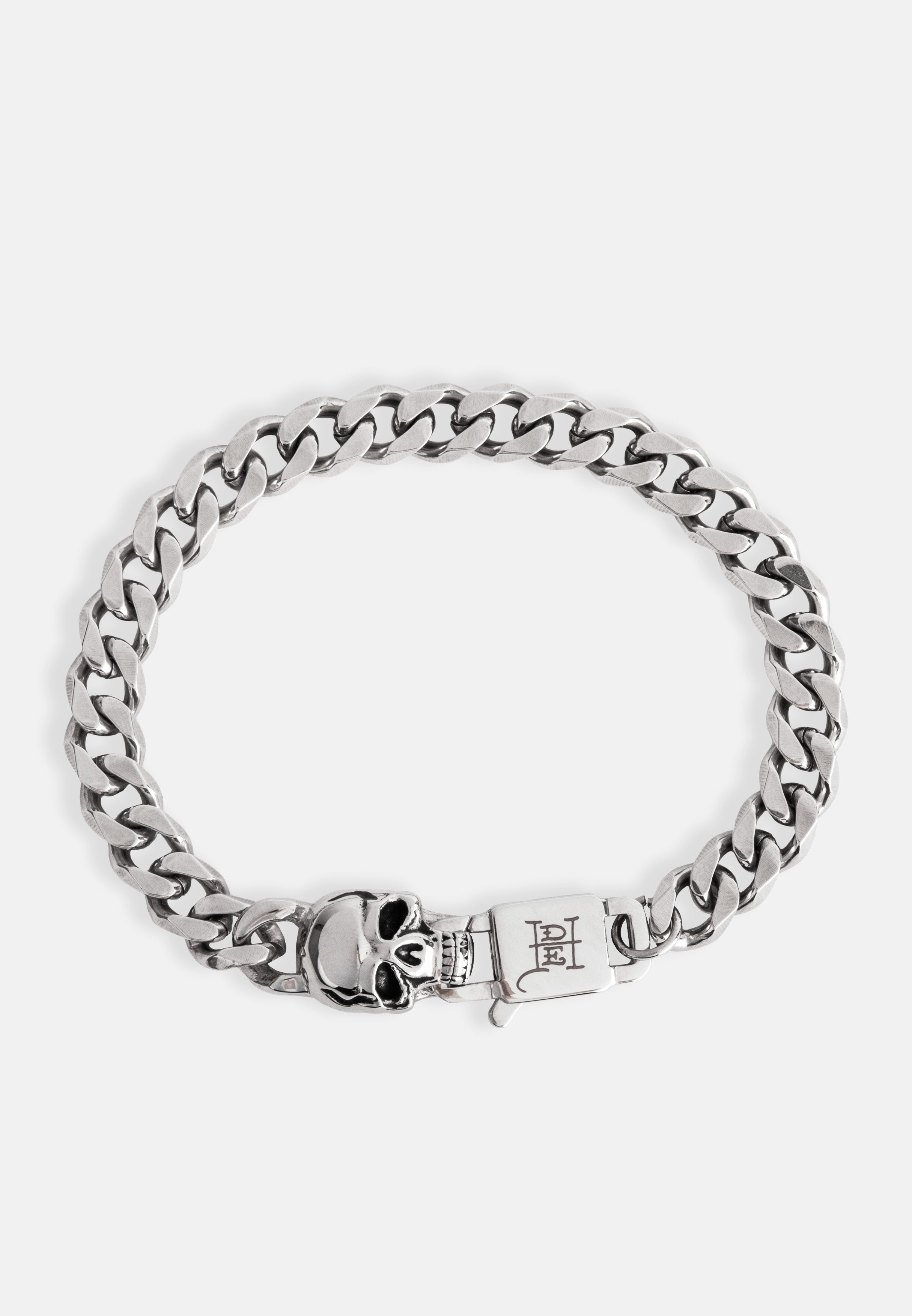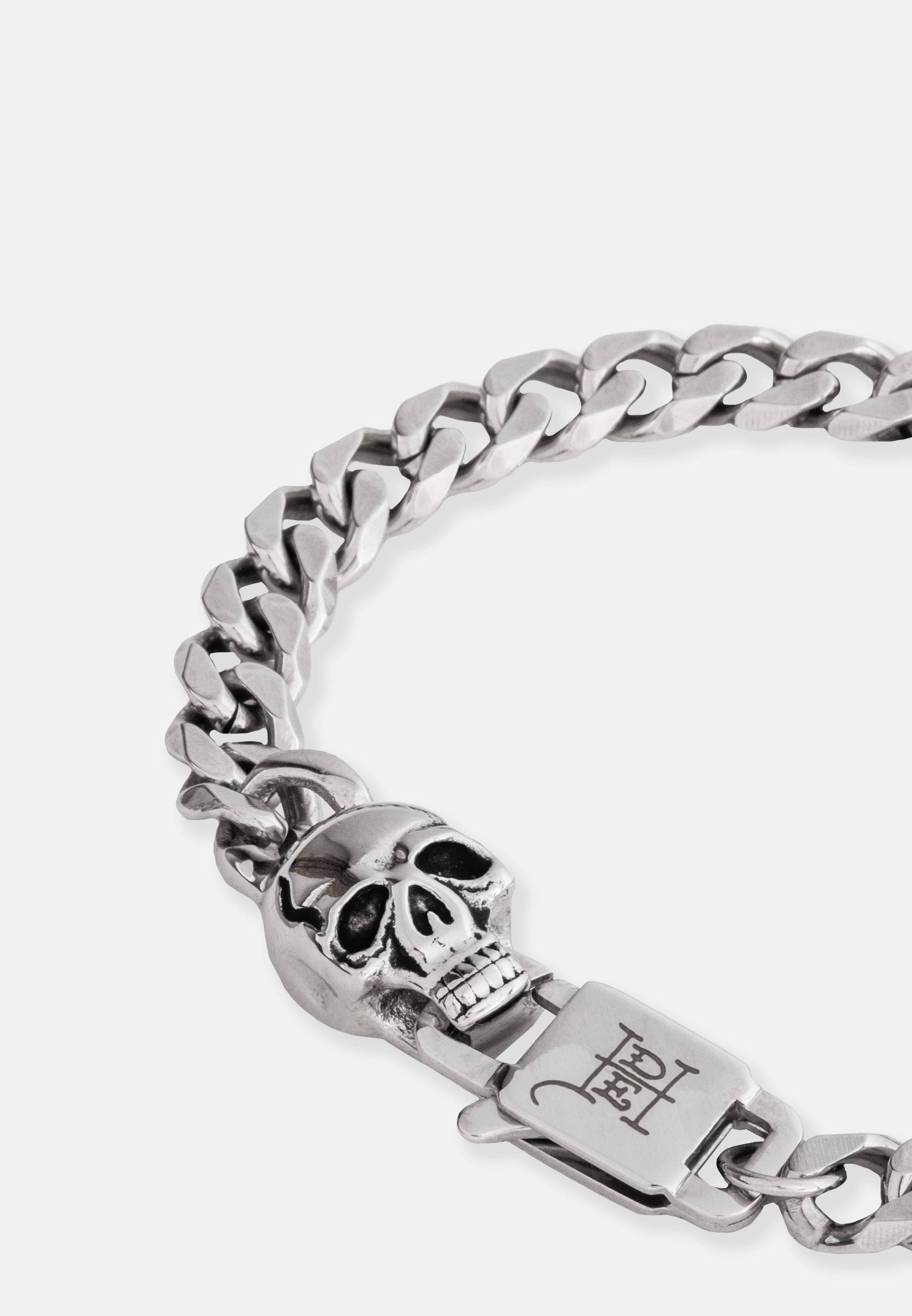 Chunky curb chain bracelet with 3D Skull charm and clasp. Hand finished in an antique silver finish.