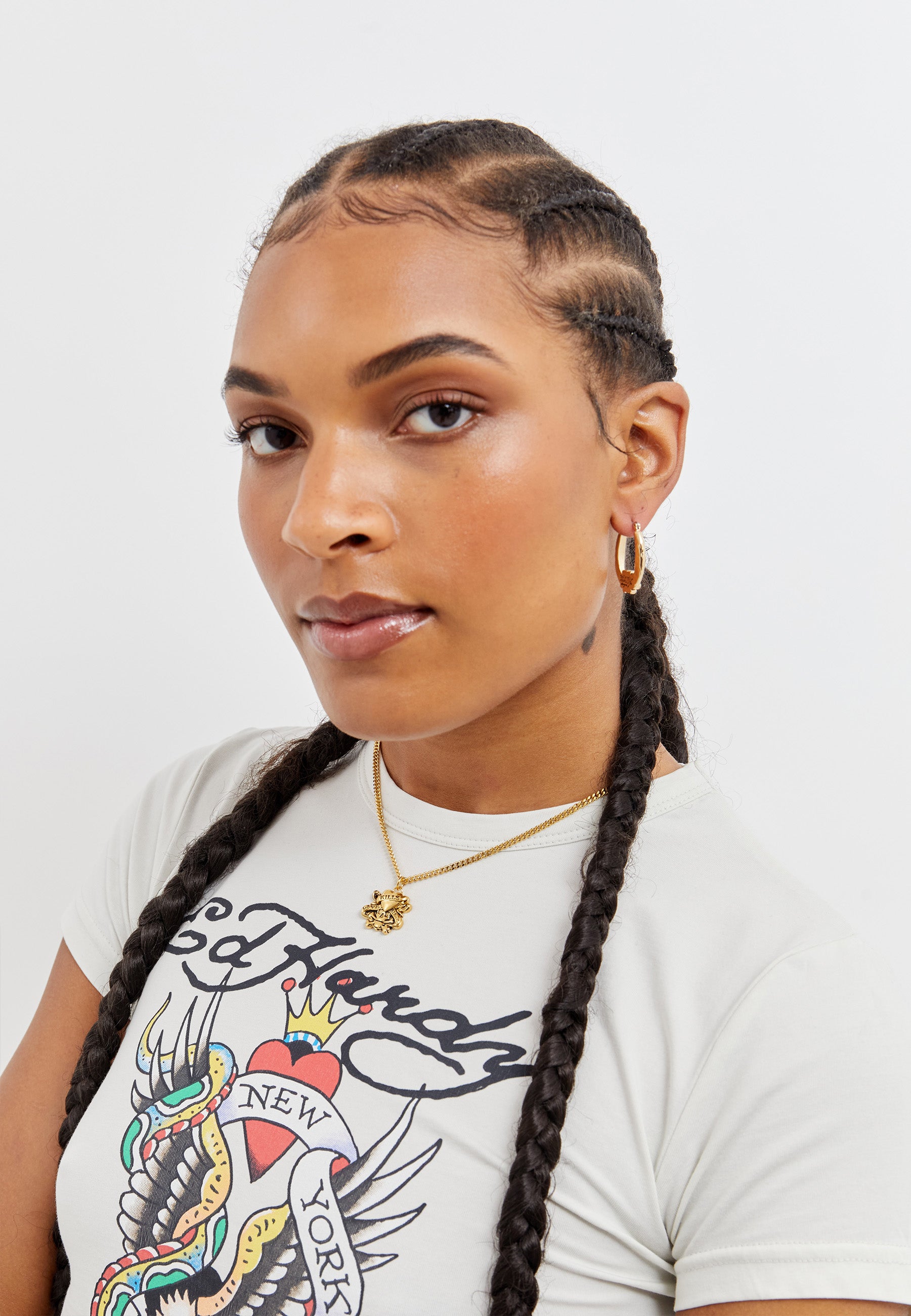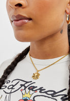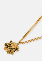 Ed Hardy 3mm flat curb chain necklace with custom cast Don Ed Hardy 'Love Kills Slowly' Skull and heart tattoo design pendant, hand finished in a gold finish with antiqued engraved detailing.