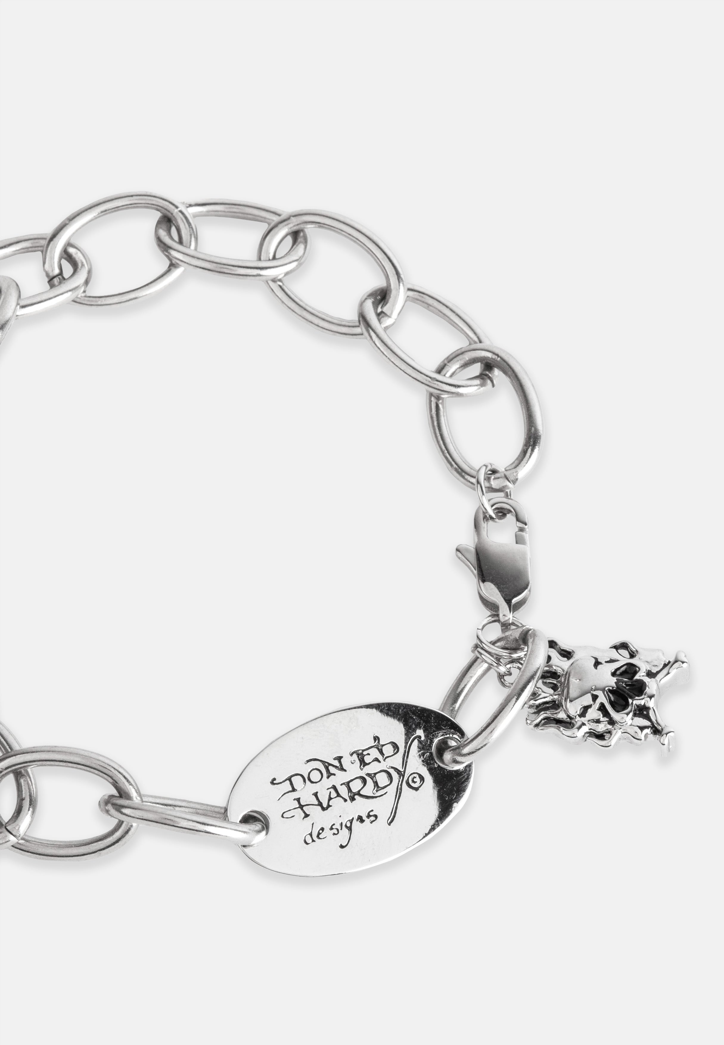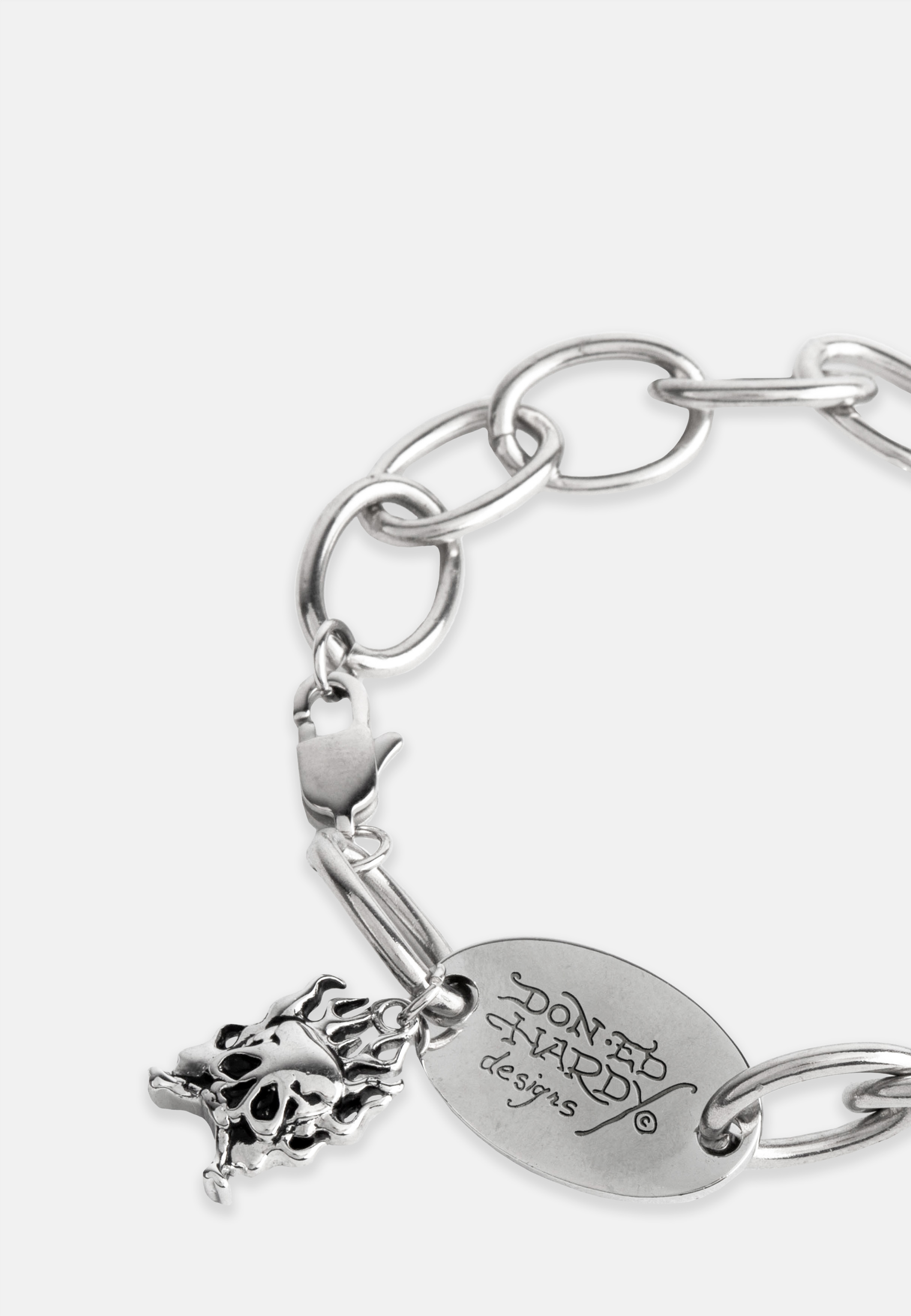 Stainless Steel think oval link chain bracelet with Oval Don Ed Hardy charm, safety pin and Flaming Skull charm in a silver finish.