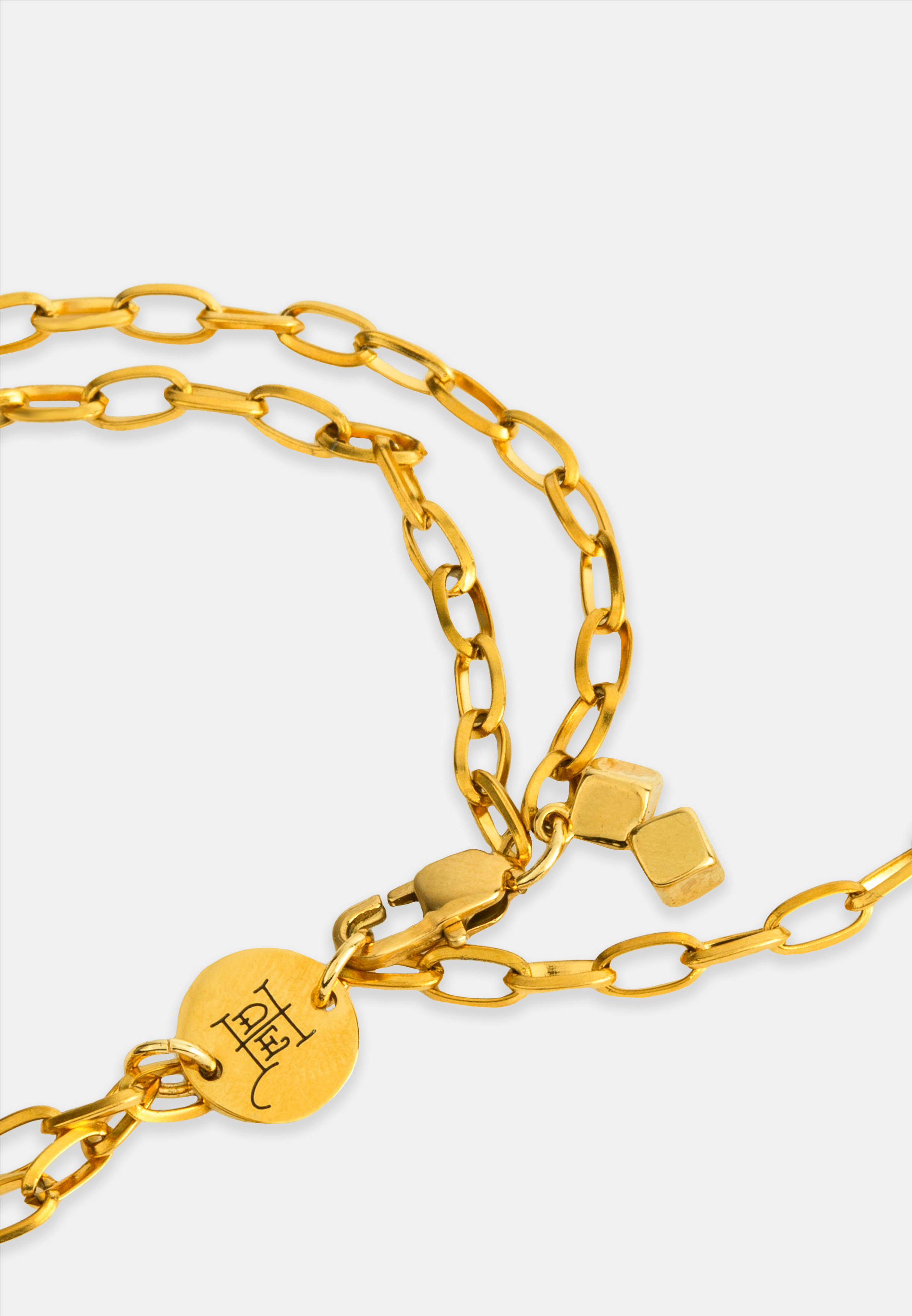 Double row oval link bracelet with custom cast Ed Hardy logo, Dice charm and Flaming Heart Charms hand finished in an antique gold finish.
