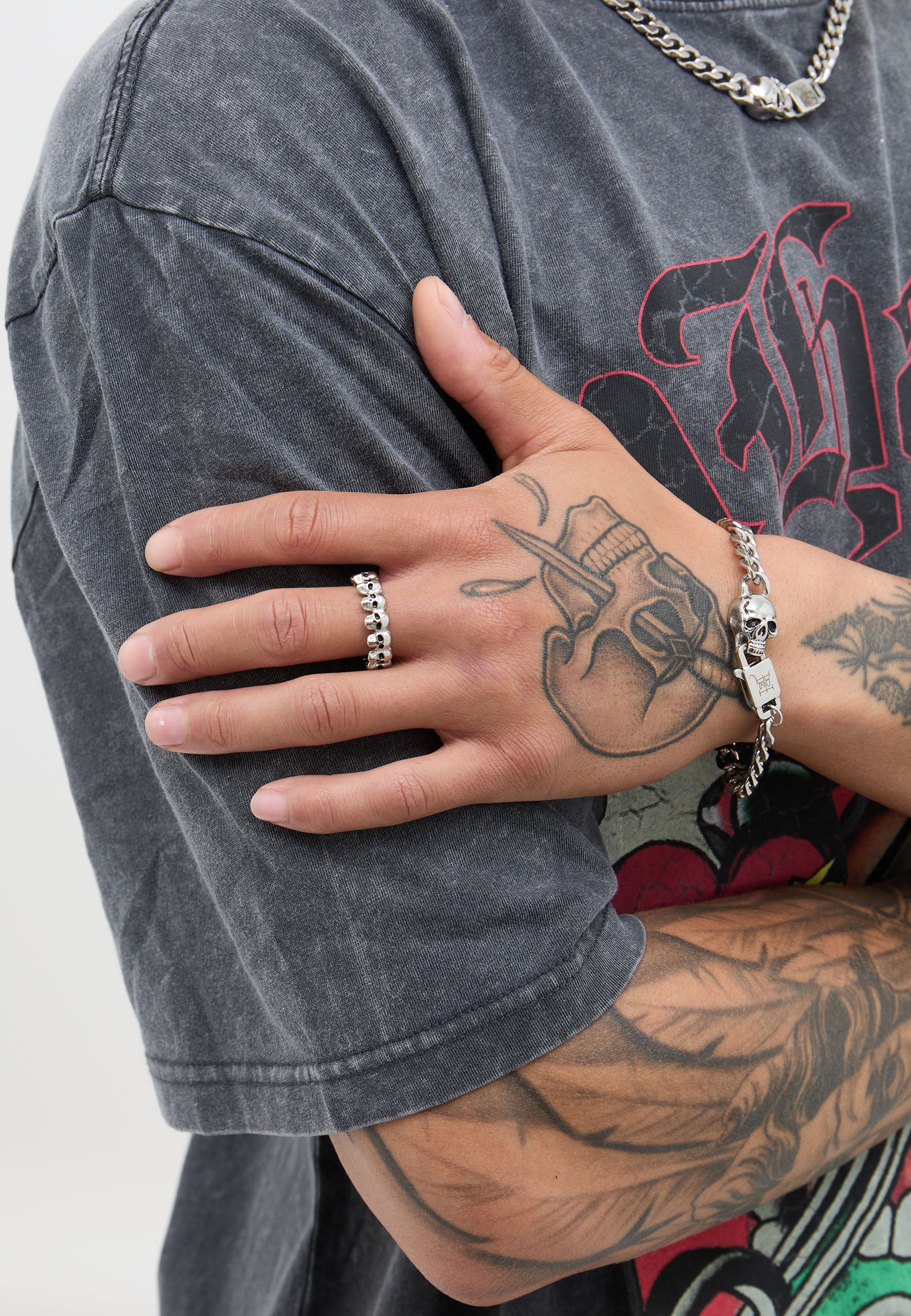 Custom cast 3D Ed Hardy Skulls band ring, hand finished in an antique silver finish.