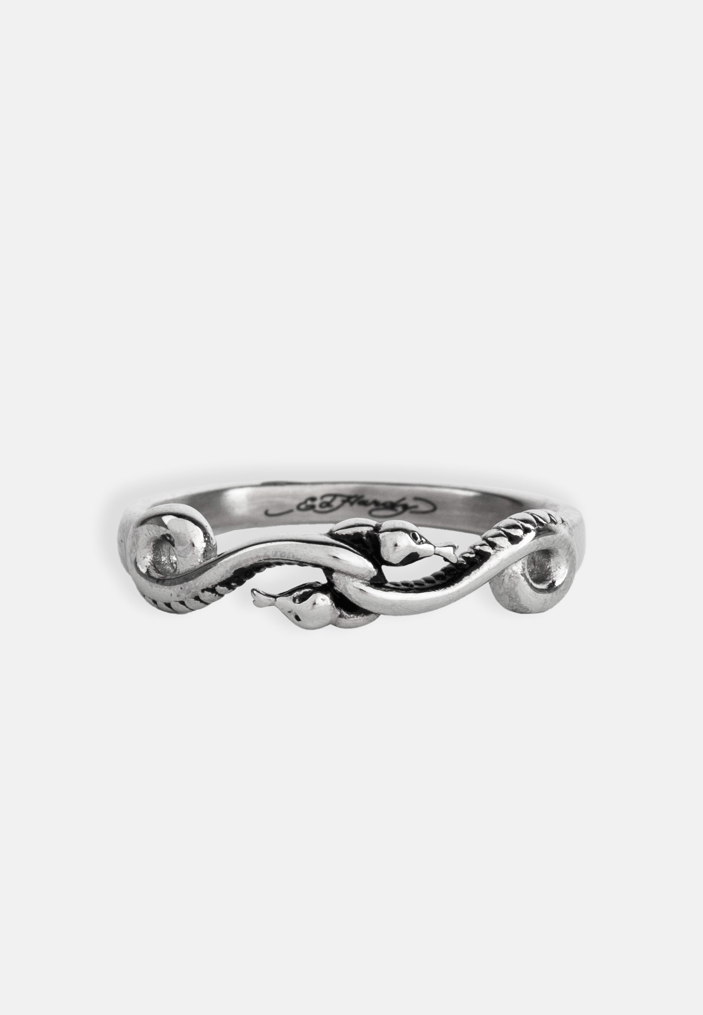 Fine stainless steel band ring with crossed Snake intricate design in a silver finish.
