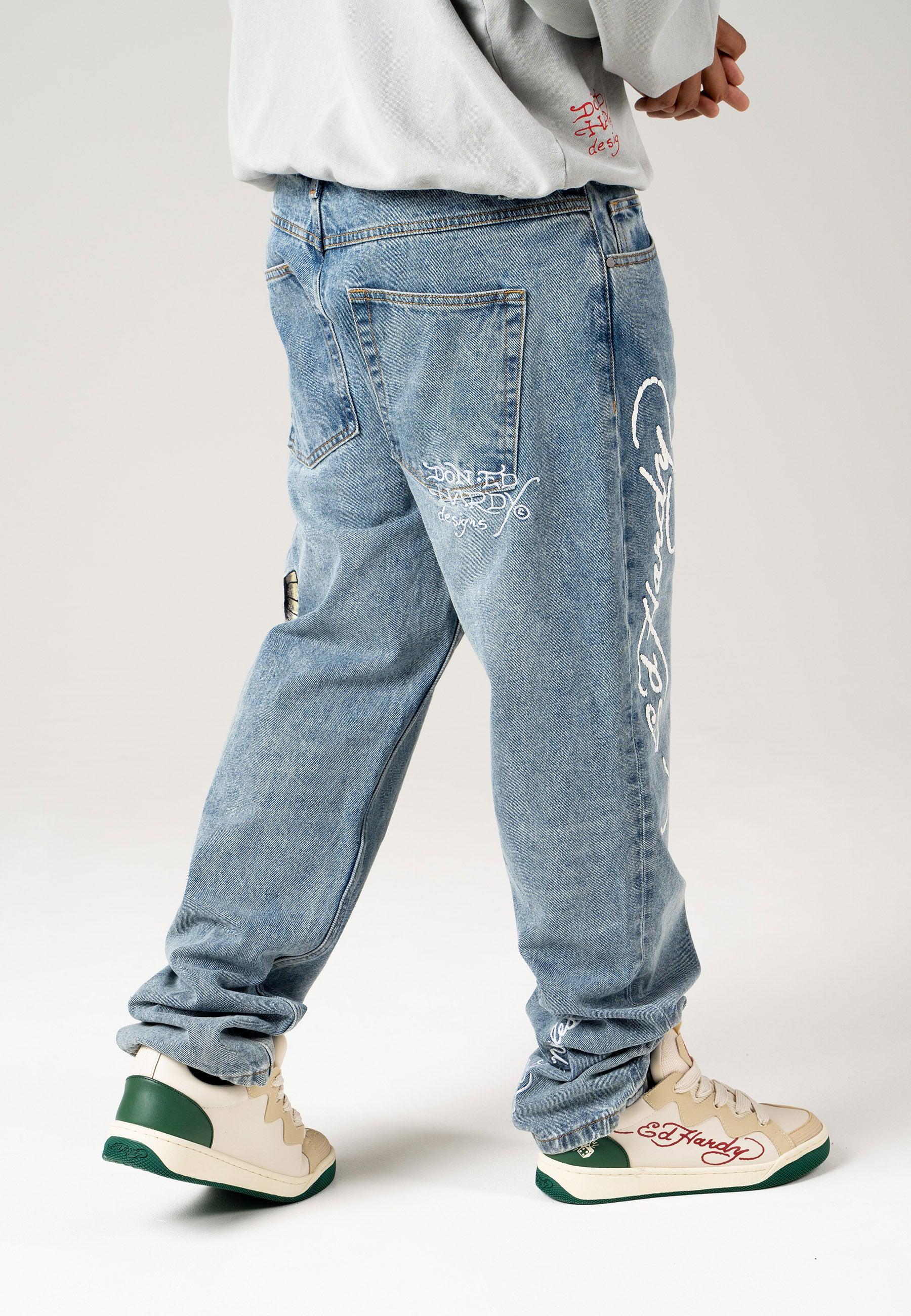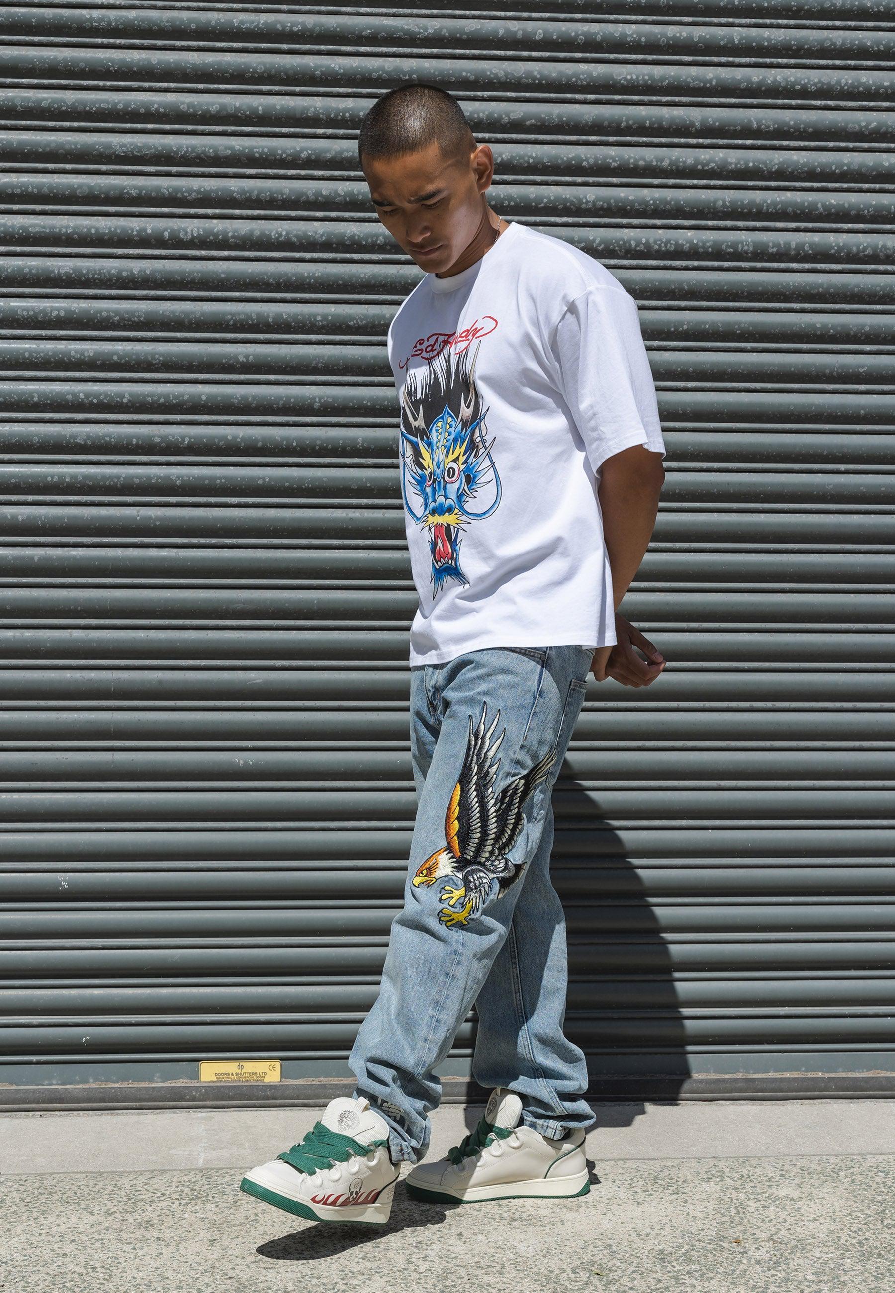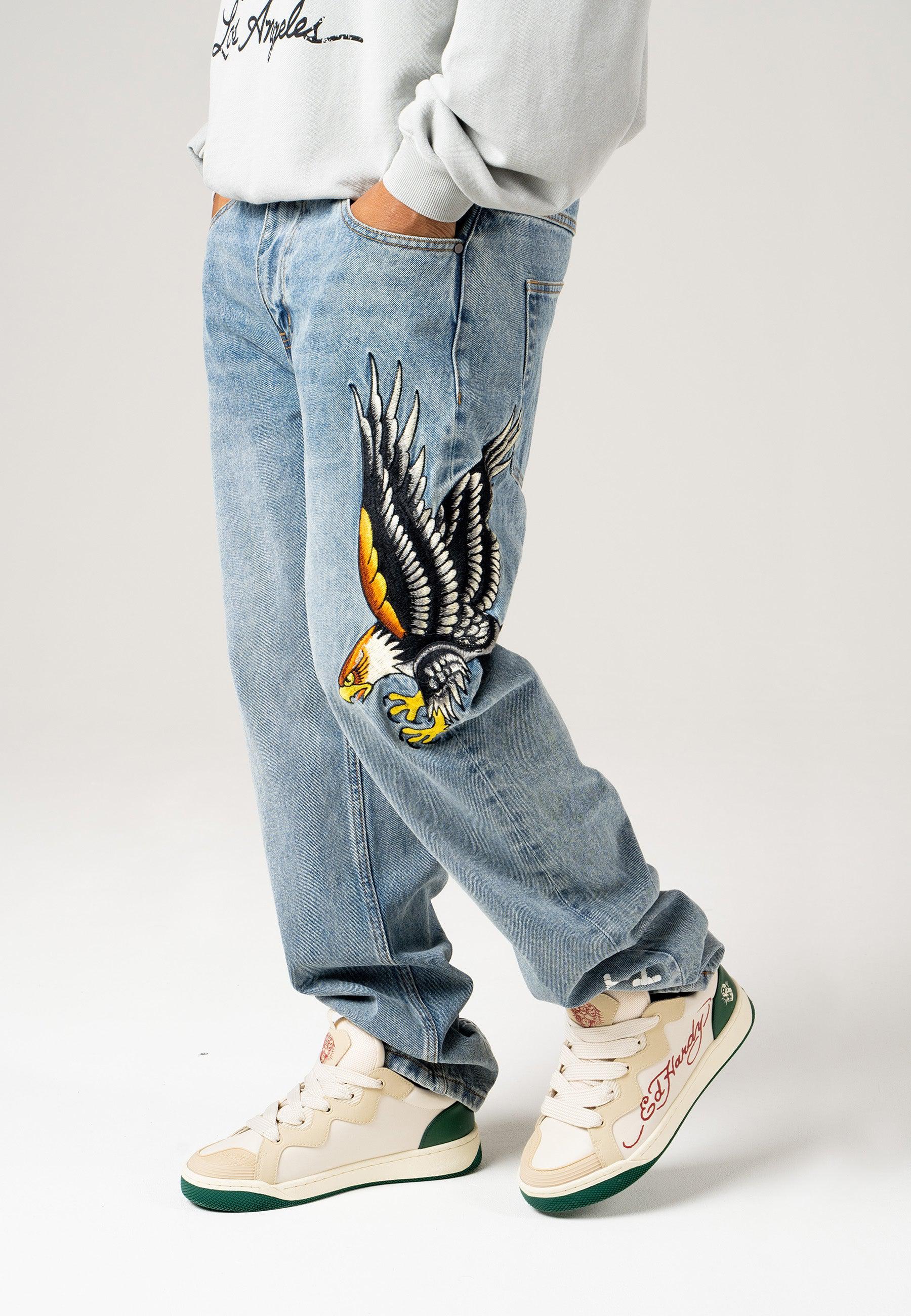 Herre Golden-Eagle Tattoo Grafiske Denim Bukser Jeans - Bleach