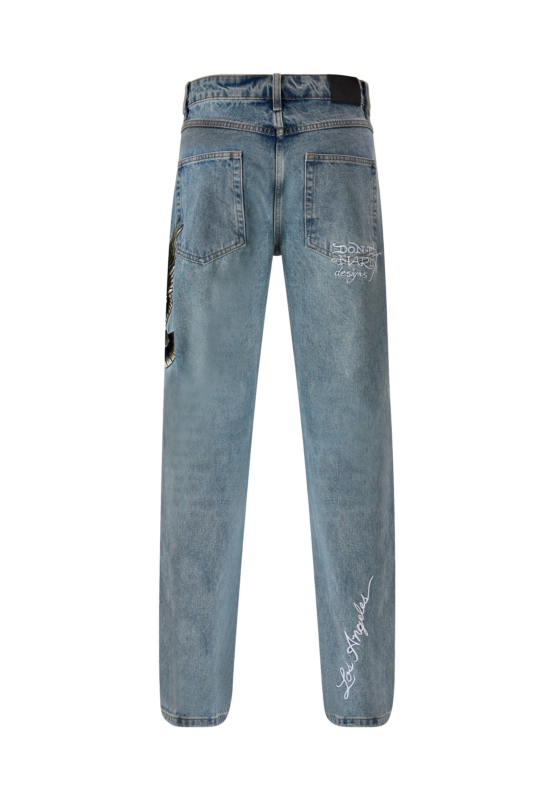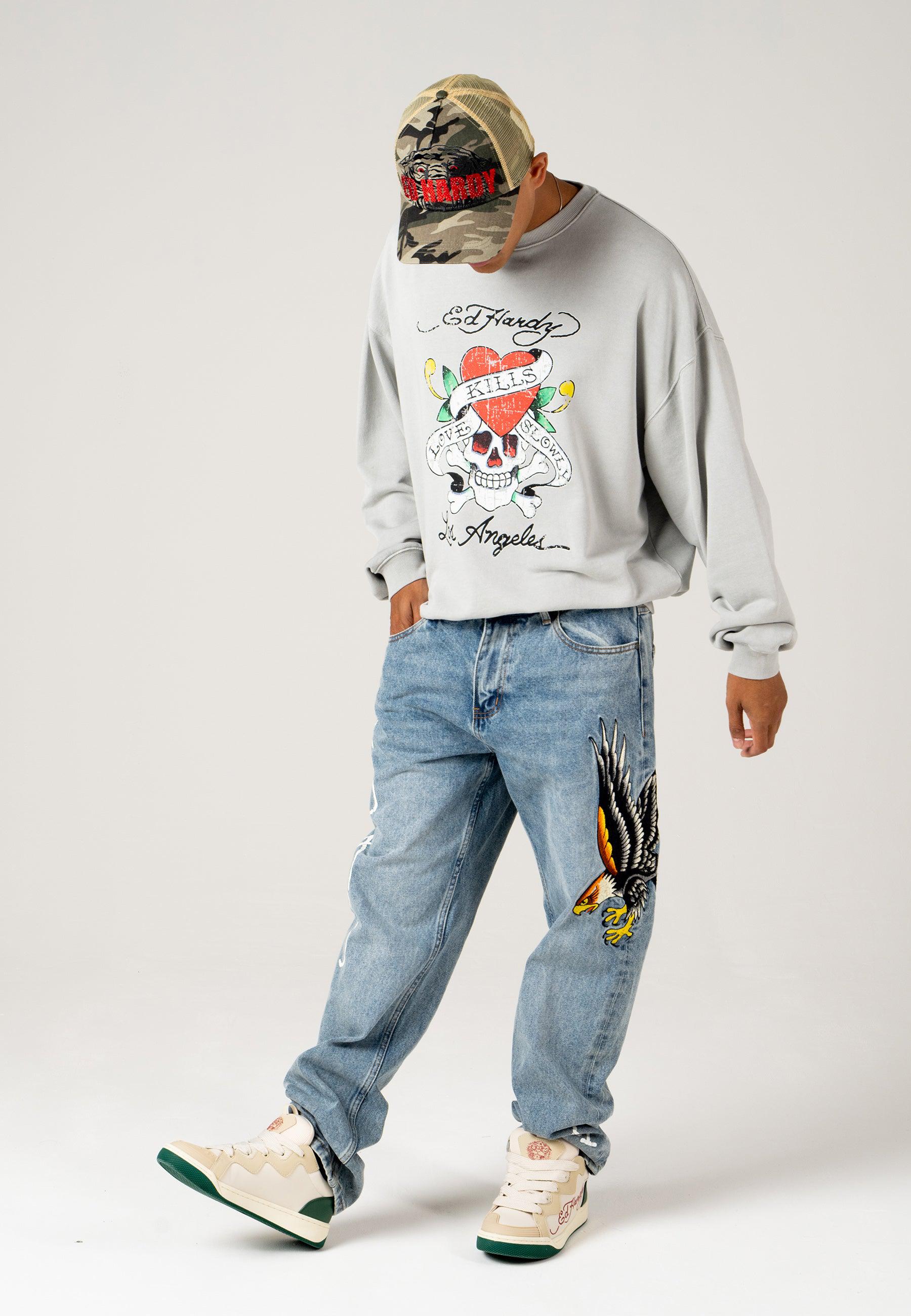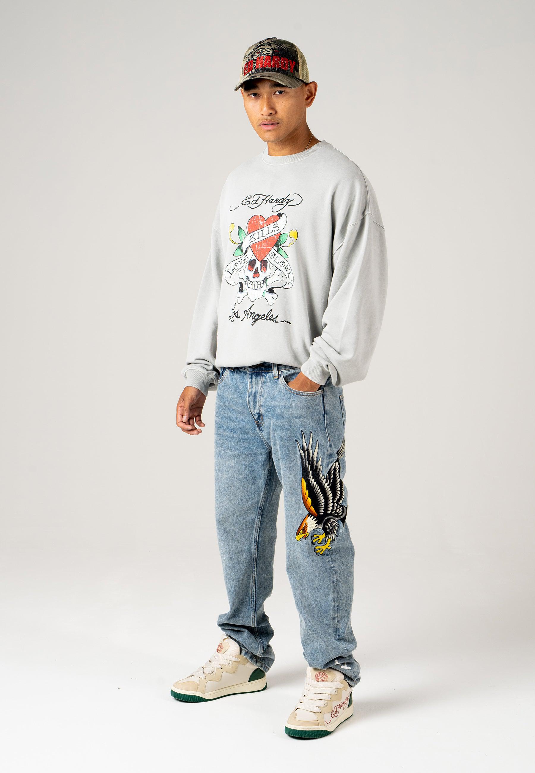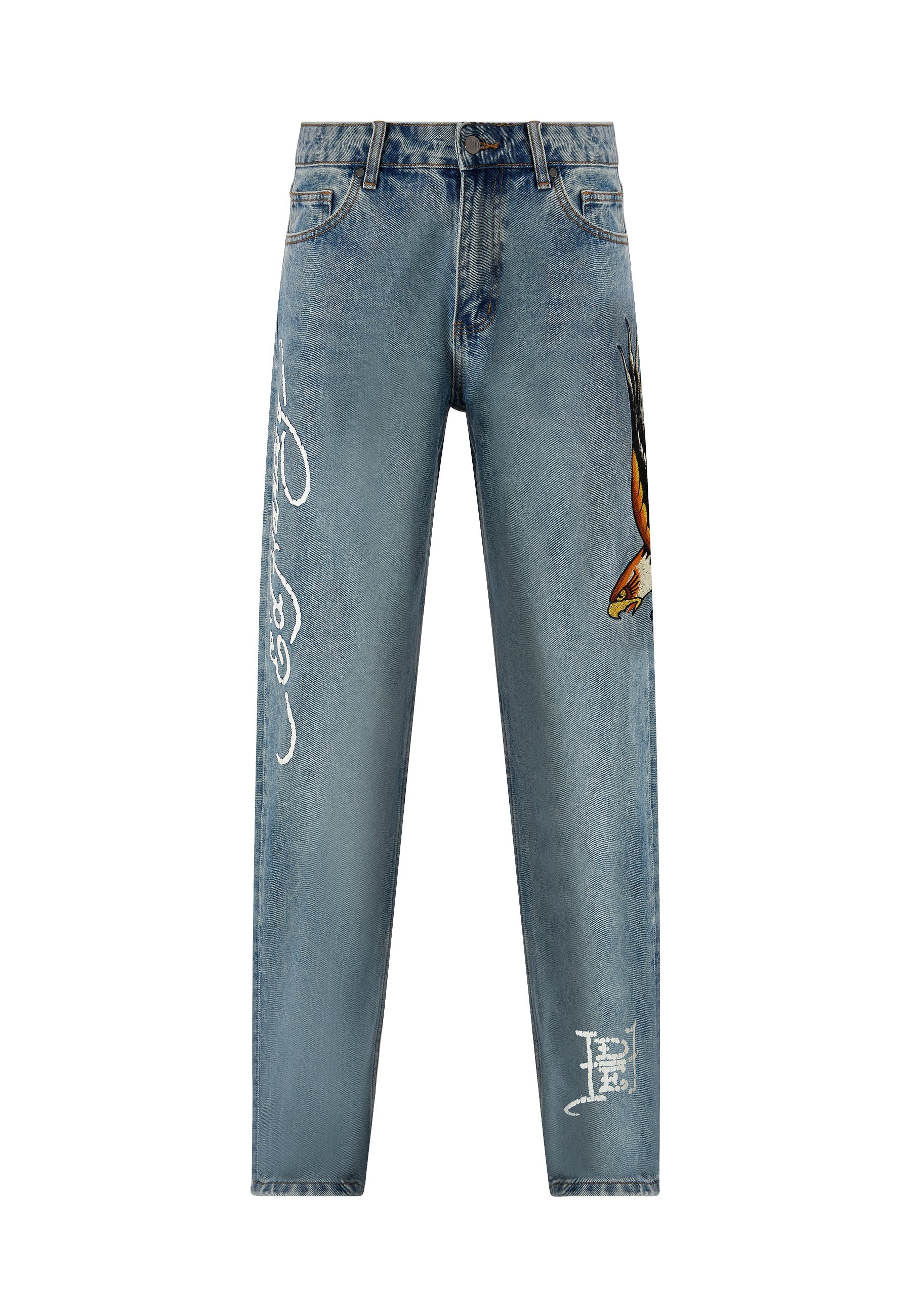 Herre Golden-Eagle Tattoo Grafiske Denim Bukser Jeans - Bleach