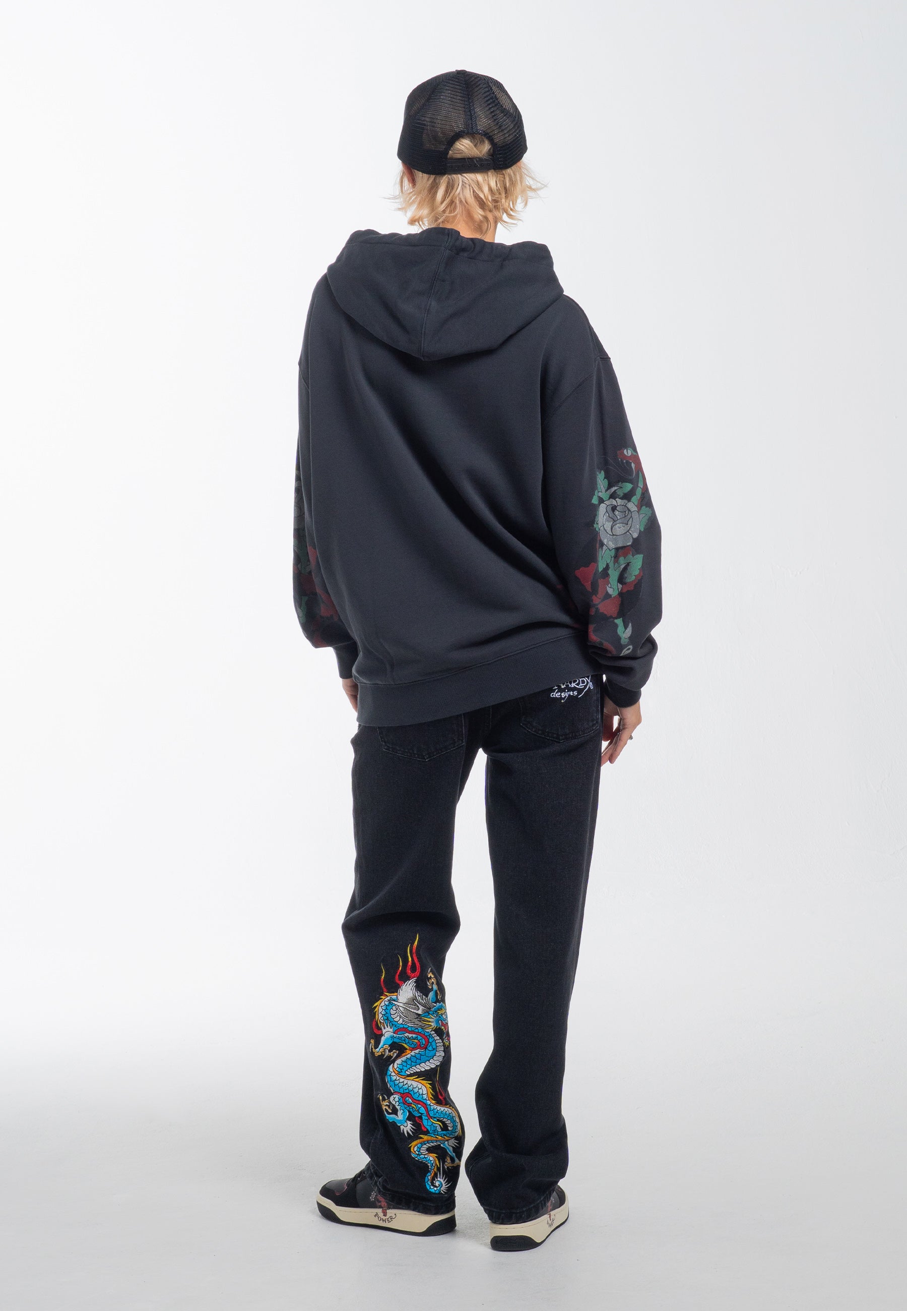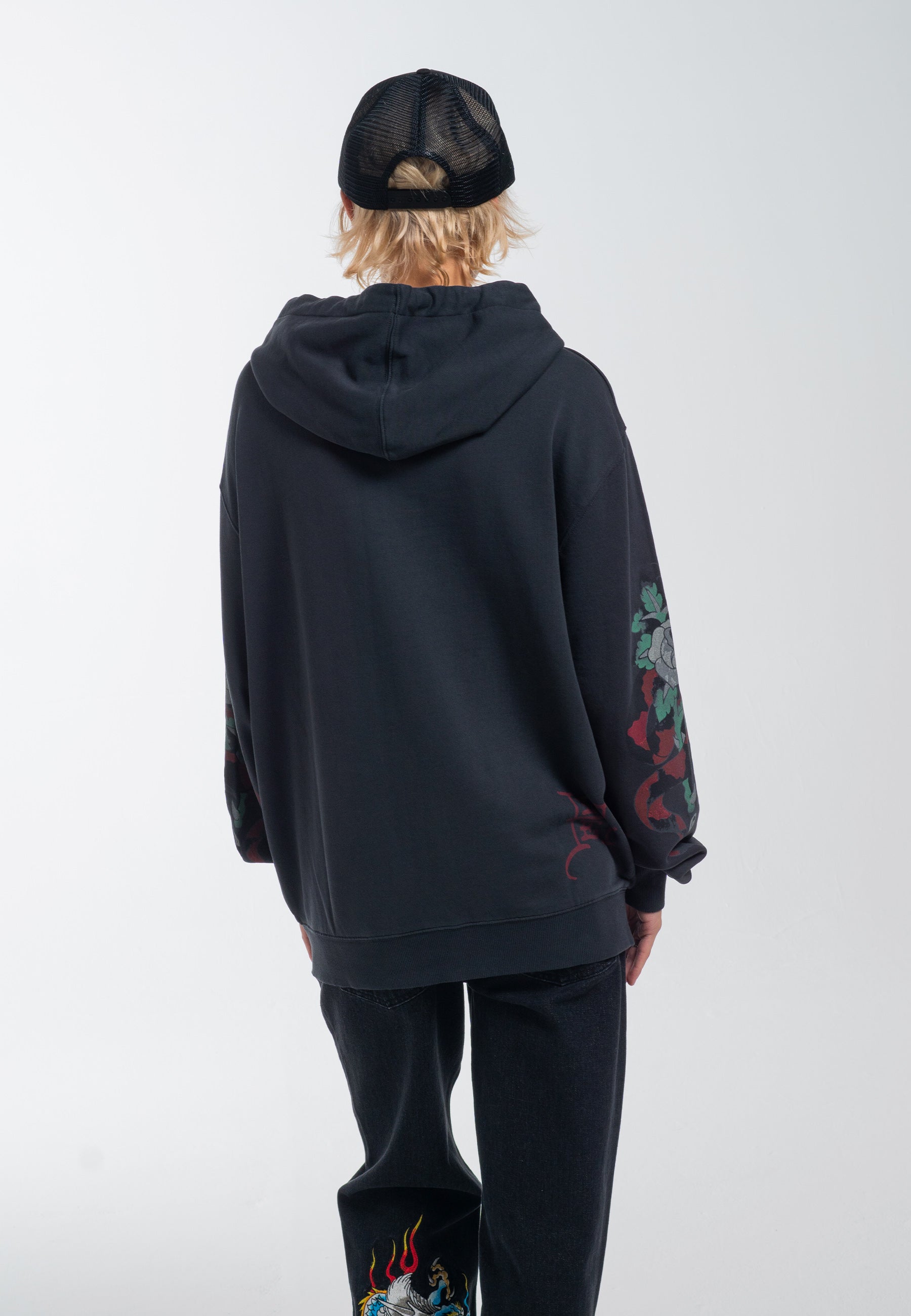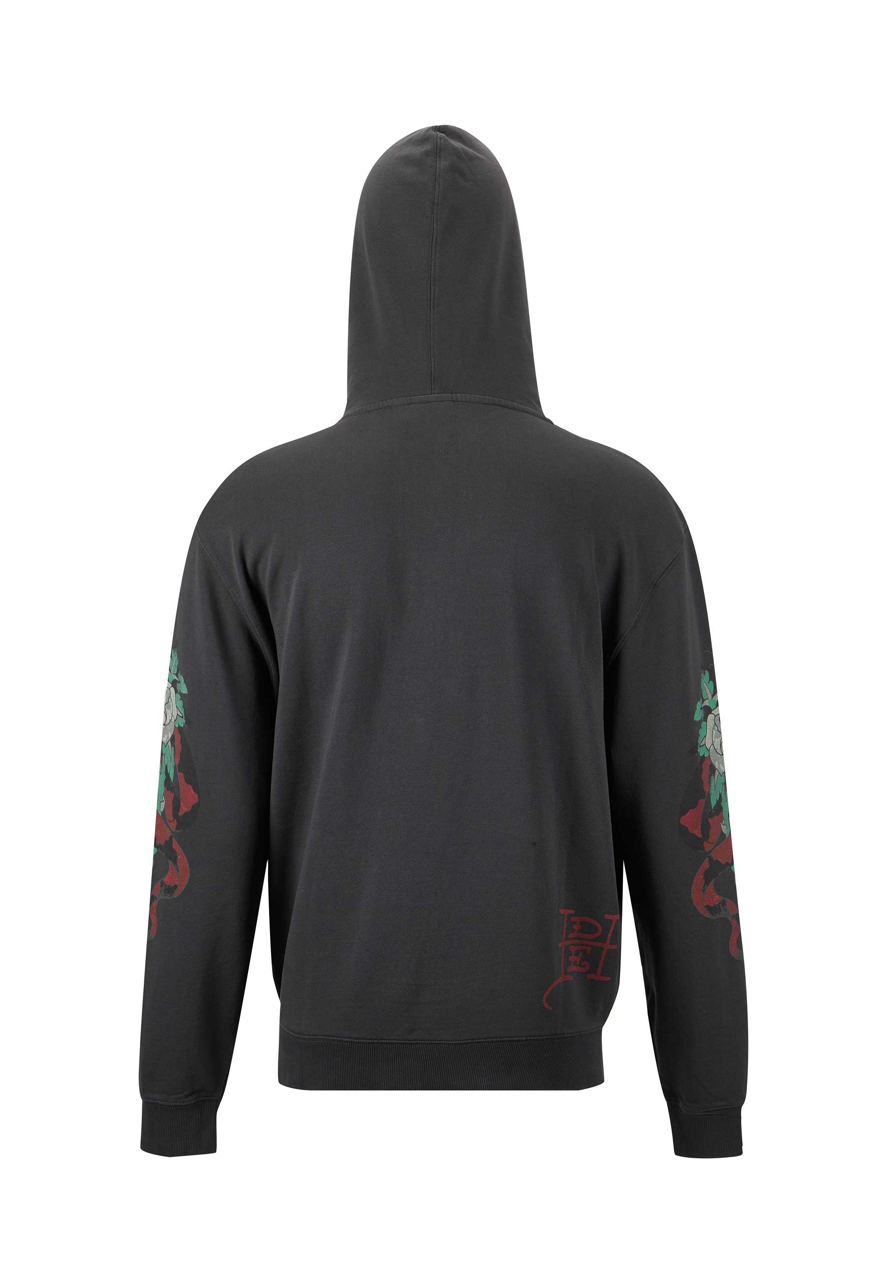 - Large Ed Hardy Signature-logo på tværs af ryggen og monogramlogoer langs falden