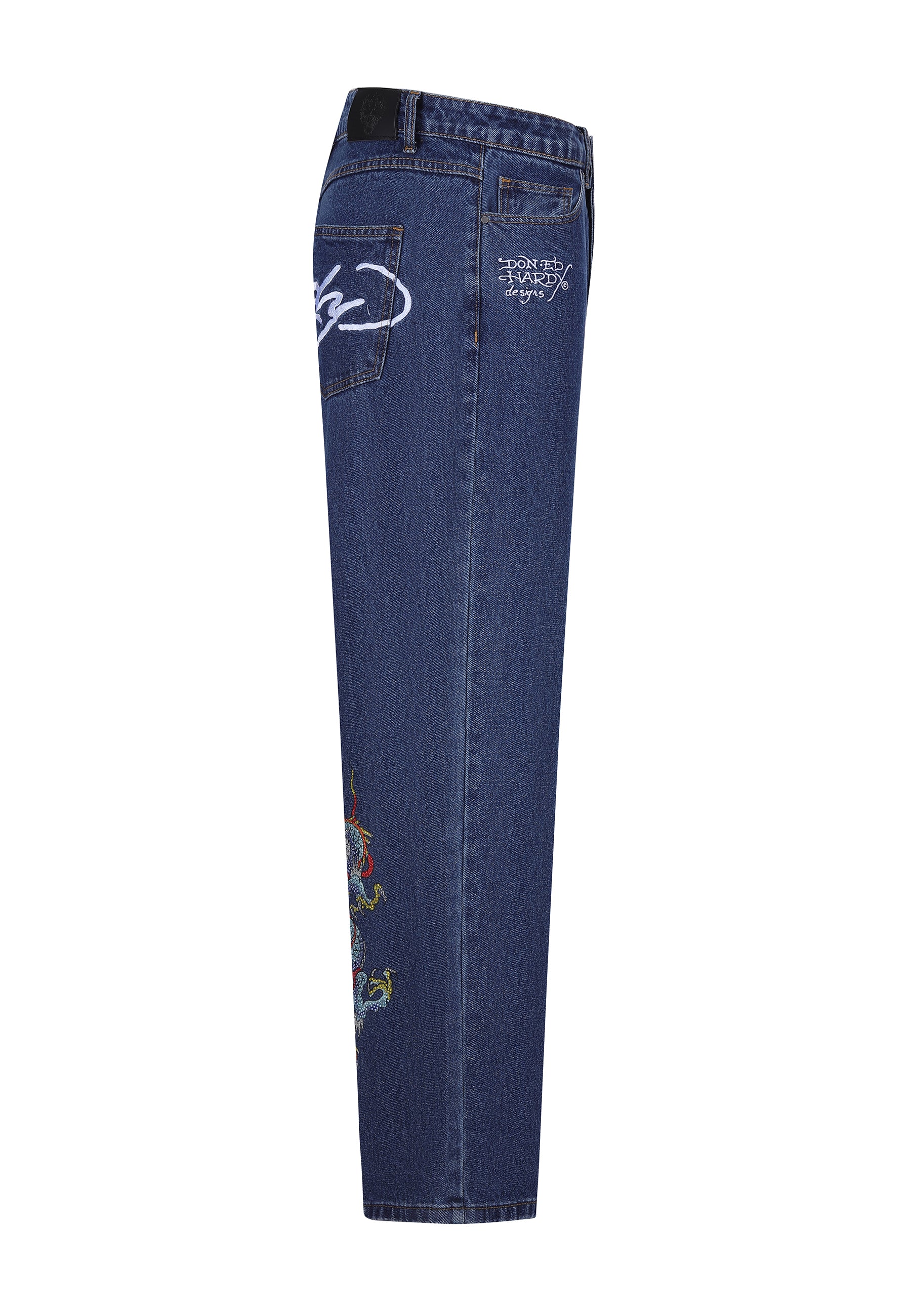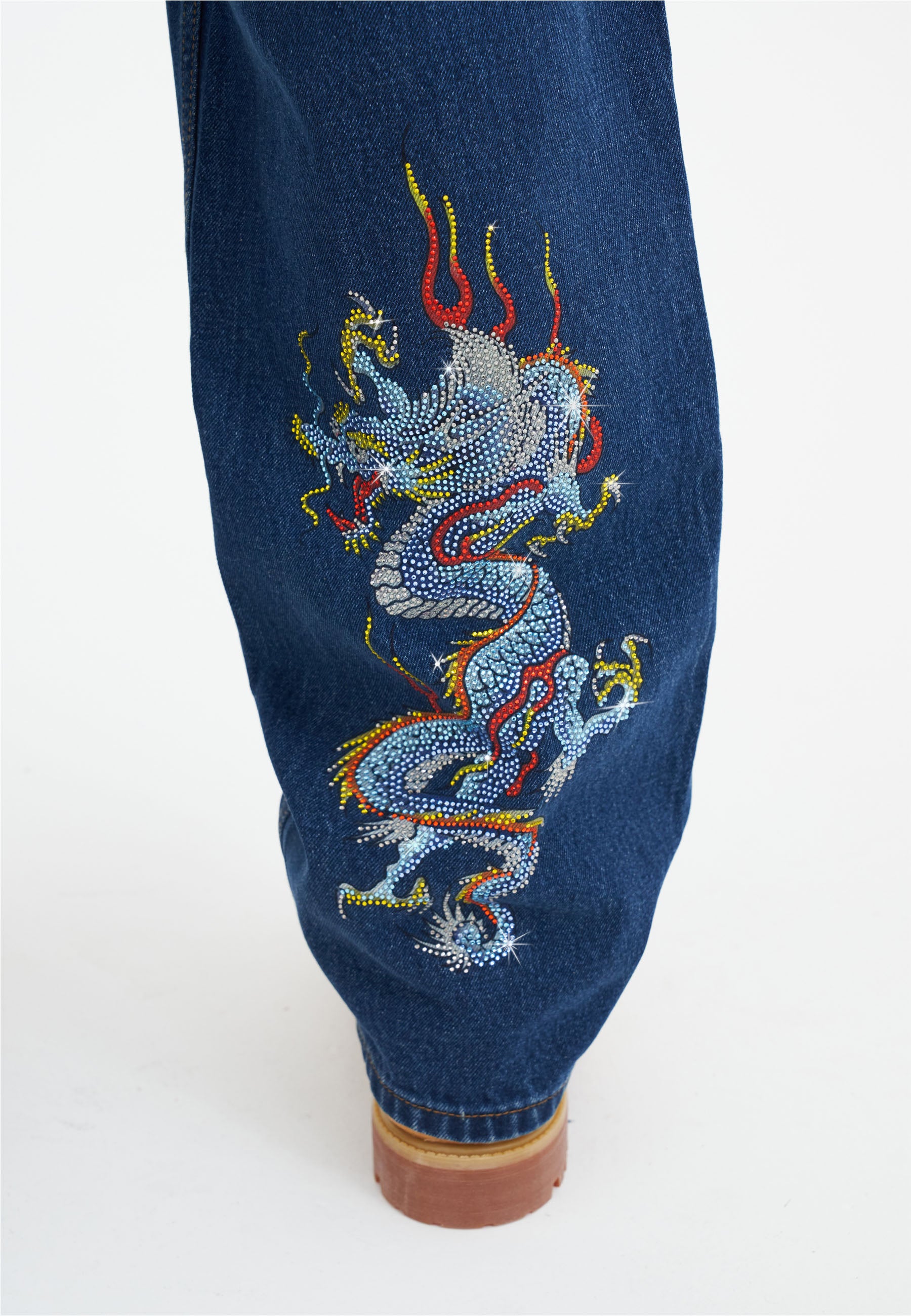 Mød Battle Dragon Jean, et levende vidnesbyrd om innovativt design, der byder på slagkraftige, fuldfarvede diamantkunstværker på tværs af benet og omvendt.
