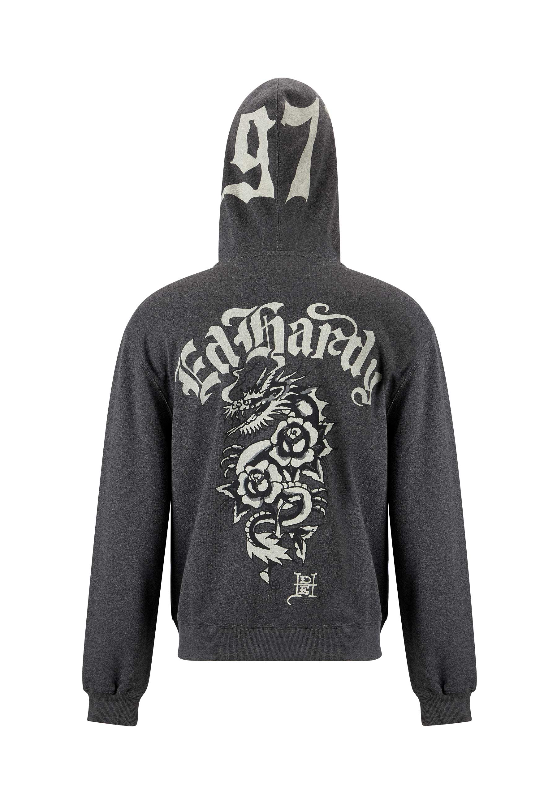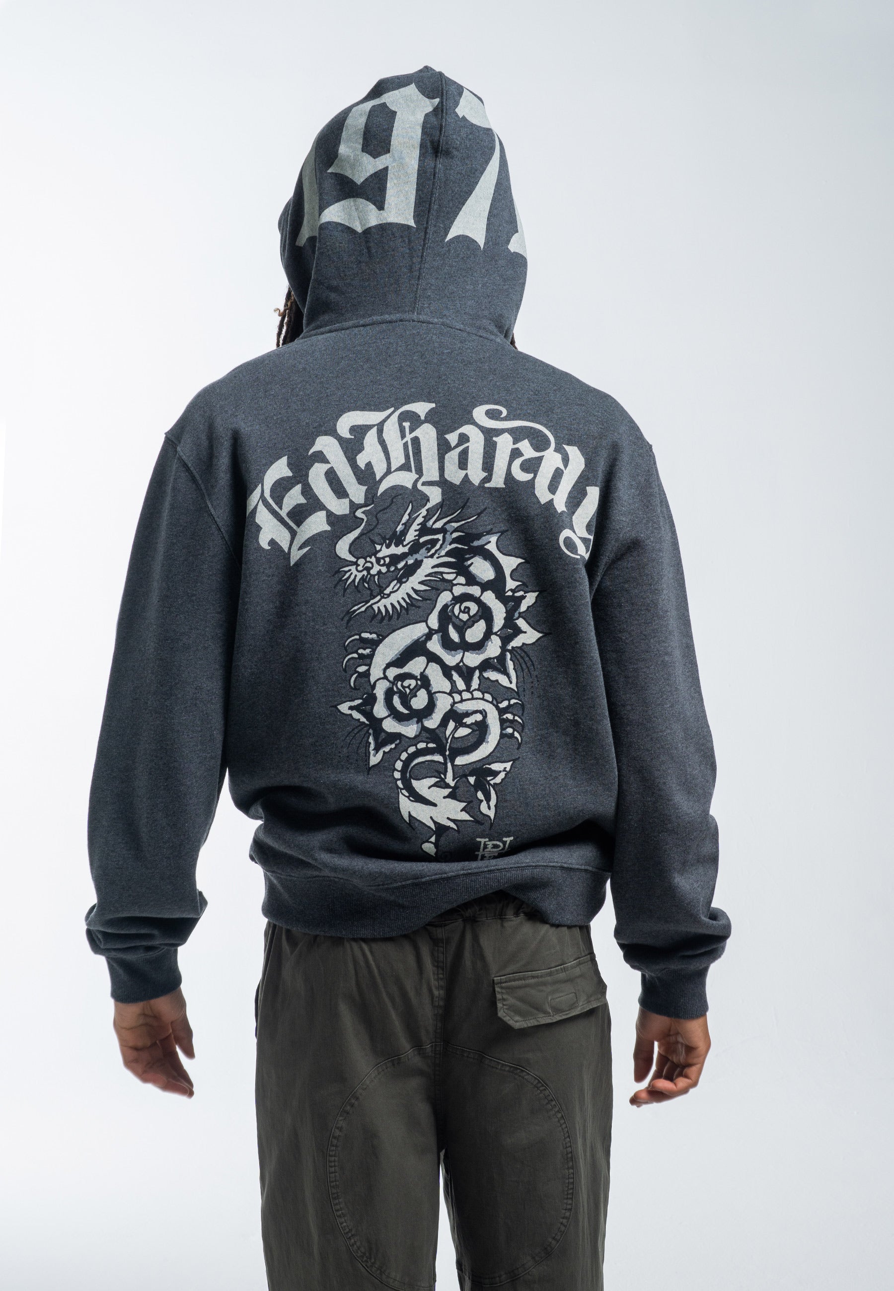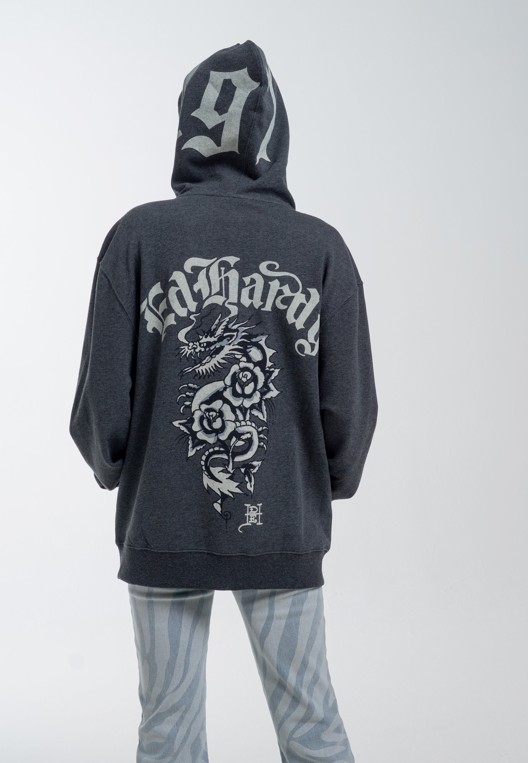 Herre Dragon Rose Zip Through Hoodie - Charcoal Merl