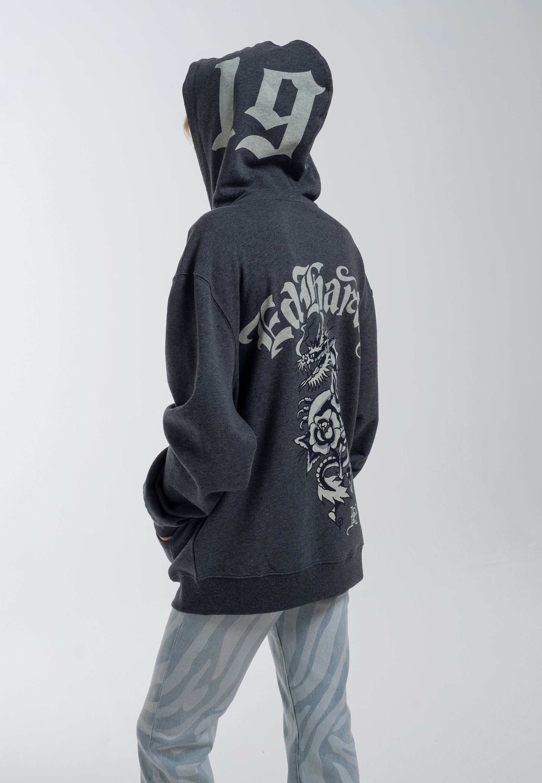 - Large Ed Hardy Signature-logo på tværs af ryggen og hætten