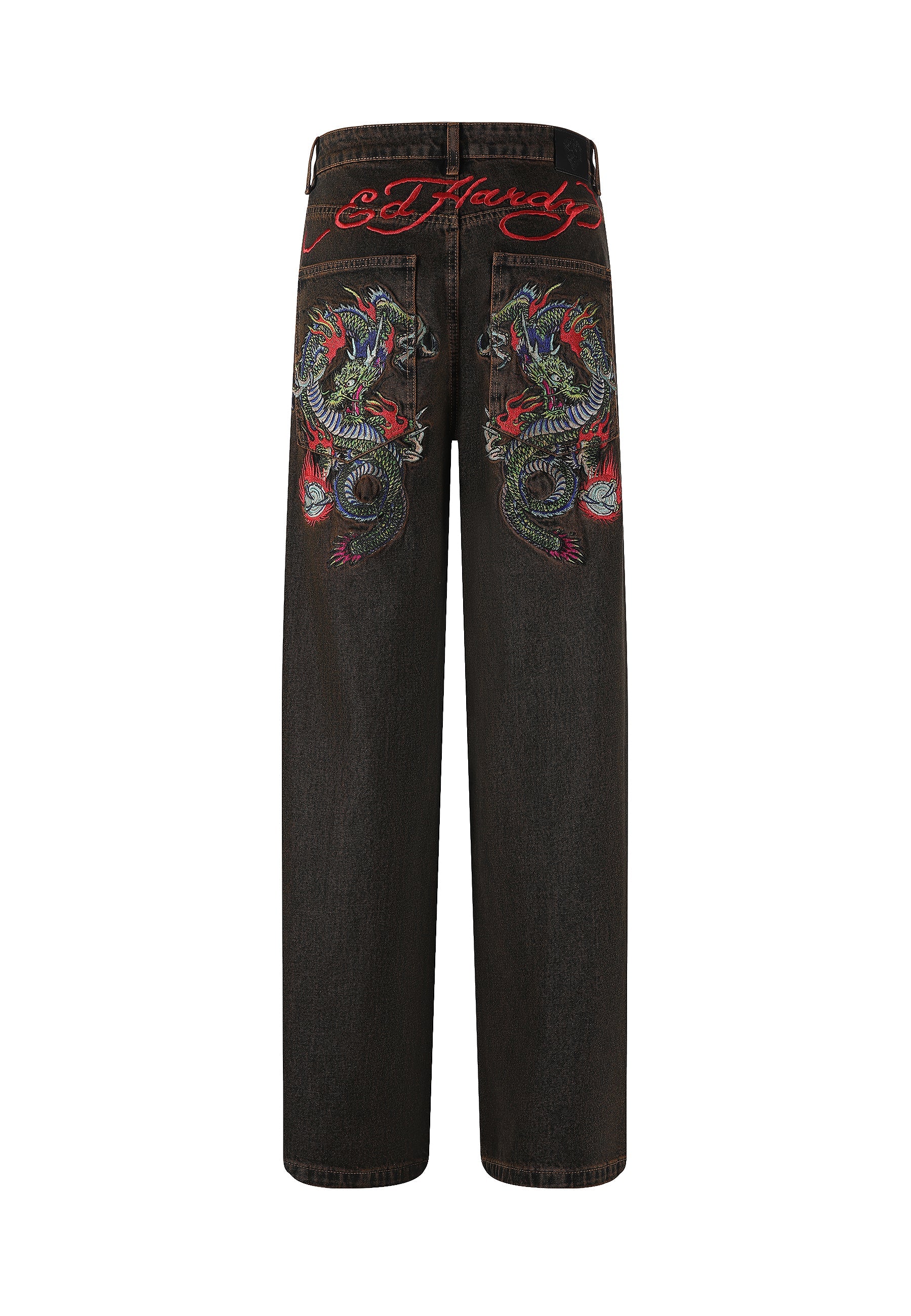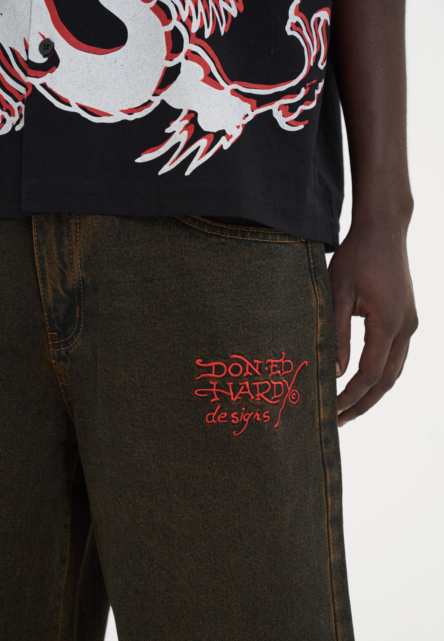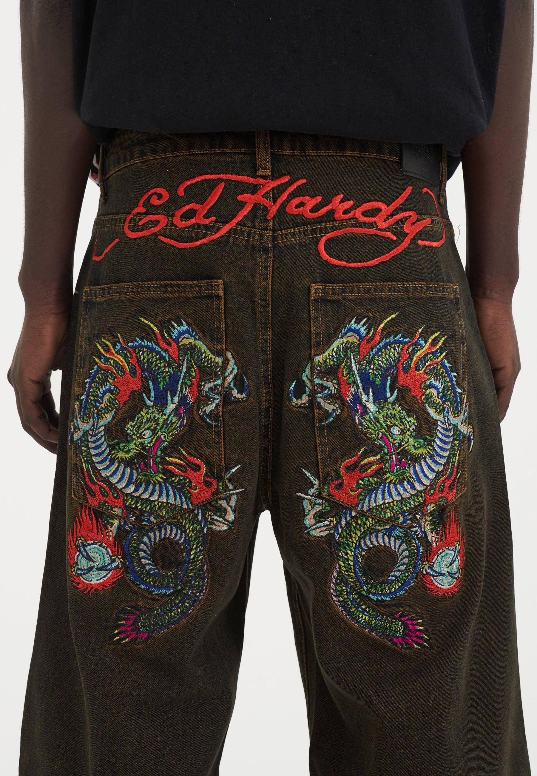 Eds innovative design fremviser et levende udbrud af indviklede fuldfarvede broderier, der skaber en dynamisk kontrast mod baggrunden af vores friske brunfarvede blegemiddelvask i Fireball Dragon Denim Jeans.