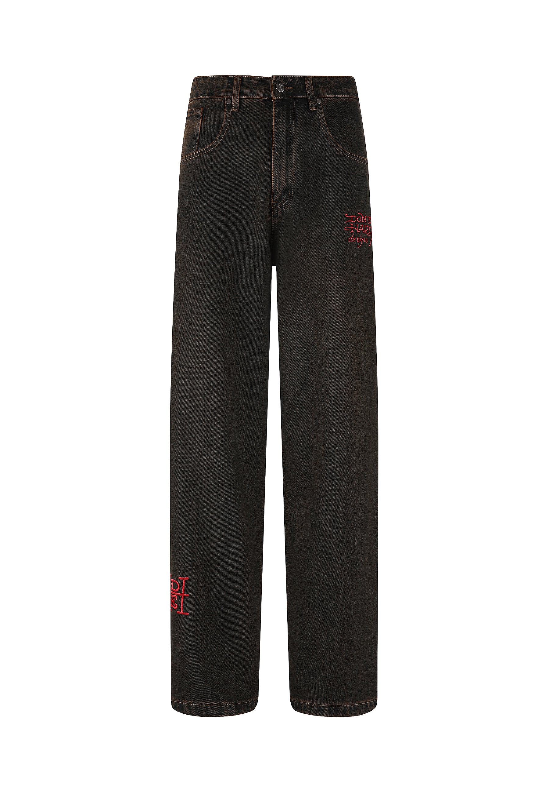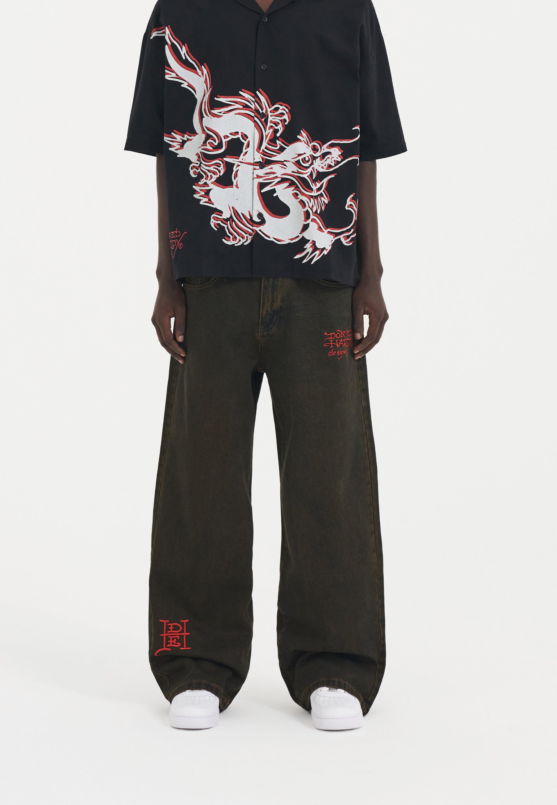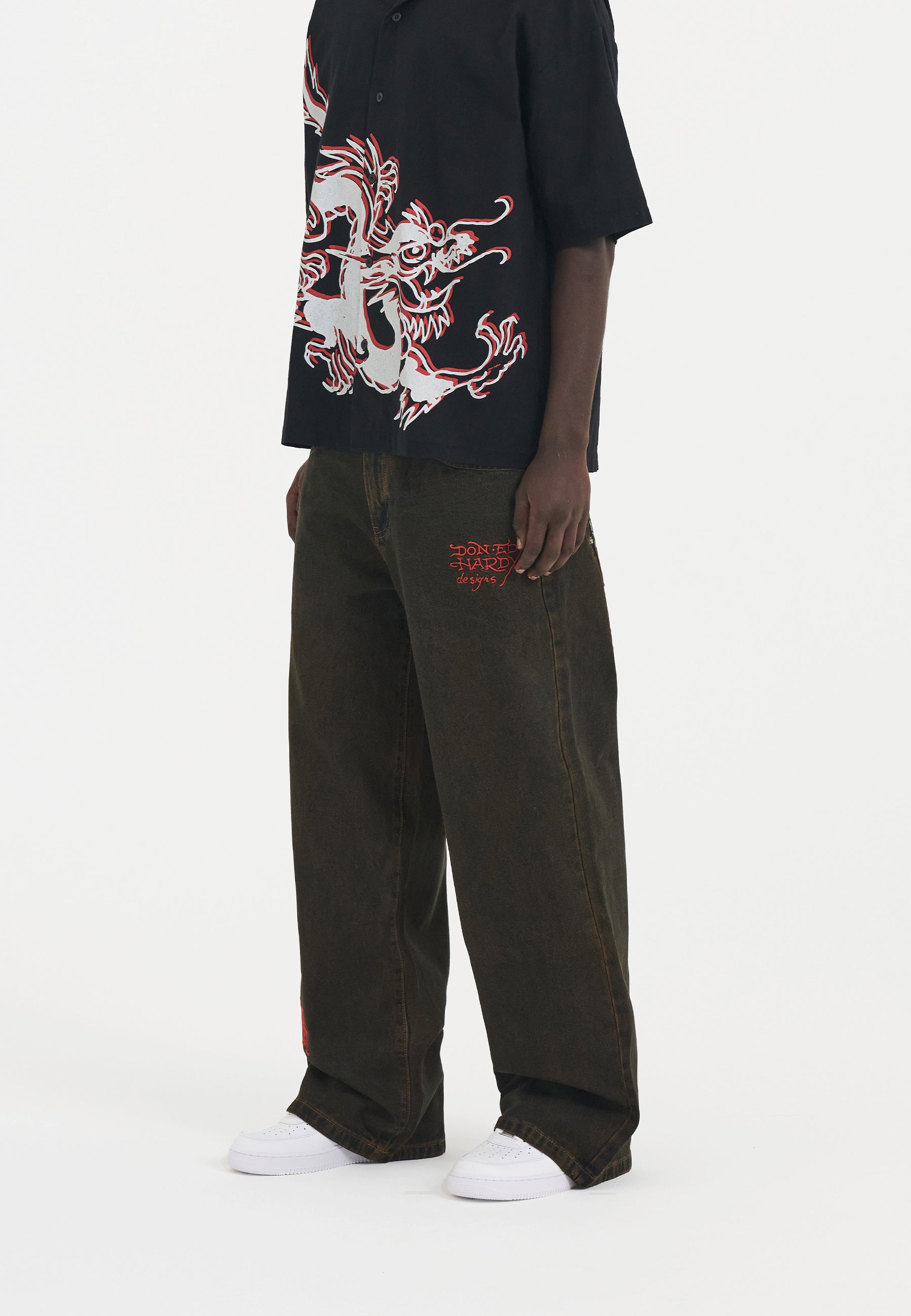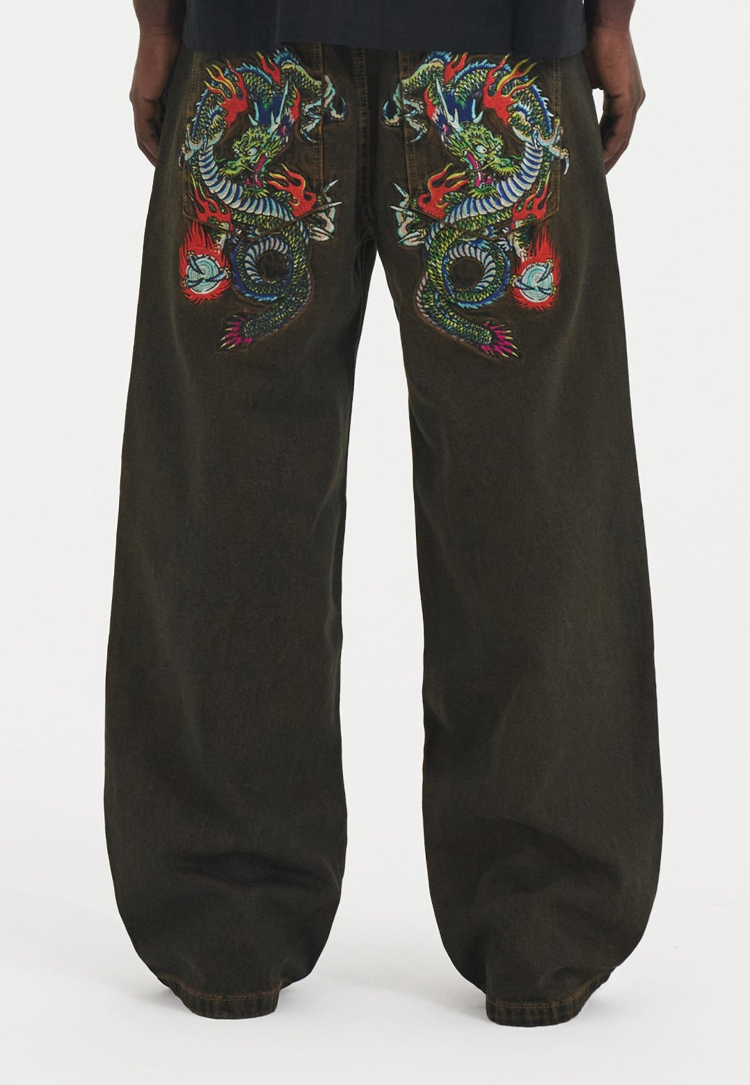 Eds innovative design fremviser et levende udbrud af indviklede fuldfarvede broderier, der skaber en dynamisk kontrast mod baggrunden af vores friske brunfarvede blegemiddelvask i Fireball Dragon Denim Jeans.