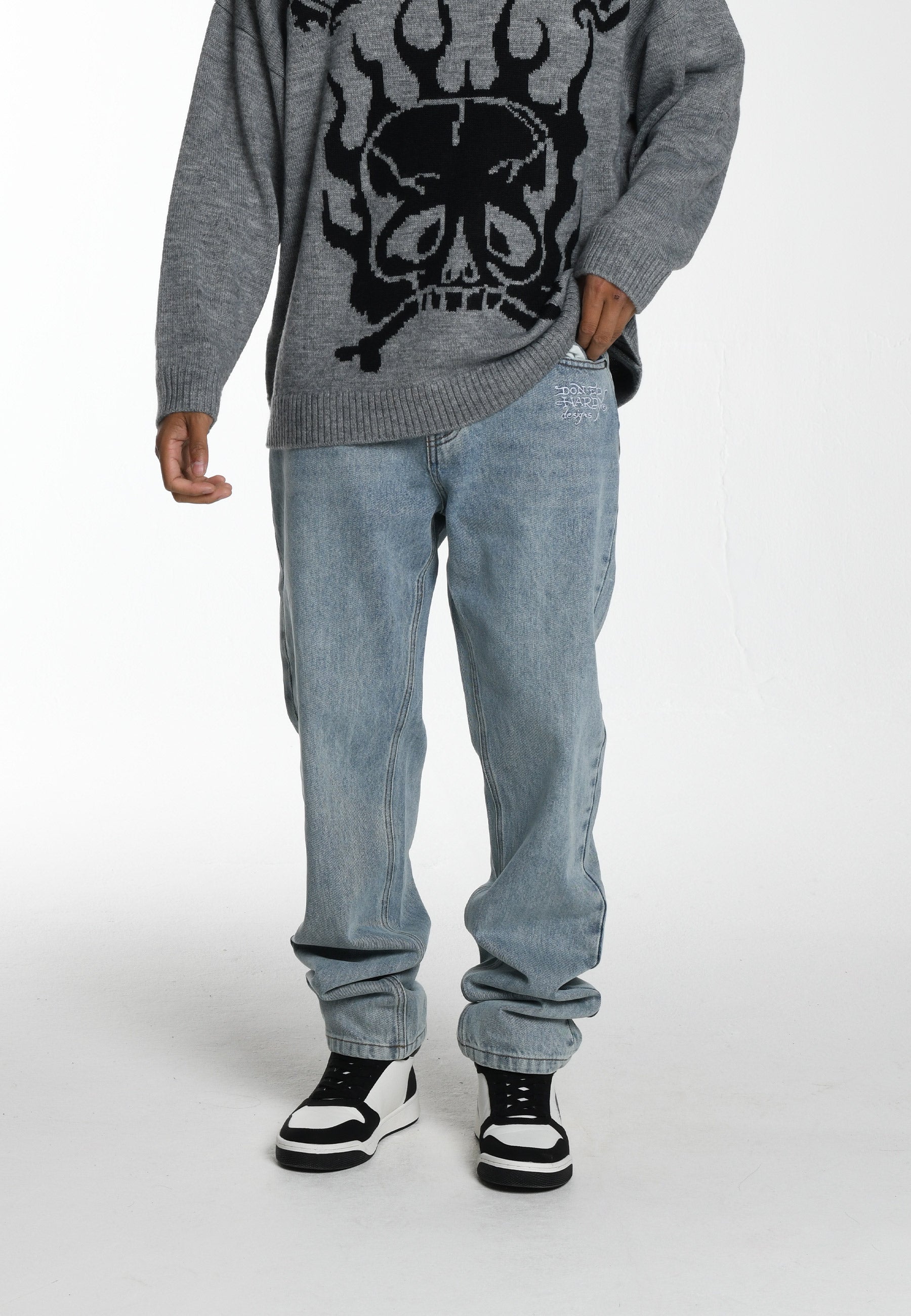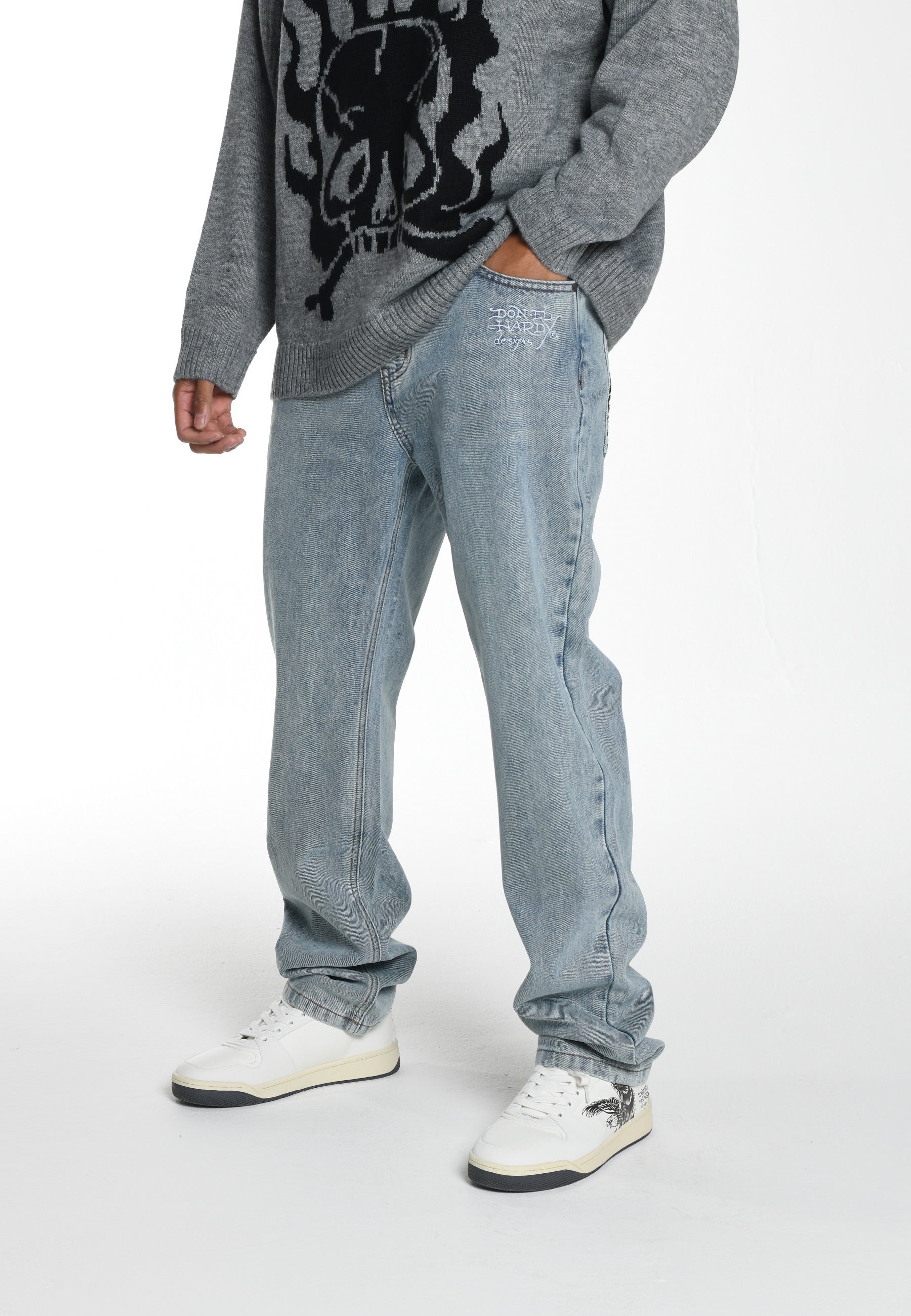 Med slående fuldfarvede broderede lommer og Ed Hardy-logoet på tværs af bæltelinjen. Fremstillet af 100 % Bleach-Wash bomuldsdenim.
