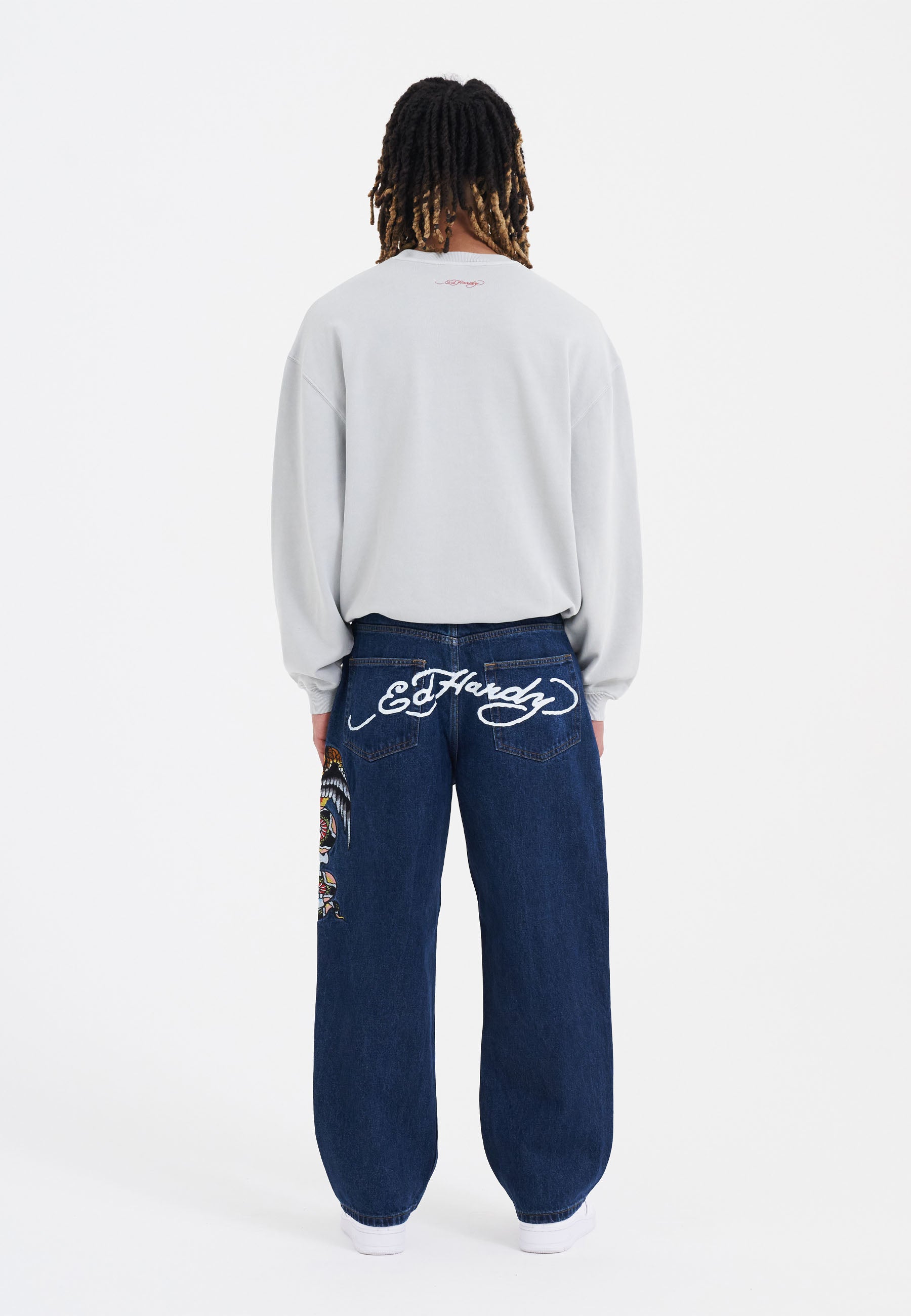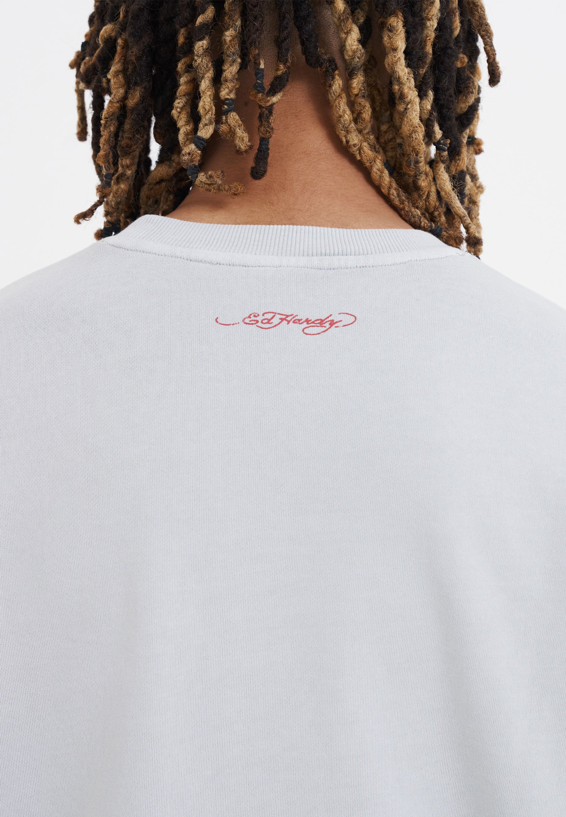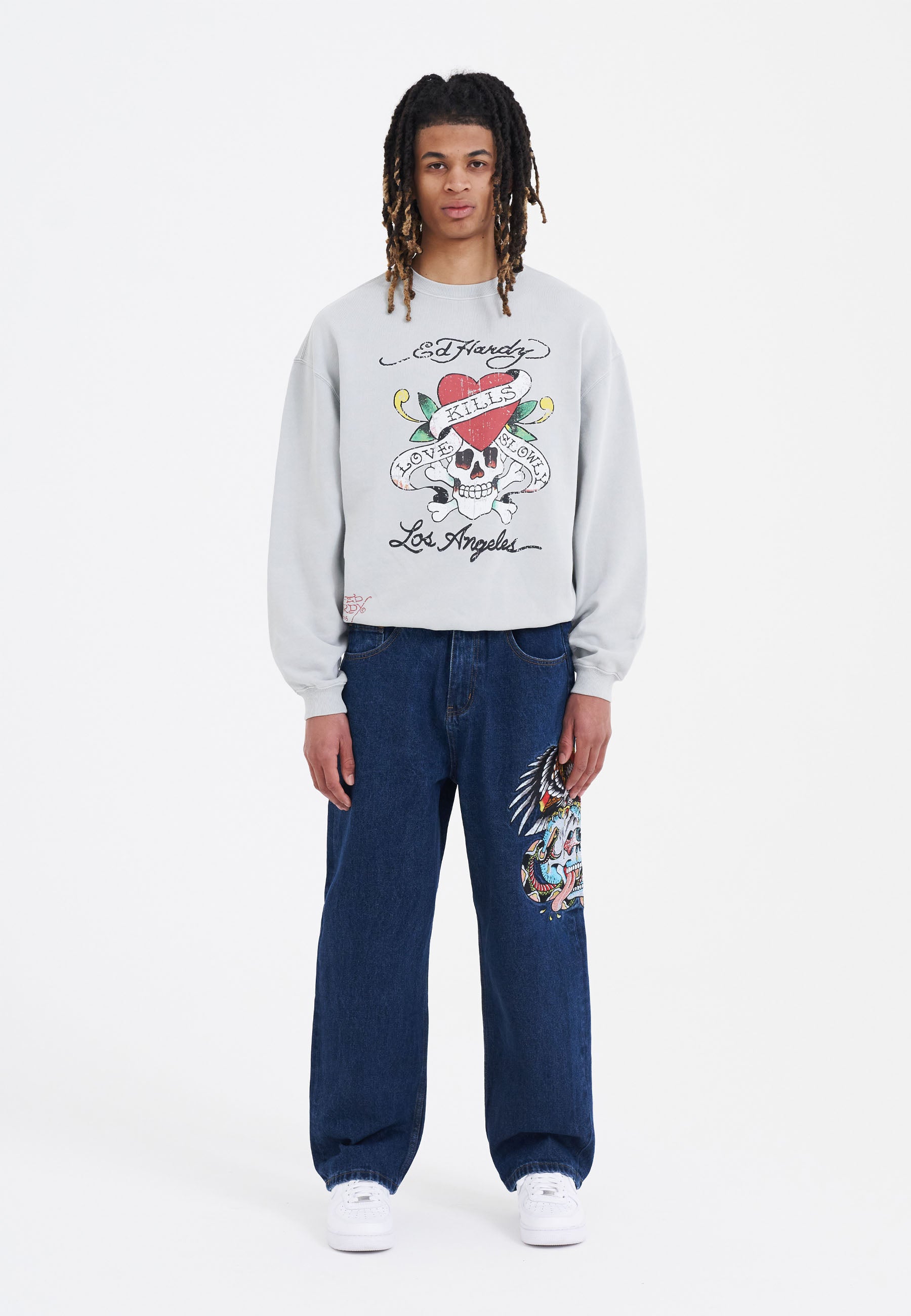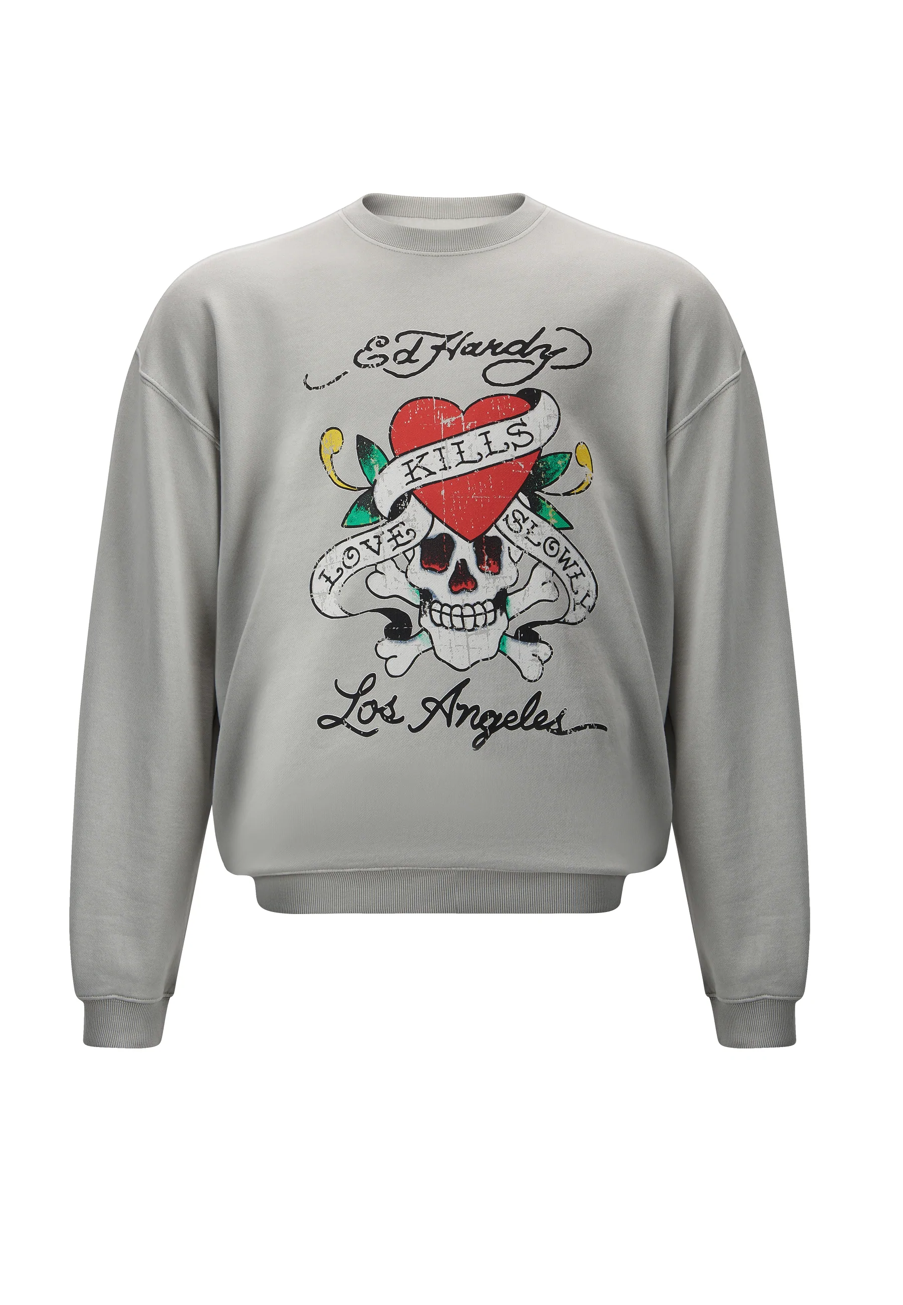 Denne sweaters vaskede grå bundfarve, crimson Ed Hardy-signatur øverst på brystet og strålende detaljerede, distressed "LOVE KILLS SOWLY" hvide og røde kranium med hjertetatoveringsdesign gør den til en edgy Ed Hardy klassisk.