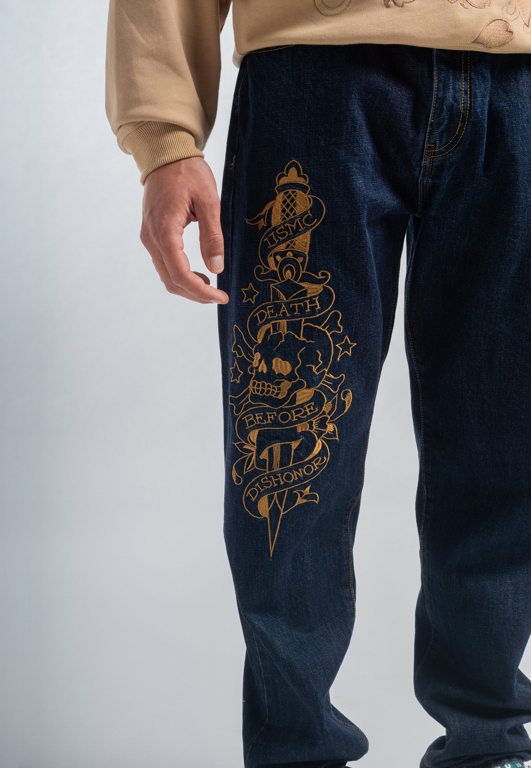 Herre Mono-Skull Tattoo Denim Bukser Jeans - Indigo
