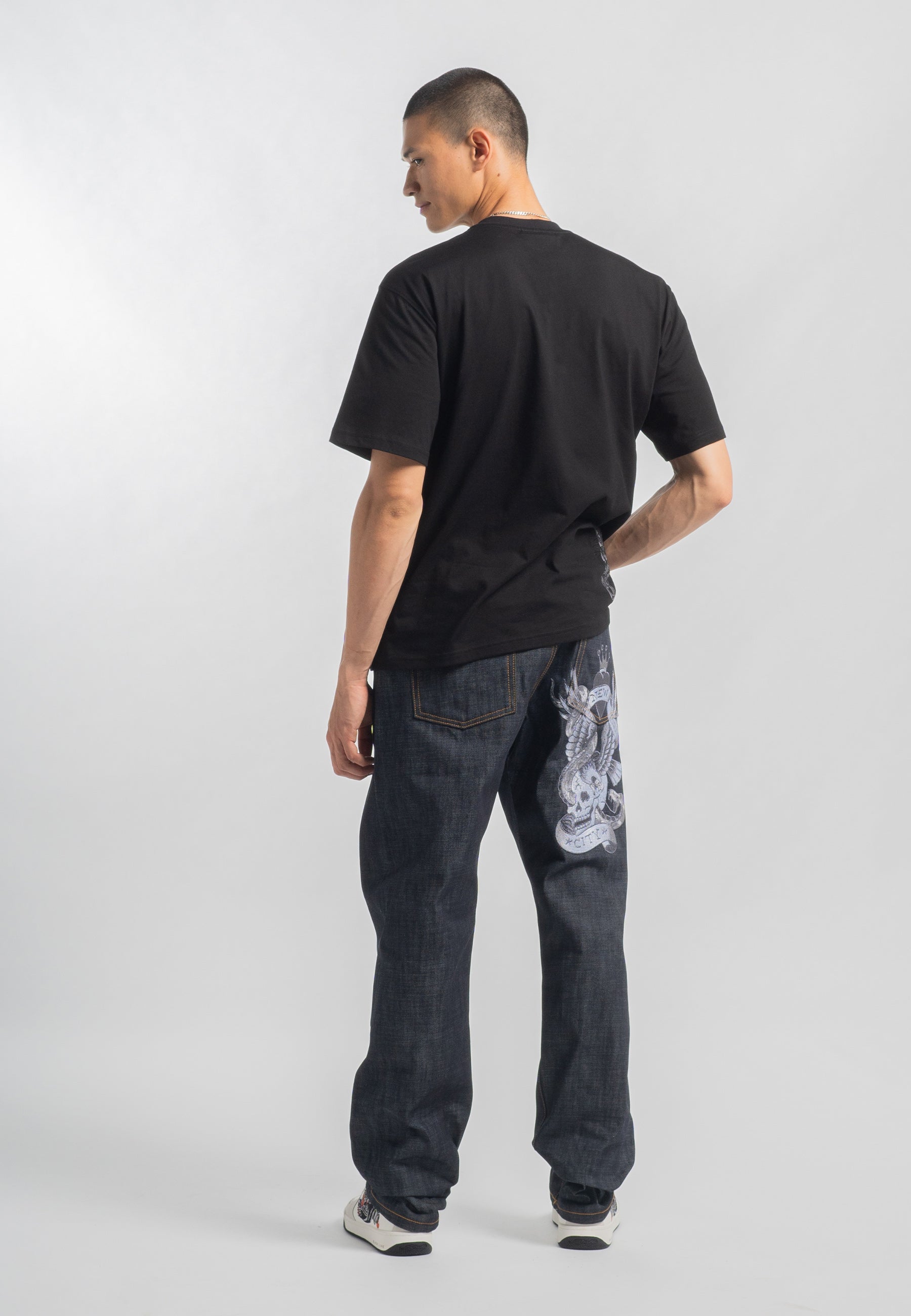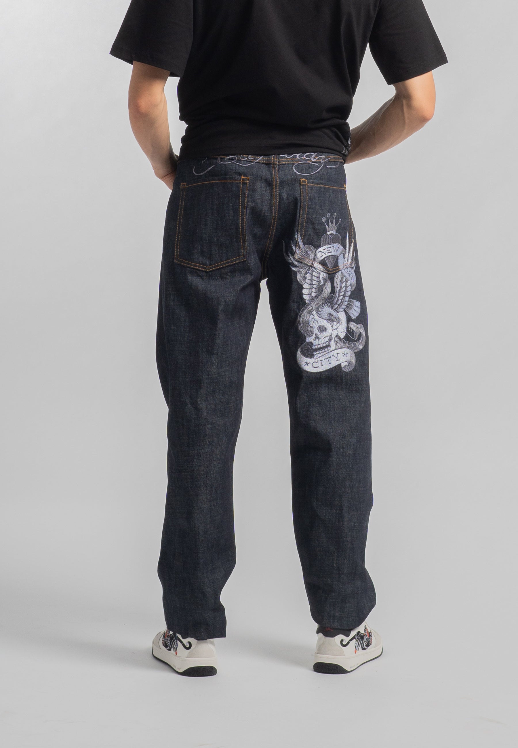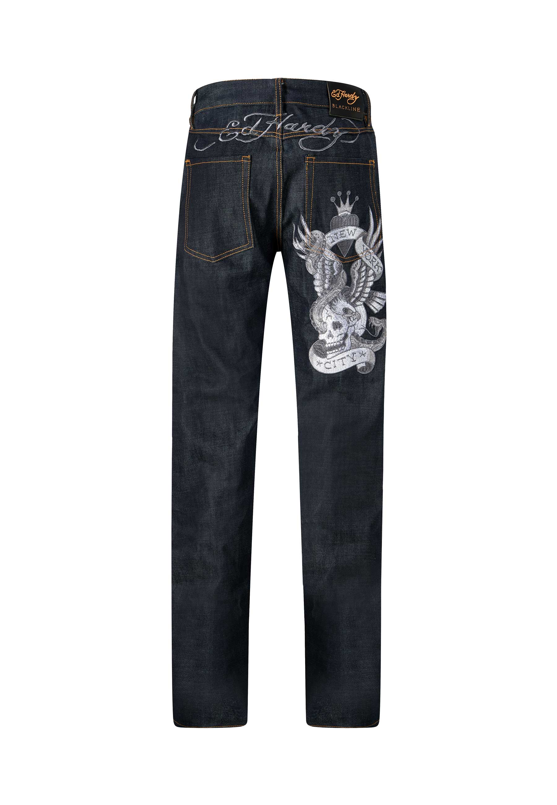 Forøg dit denimspil med Skull & Dagger Jeans til mænd. Disse premium Selvedge-denimjeans, prydet med vintage-inspireret tonalt broderi af kraniet og dolken, fanger essensen af Ed Hardys tidløse designs.