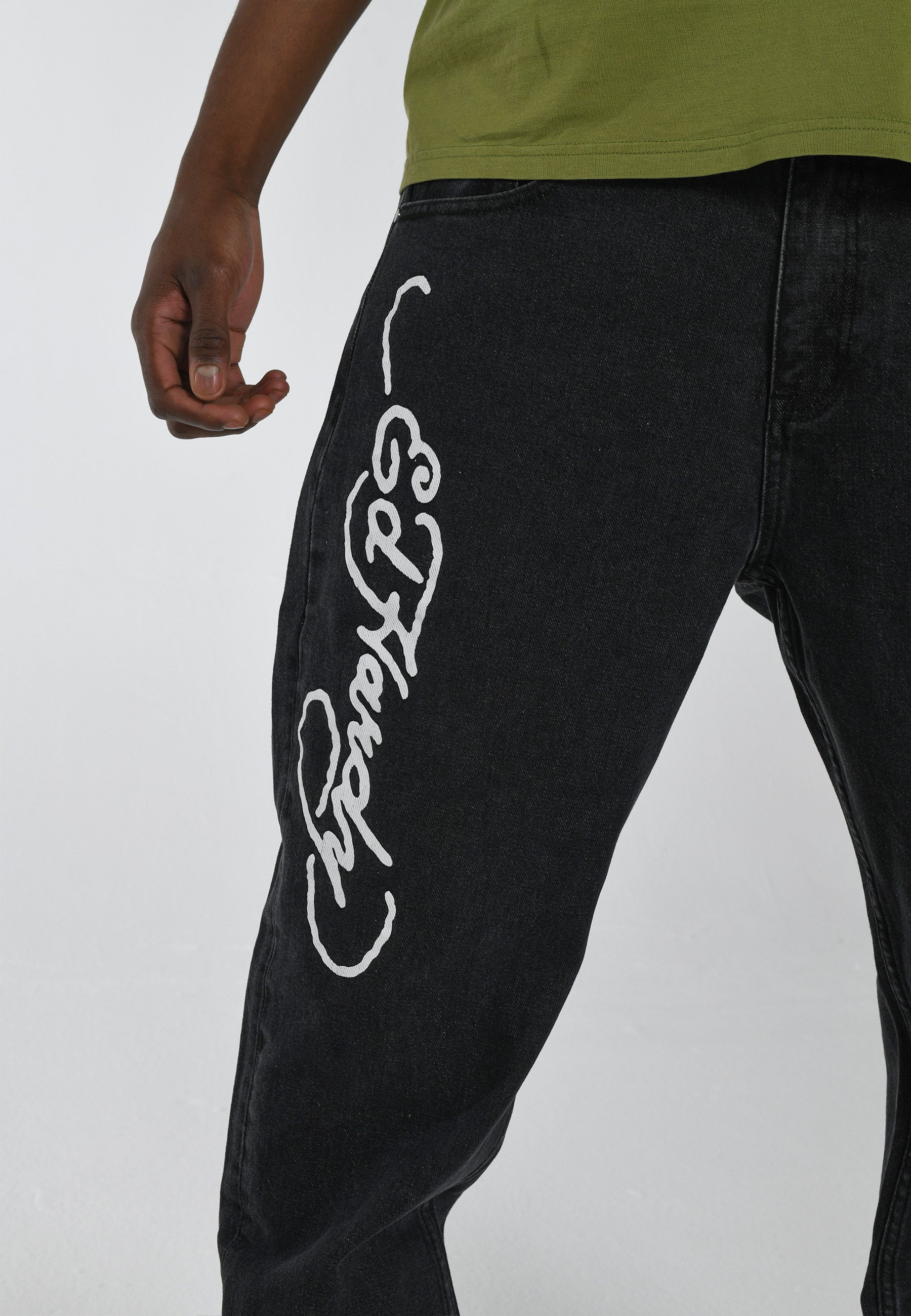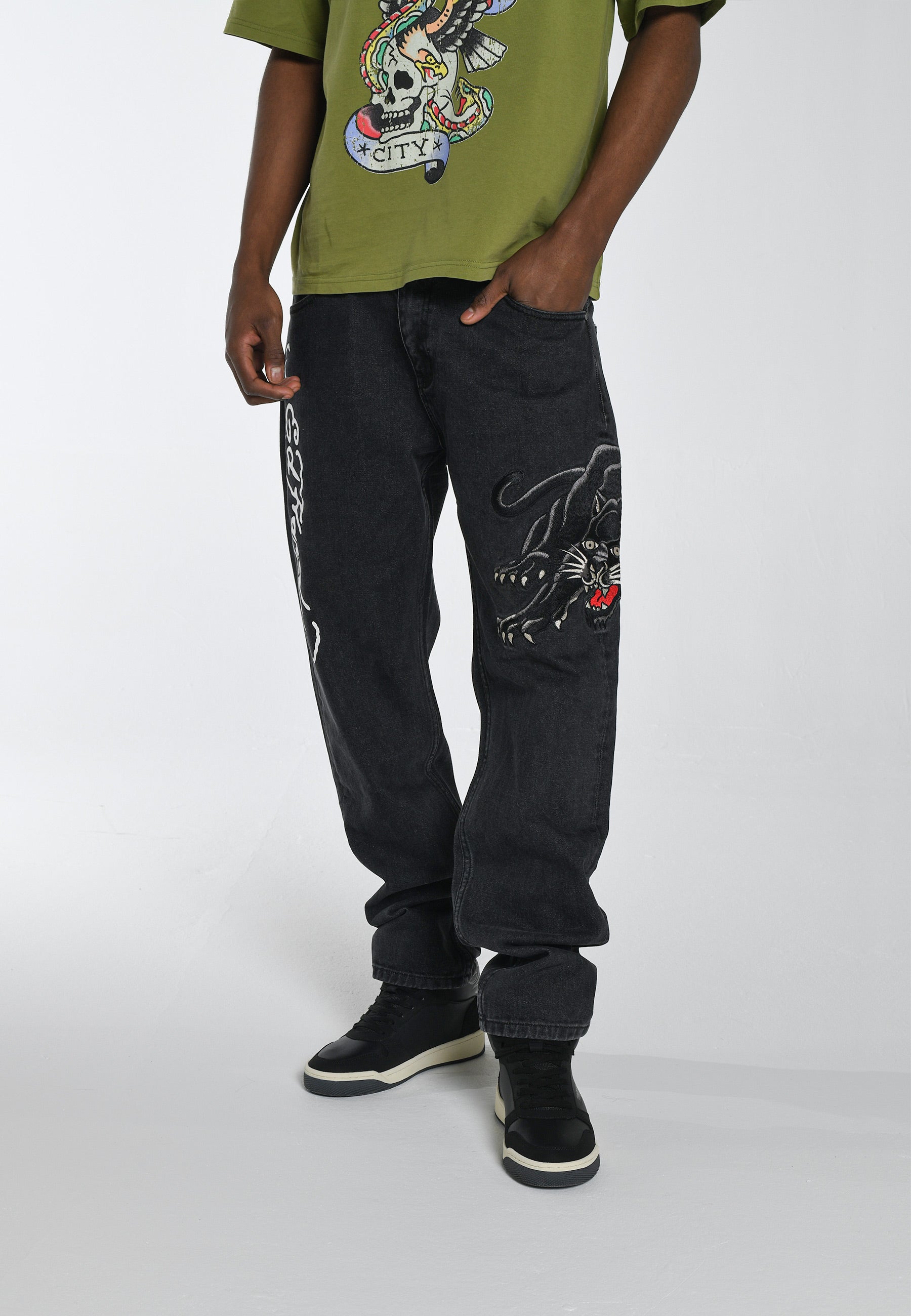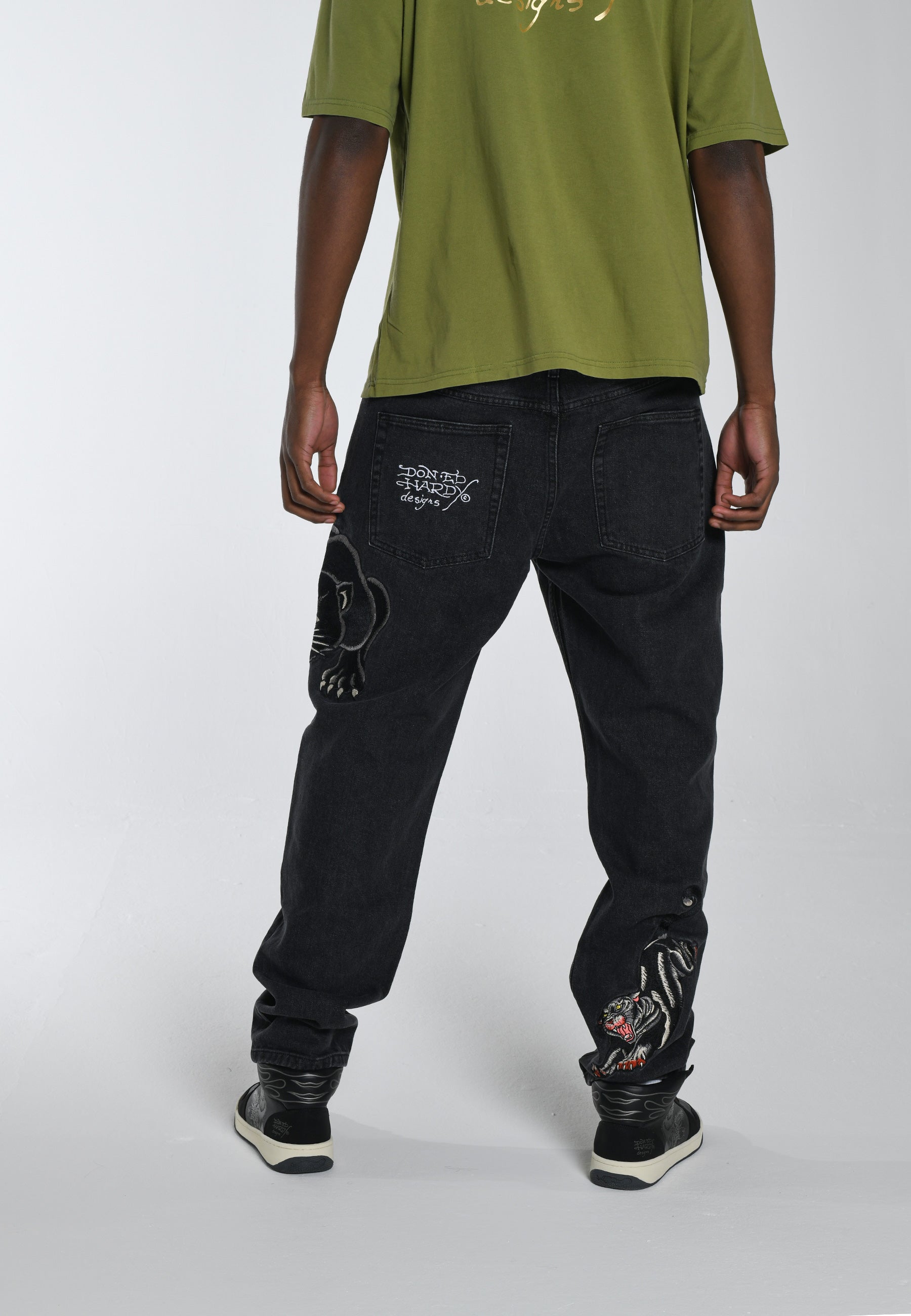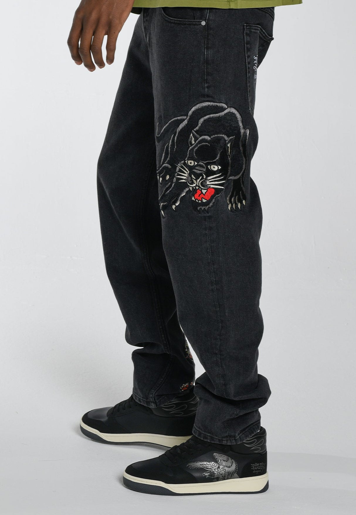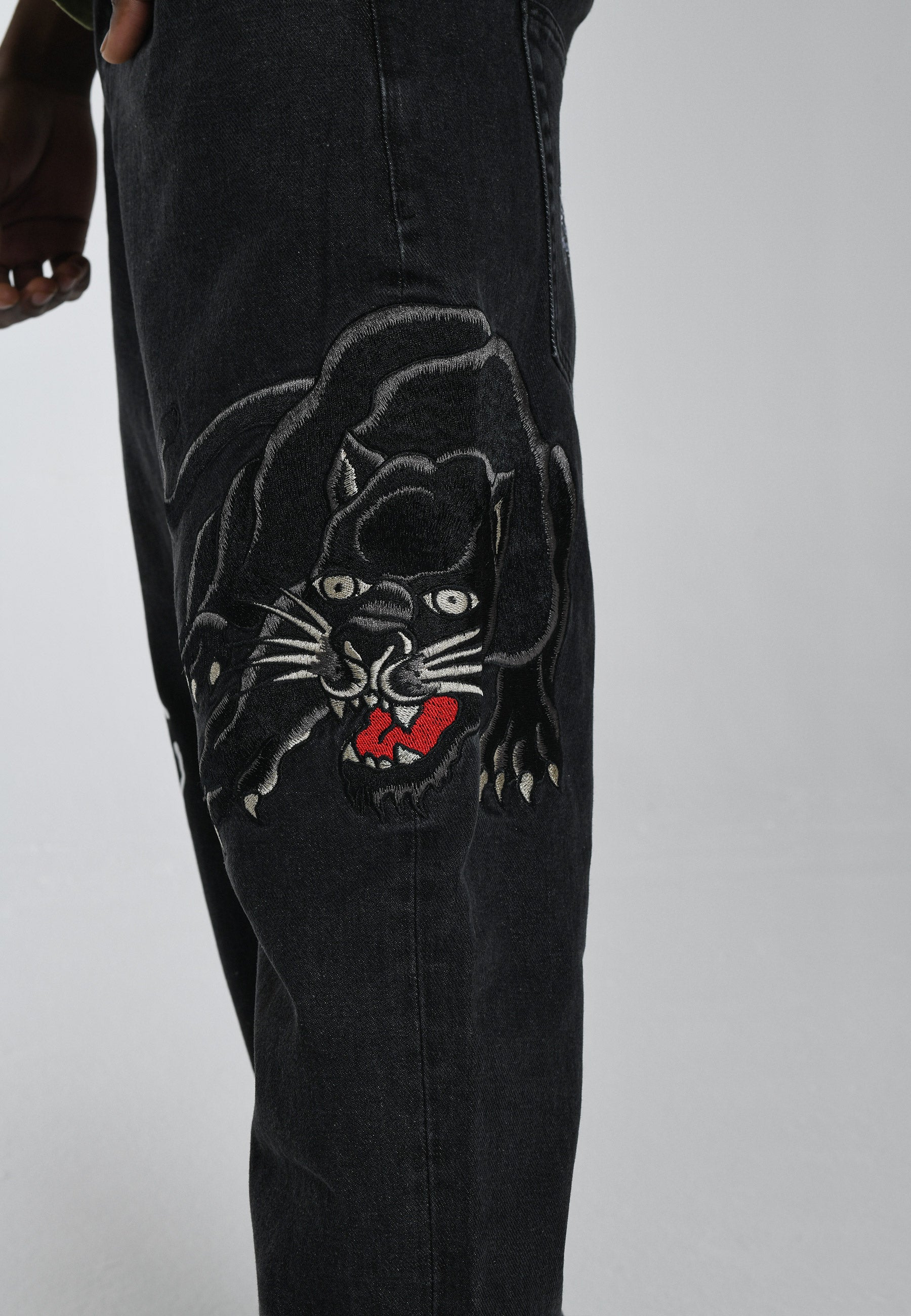 Herre Panther-Crouch-Leap Tattoo Grafisk Relaxed Denim Bukser Jeans - Sort