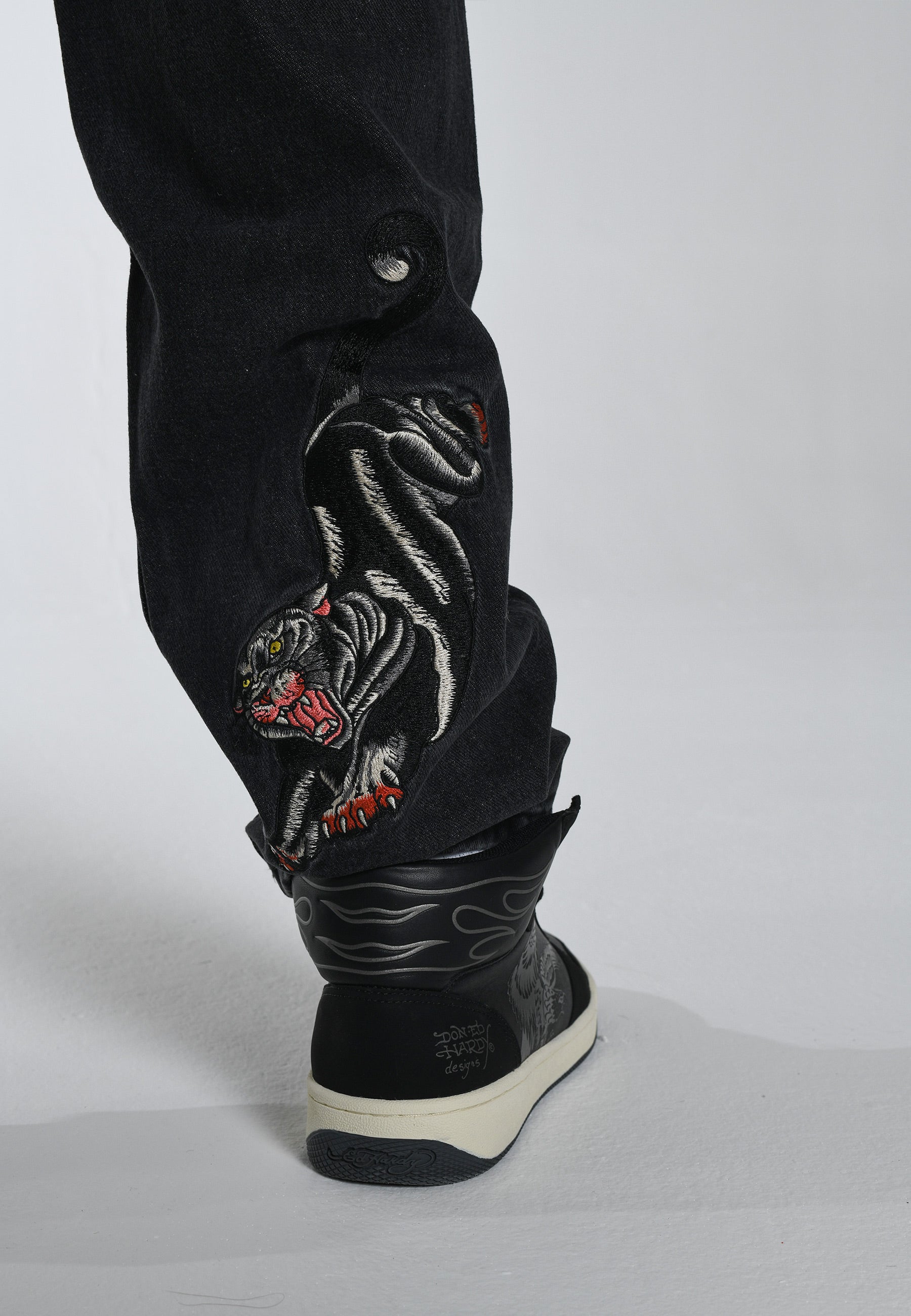 Skyndigt udformet af 100 % bomuldsdenim af høj kvalitet, de Crouching Panther Jeans fremviser tatoveringsinspirerede sorte pantere med rubin-accenter, indviklet broderet i hele jean-benene.