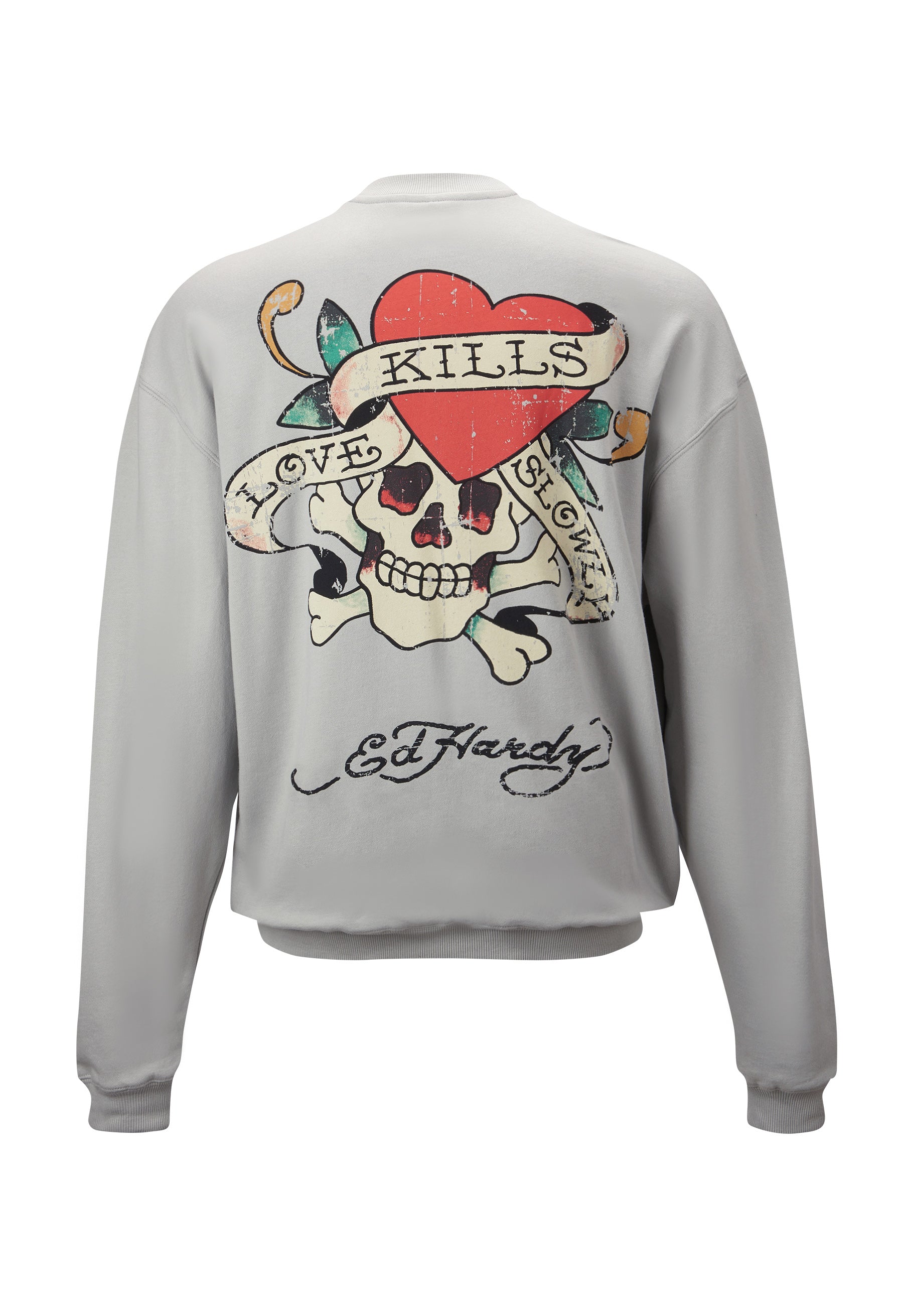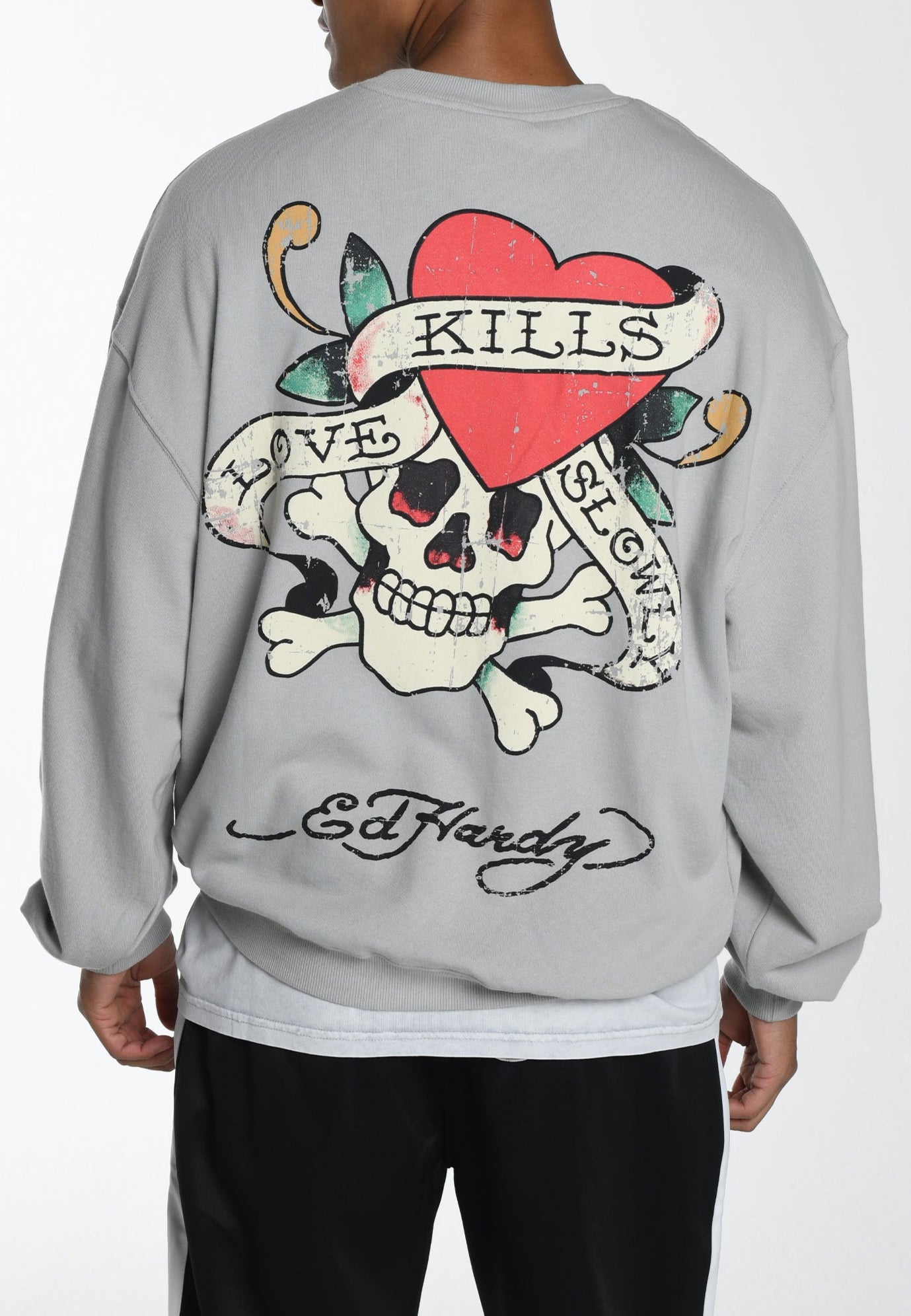 Vi præsenterer Slow Love Crew Neck Jumper, en tungvægtsvasket kulbomuldssweat, prydet med den varige 'Love Kills Slowly' fuldfarve grafik og diskret Ed Hardy monogram på bagsiden. Genfortolke/rekonstruere hverdagen.