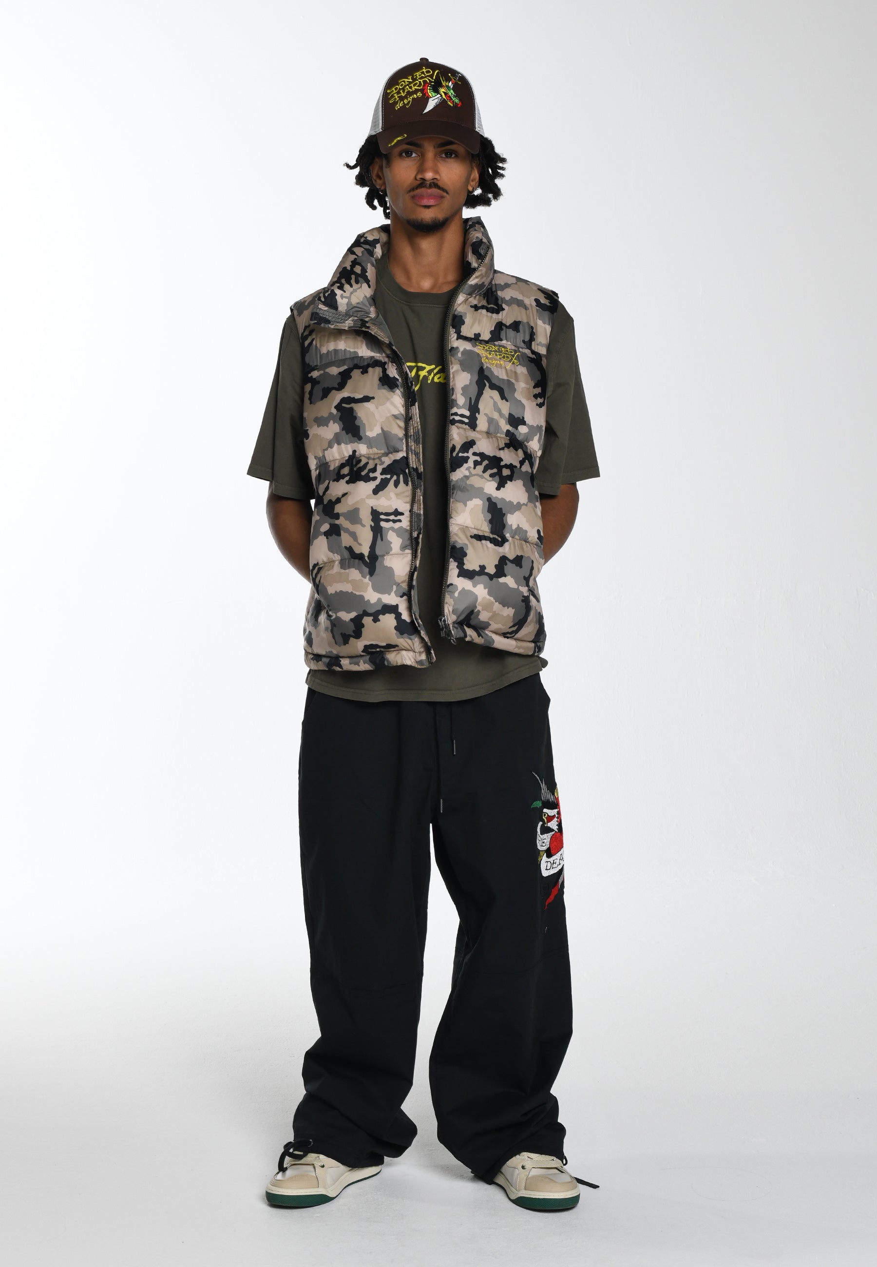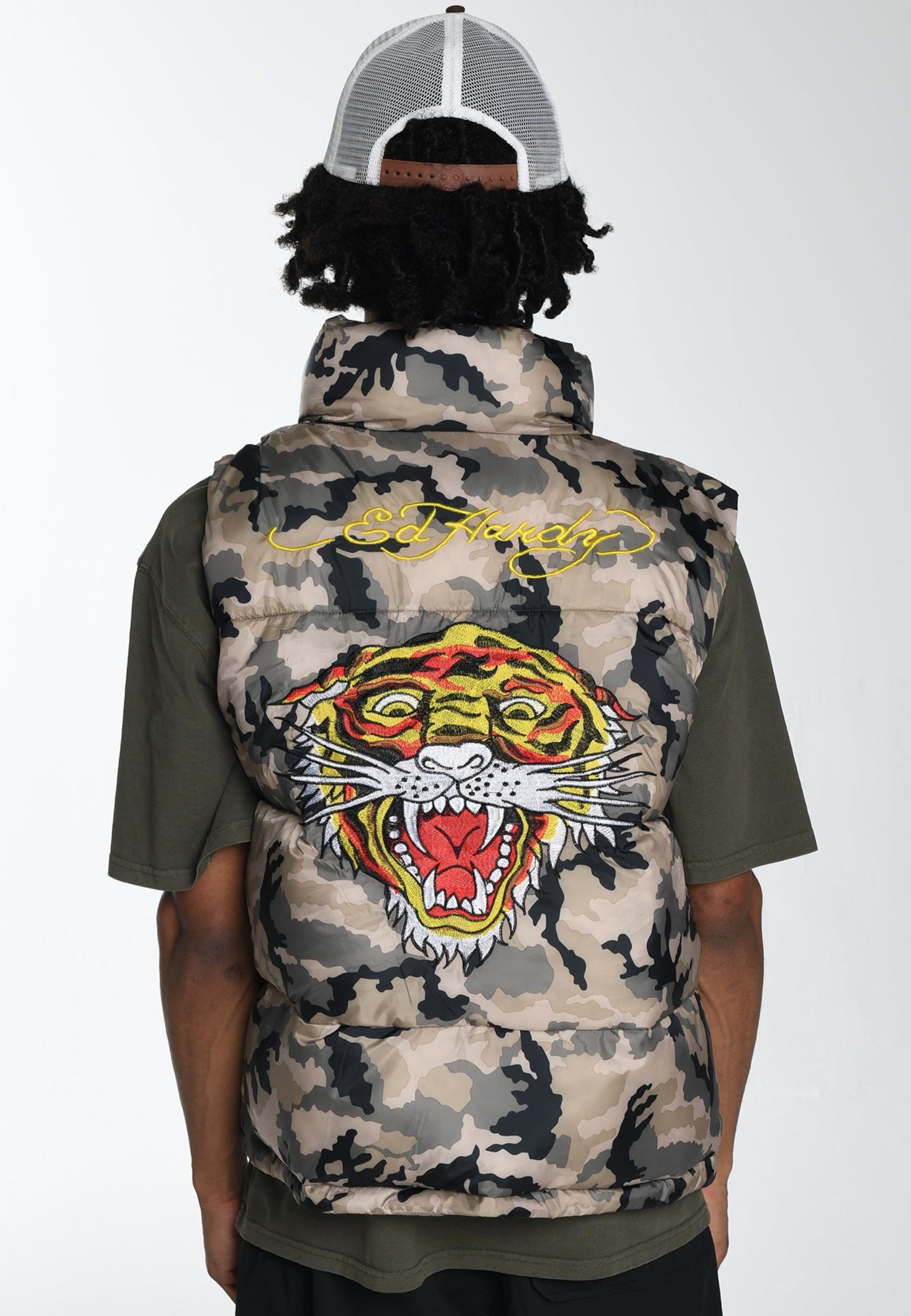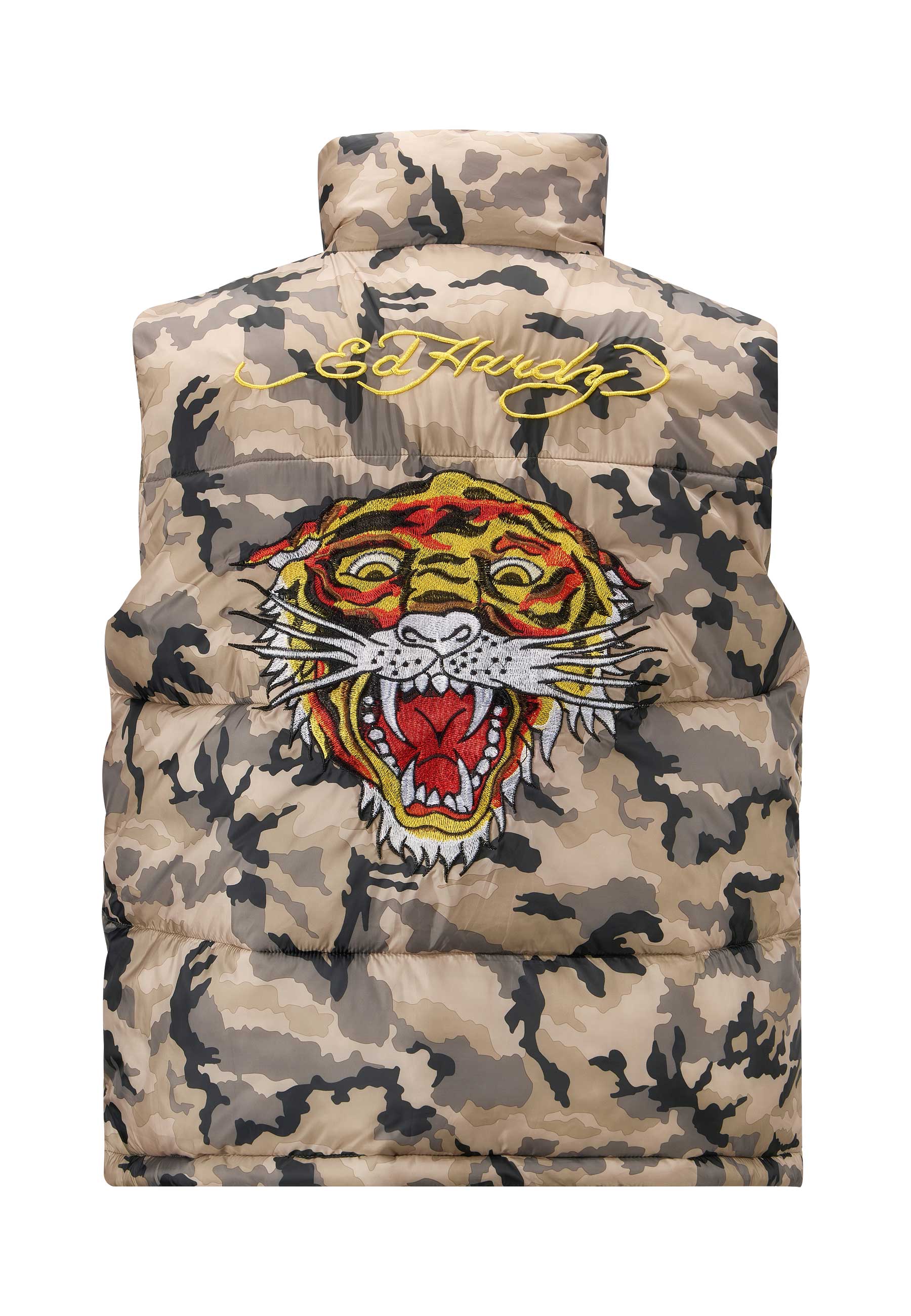 Tiger Head Gillet Puffer Jacket er en vigtig ny sæson, og tilbyder overlegen komfort i 100 % nylon med fuldfarve, slående broderet grafik på ryggen og et subtilt Ed Hardy-monogram på brystet.
